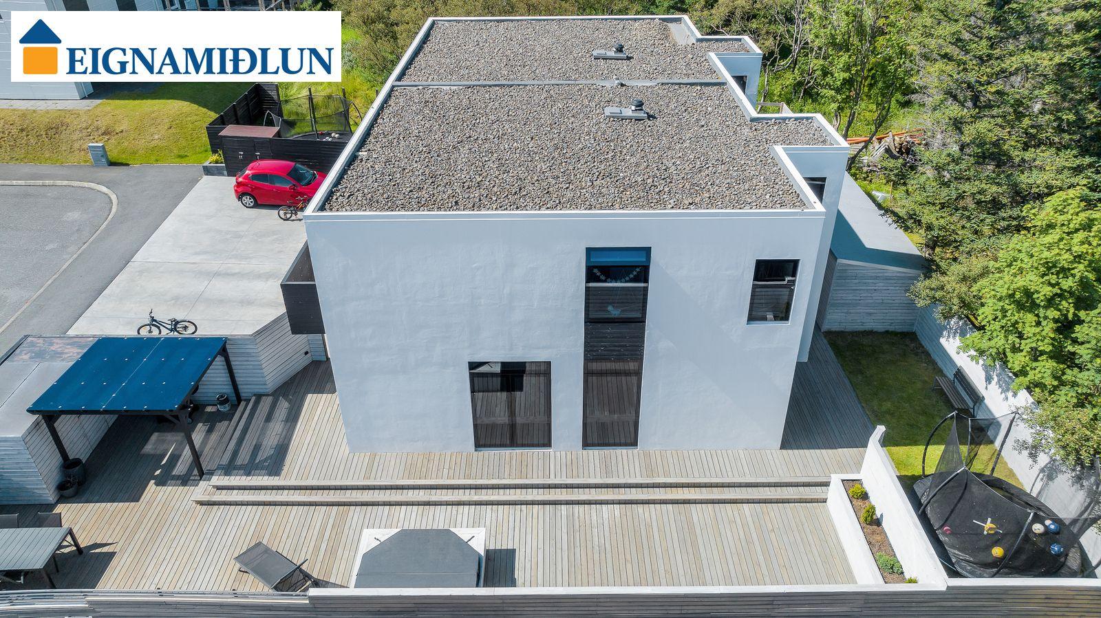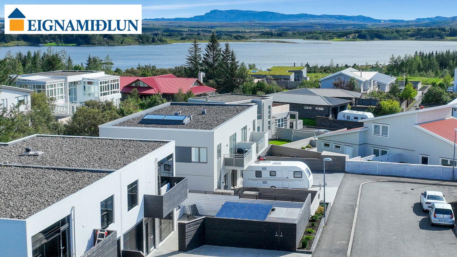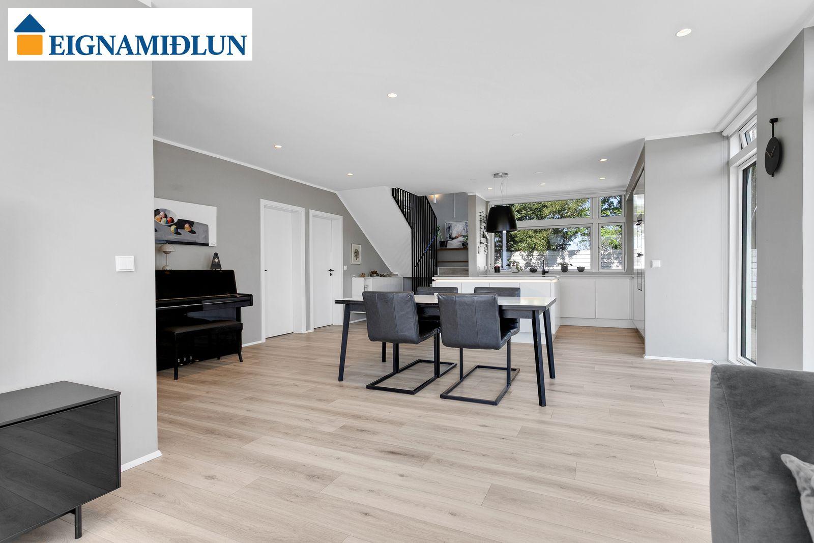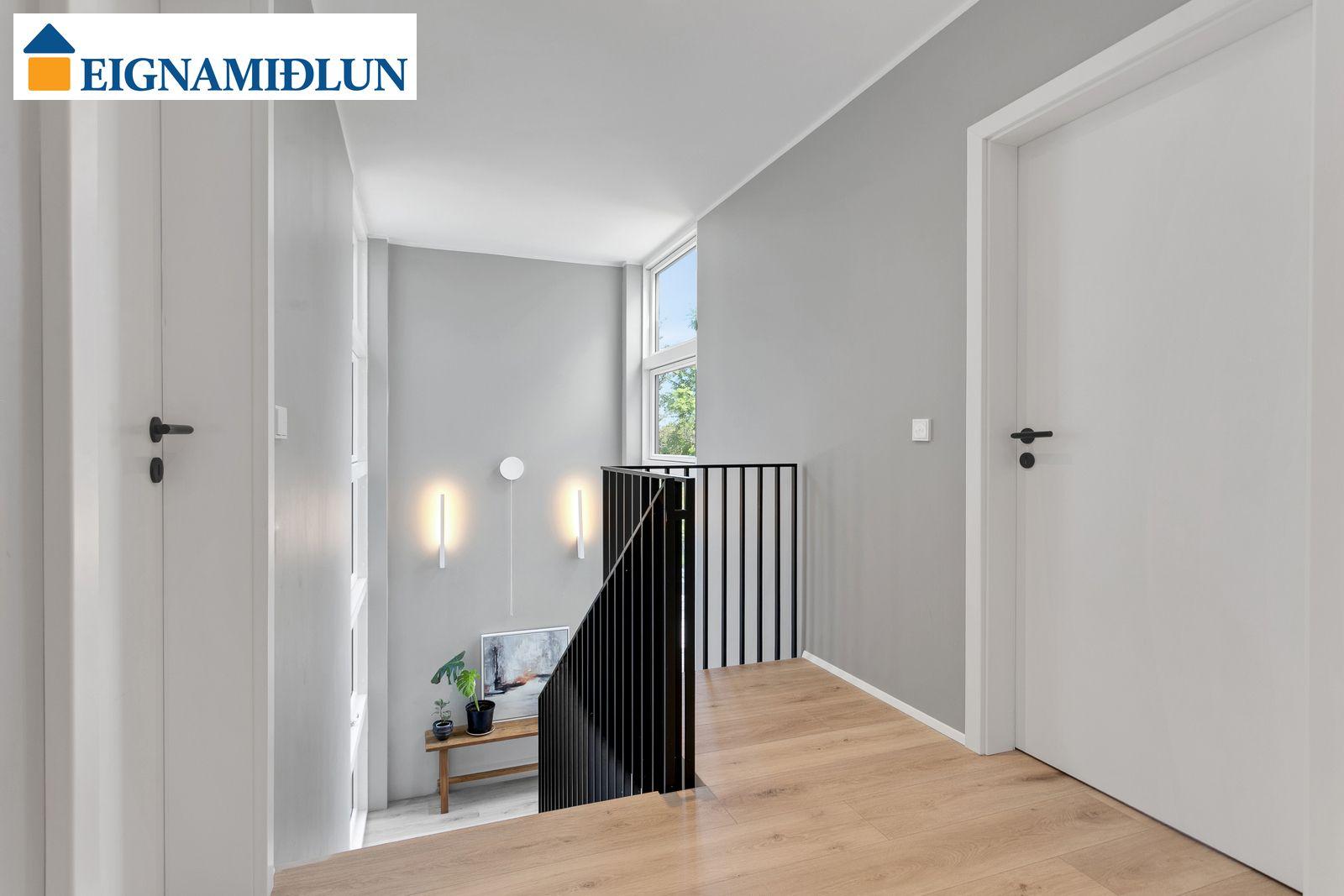 Fallegt og vel skipulagt 181m² parhús á tveimur hæðum. Fimm svefnherbergi, stór timburpallur með heitum potti. Steypt upphitað bílaplan þar sem pláss er fyrir tvo bíla, þriggja fasa rafhleðslustöð. Örstutt er í alla þjónustu, skóla, leikskóla og frábærar gönguleiðir allt í kring. Góð eign á þessum eftirsótta og fallega stað.Samkvæmt skráningu HMS er birt flatarmál eignarinnar 181m², flatarmál íbúðarrýmis er 163,3m² og flatarmál bílskúrs er 17,7m². Fyrirhugað fasteignamat 2026 kr. 148.750.000.