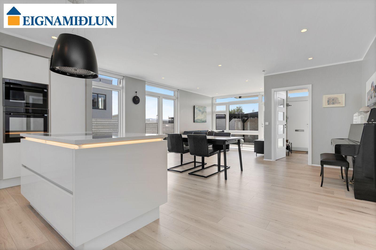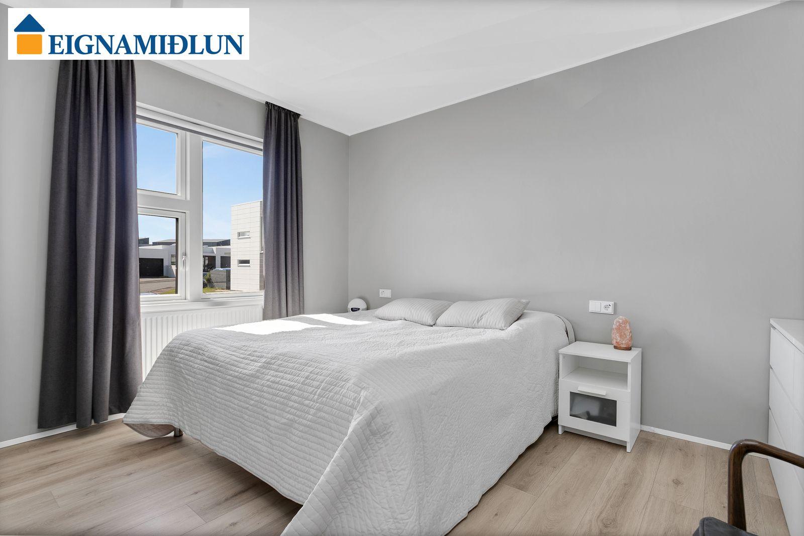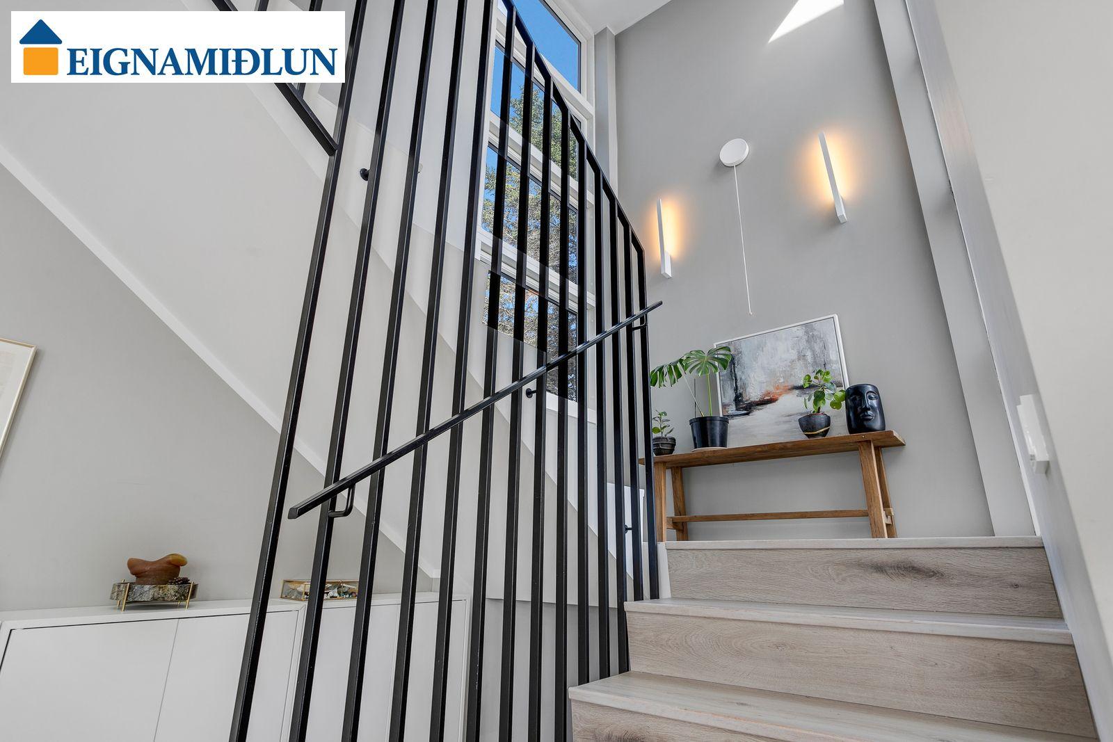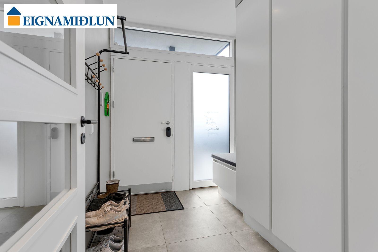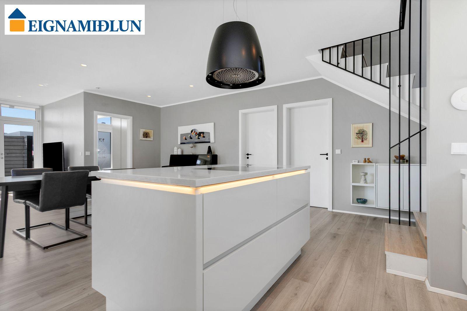 Fallegt og vel skipulagt 181m² parhús á tveimur hæðum. Fimm svefnherbergi, stór timburpallur með heitum potti. Steypt upphitað bílaplan þar sem pláss er fyrir tvo bíla, þriggja fasa rafhleðslustöð. Örstutt er í alla þjónustu, skóla, leikskóla og frábærar gönguleiðir allt í kring. Góð eign á þessum eftirsótta og fallega stað.Samkvæmt skráningu HMS er birt flatarmál eignarinnar 181m², flatarmál íbúðarrýmis er 163,3m² og flatarmál bílskúrs er 17,7m². Fyrirhugað fasteignamat 2026 kr. 148.750.000.