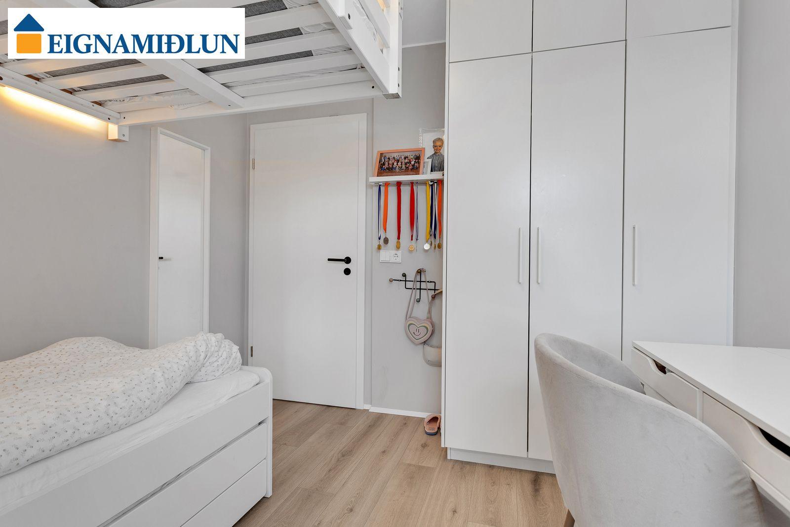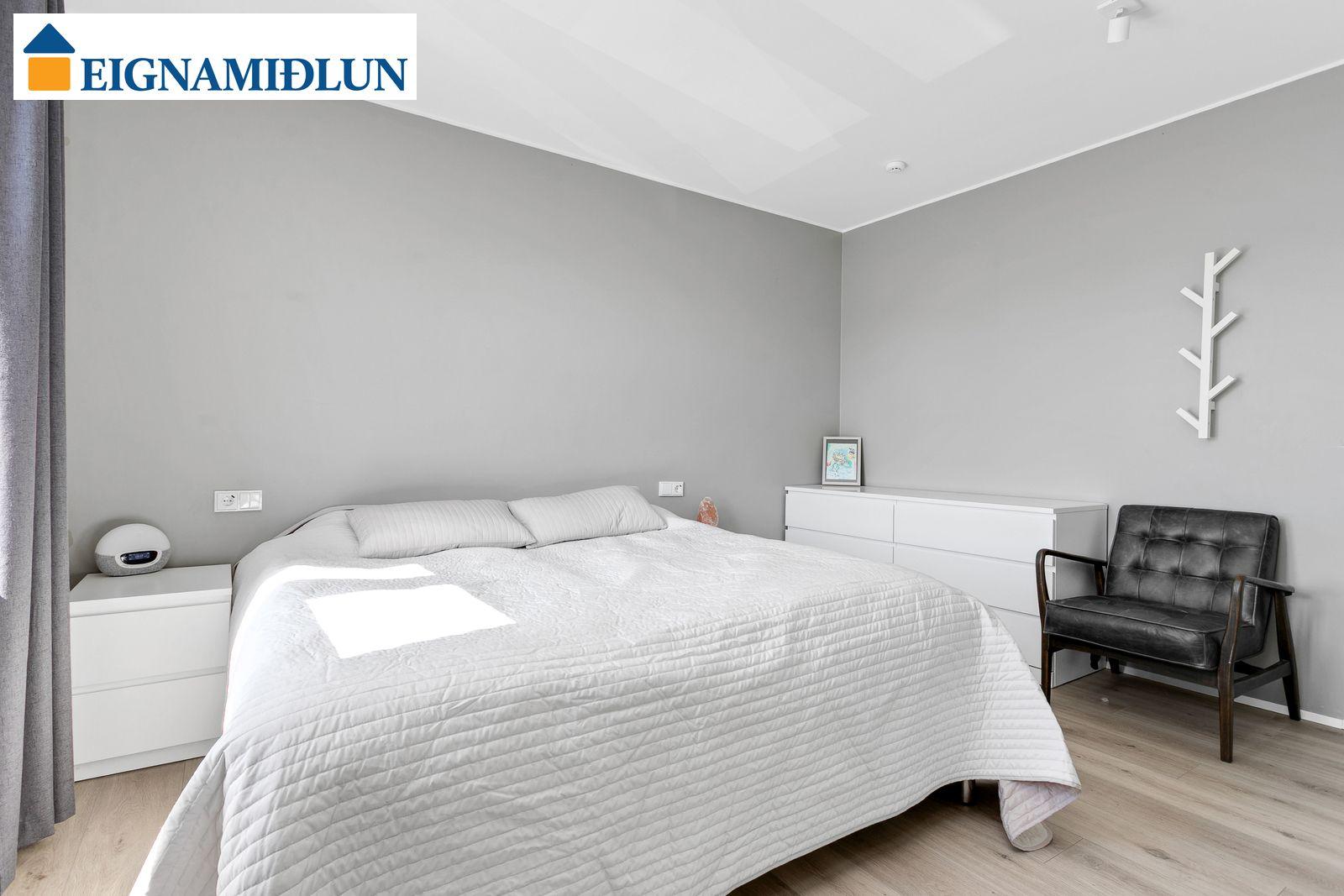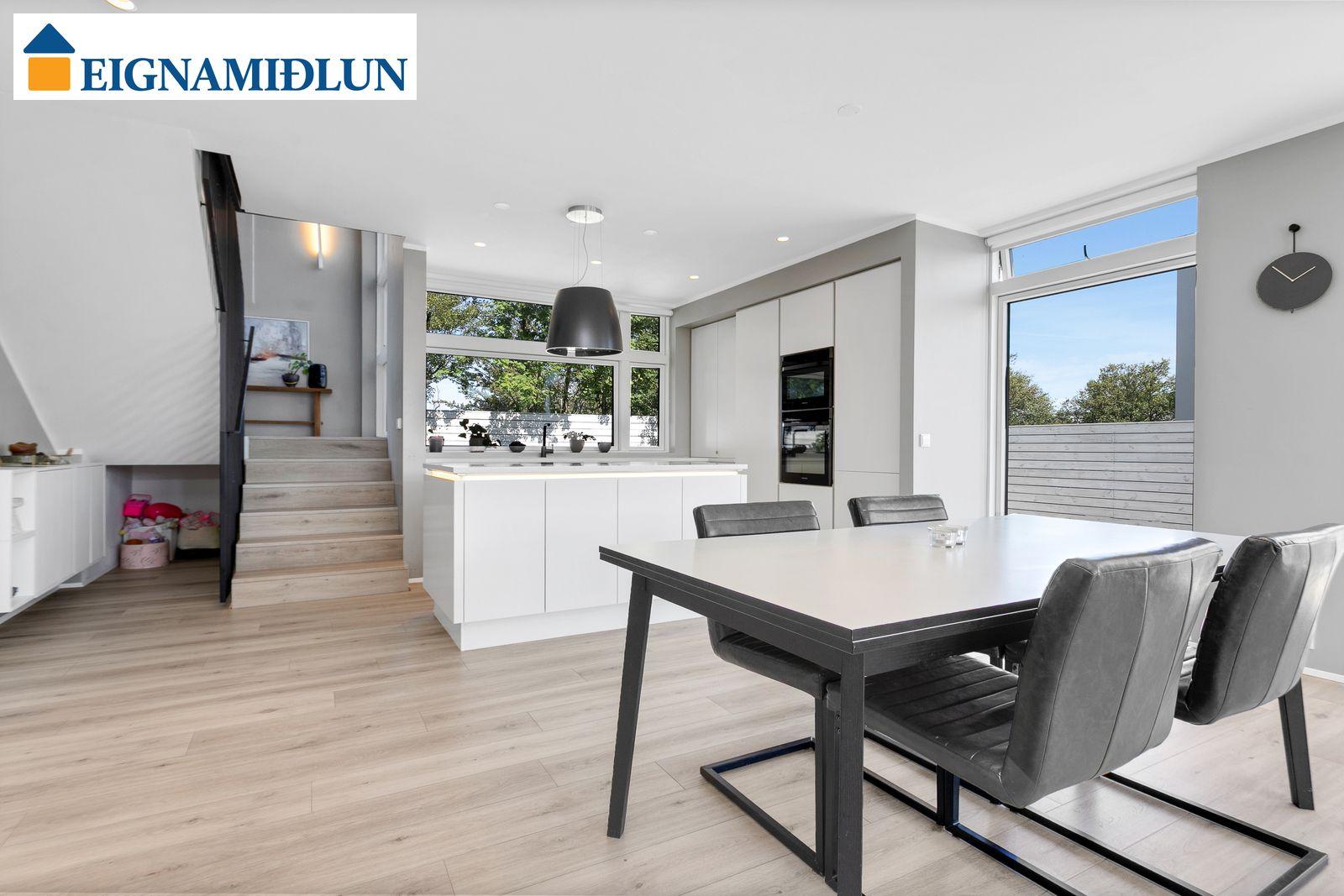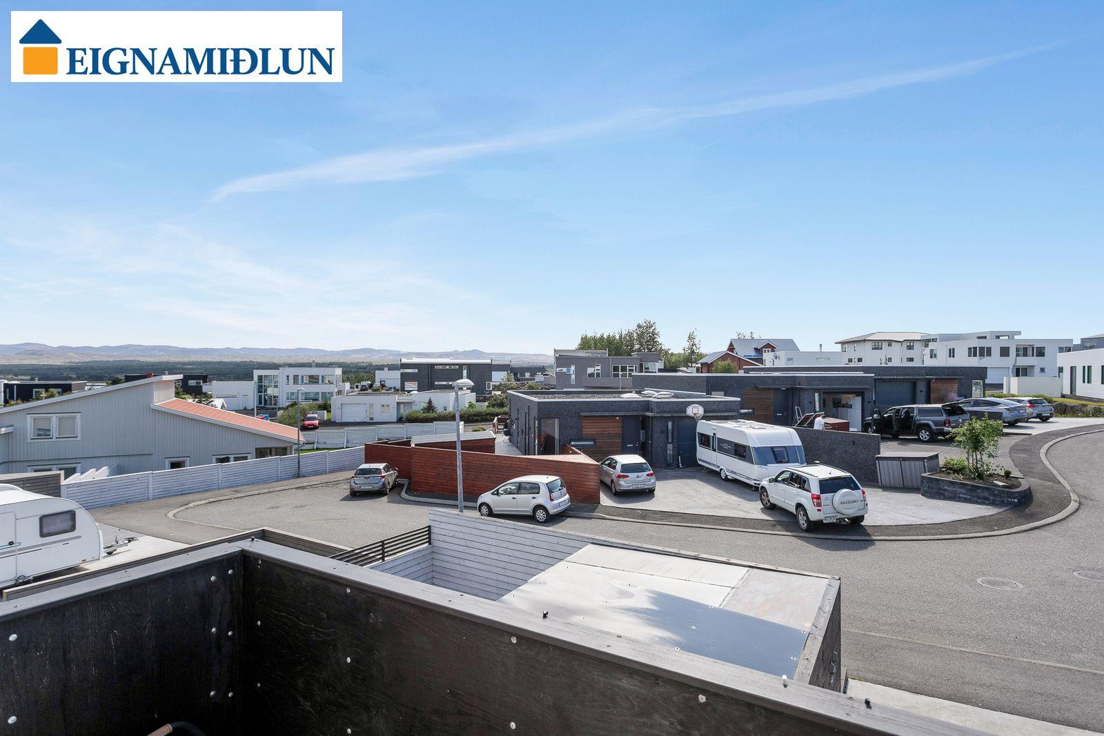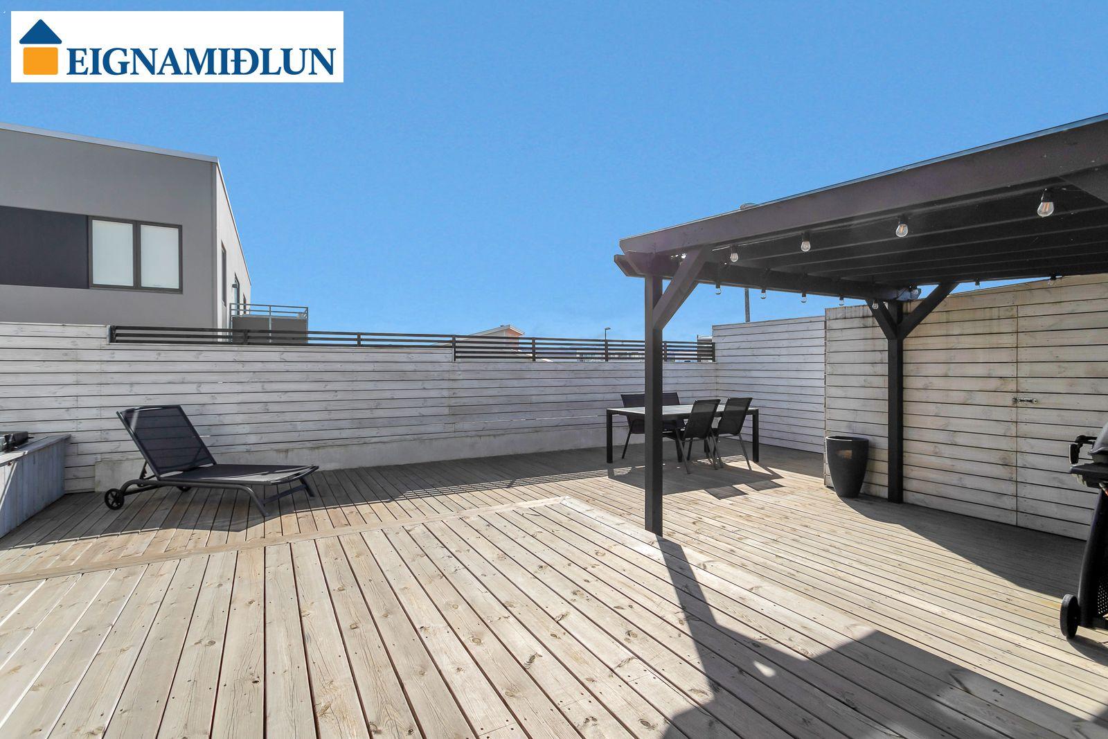 Fallegt og vel skipulagt 181m² parhús á tveimur hæðum. Fimm svefnherbergi, stór timburpallur með heitum potti. Steypt upphitað bílaplan þar sem pláss er fyrir tvo bíla, þriggja fasa rafhleðslustöð. Örstutt er í alla þjónustu, skóla, leikskóla og frábærar gönguleiðir allt í kring. Góð eign á þessum eftirsótta og fallega stað.Samkvæmt skráningu HMS er birt flatarmál eignarinnar 181m², flatarmál íbúðarrýmis er 163,3m² og flatarmál bílskúrs er 17,7m². Fyrirhugað fasteignamat 2026 kr. 148.750.000.