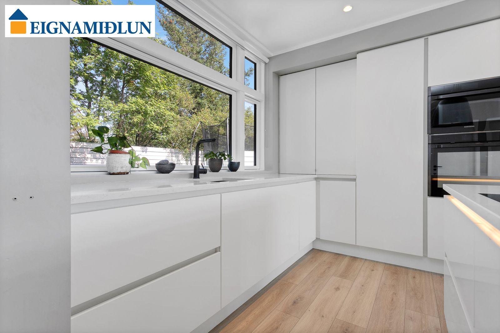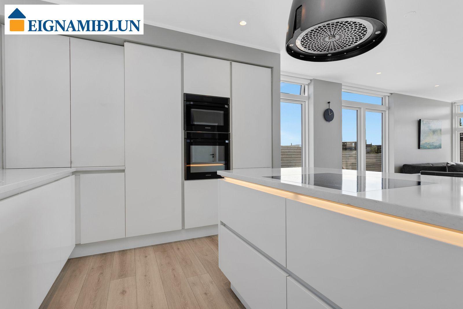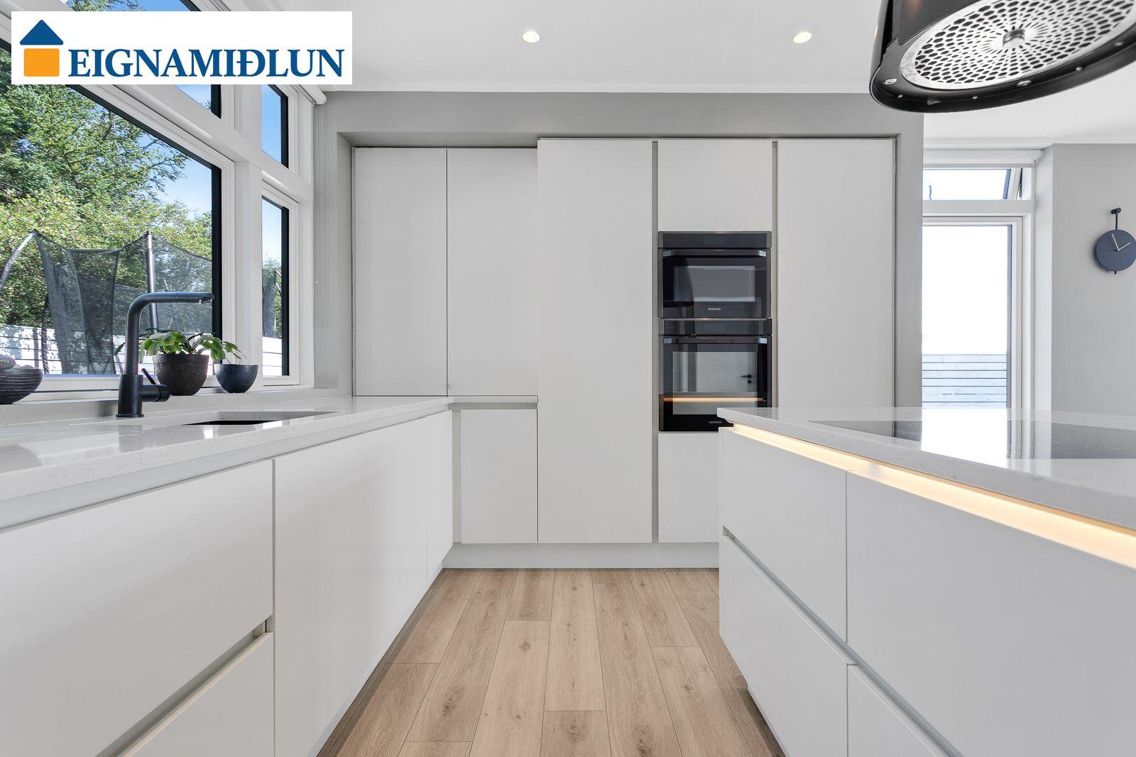 Eldhús er með hvítri innréttingu frá HTH, steinn á eldunareyju og eldhúsi, innbyggð uppþvottavél og ísskápur, tækjaskápur, niðurfellt helluborð og bakarofn og combi-ofn í vinnuhæð.
