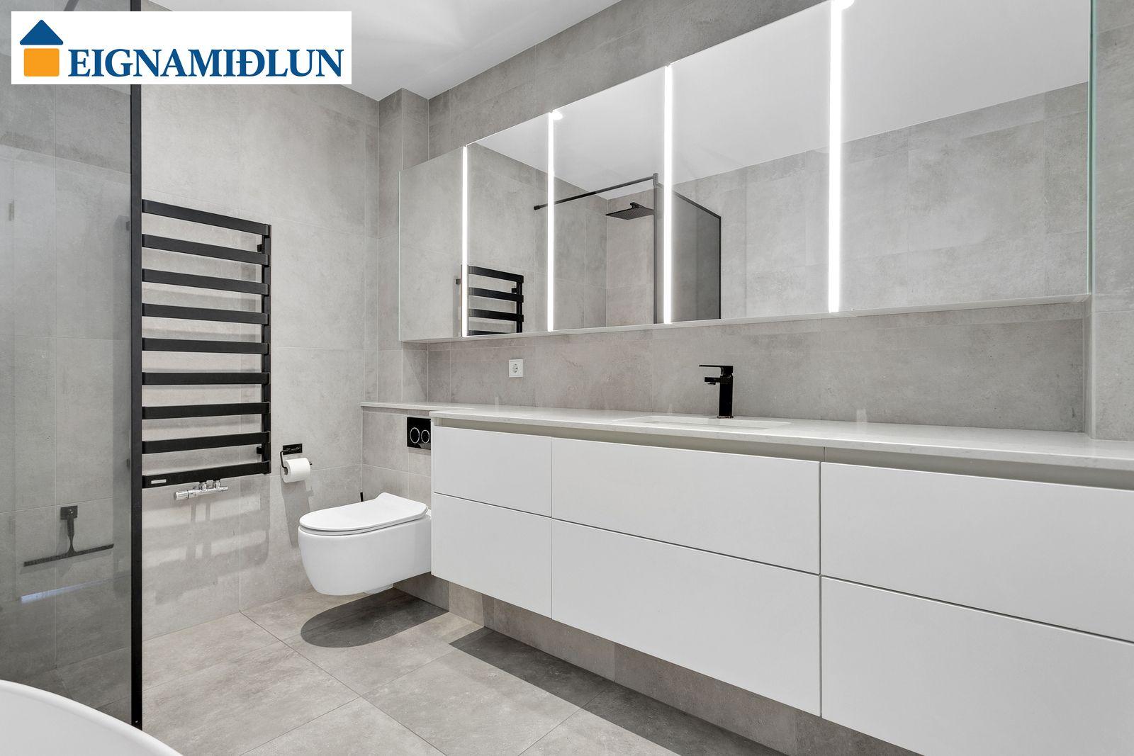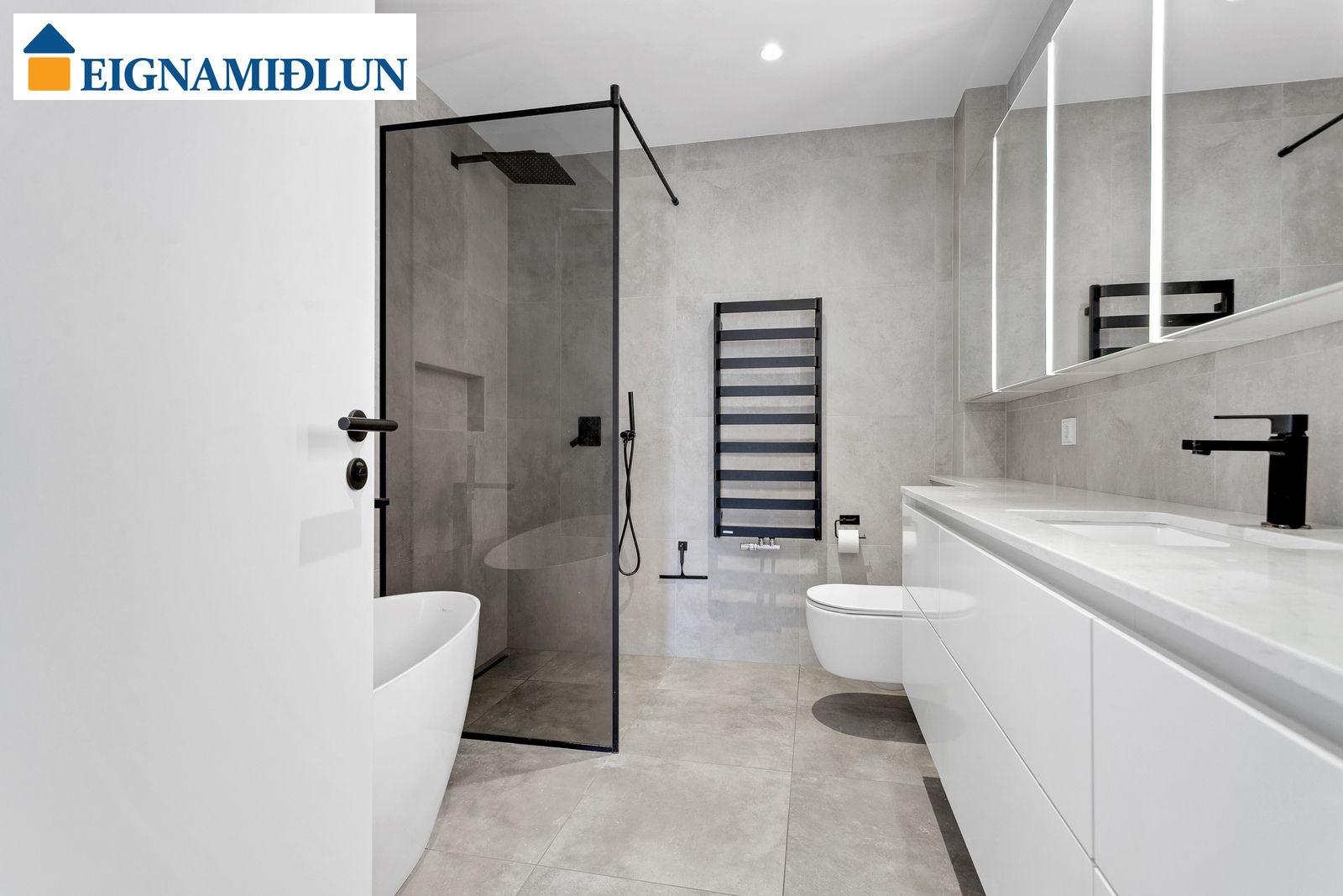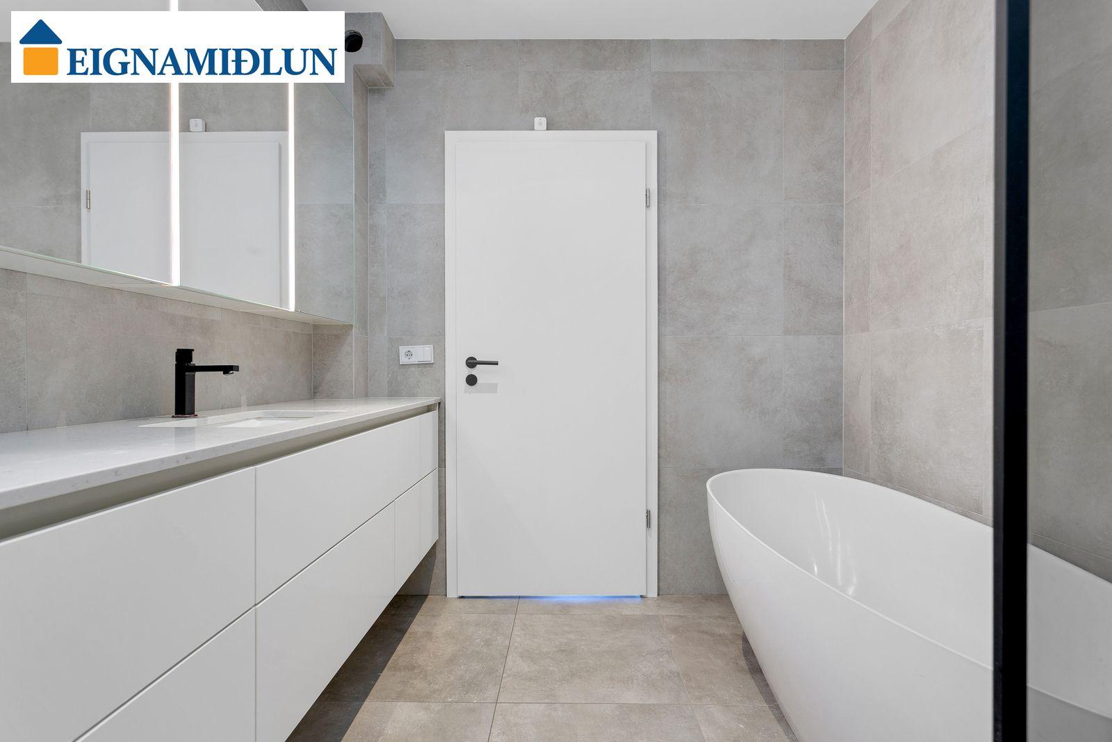 Baðherbergi er með gólfhita, hvítri innréttingu frá HTH, gott skúffupláss og speglaskápur ofan við handlaug, fallegt frístandandi baðkar, walk in sturta með innbyggðum blöndunartækjum og handklæðaofni. Flísar á gólfi og upp á veggi,