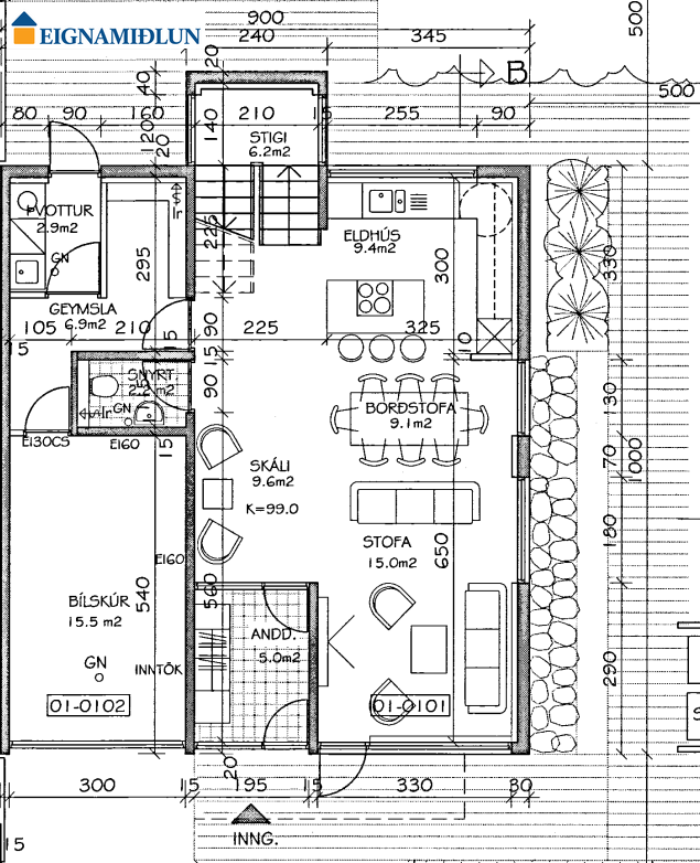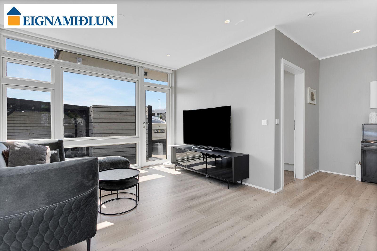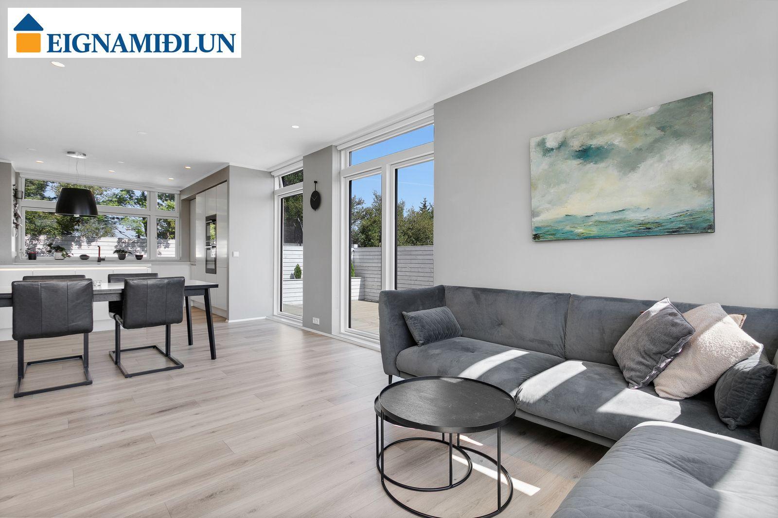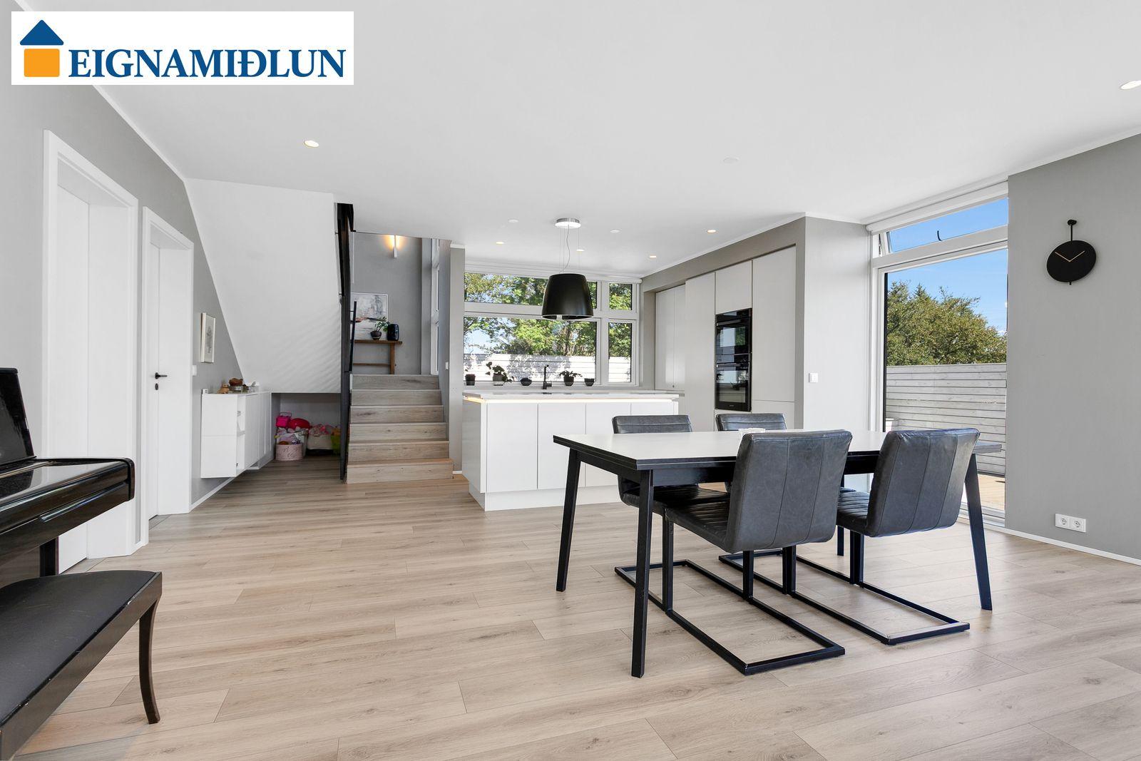 Stofa og borðstofa eru í opnu og björtu samliggjandi rými sem er opið inn í eldhús. Gólfsíðir gluggar eru í stofu og borðstofu. Frá stofu er hægt ganga út á timburverönd.