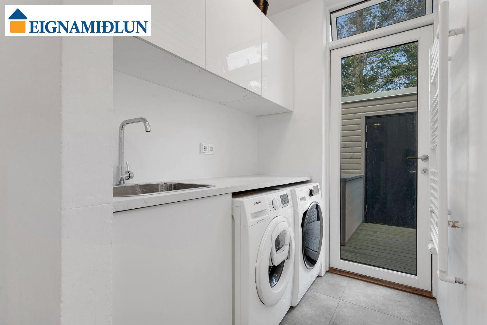 Þvottahús með innréttingu, skolvask og handklæðaofni. Flísar á gólfi. Frá þvottahúsi er hægt að ganga útá baklóð.