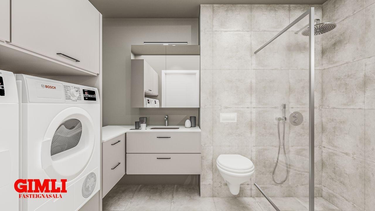 Baðherbergi: flísalagt gólf og að hluta til á veggjum, walk in sturta með glerskilrúmi. Góð baðinnrétting með vaski og speglaskáp fyrir ofan, handklæðaofni og innréttingu fyrir þvottavél og þurrkara.