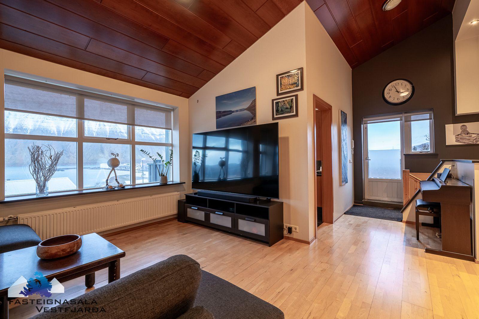 Stór borðstofa, setustofa og sjónvarpsstofa, gott útsýni yfir fjörðinn. Parket á gólfi.