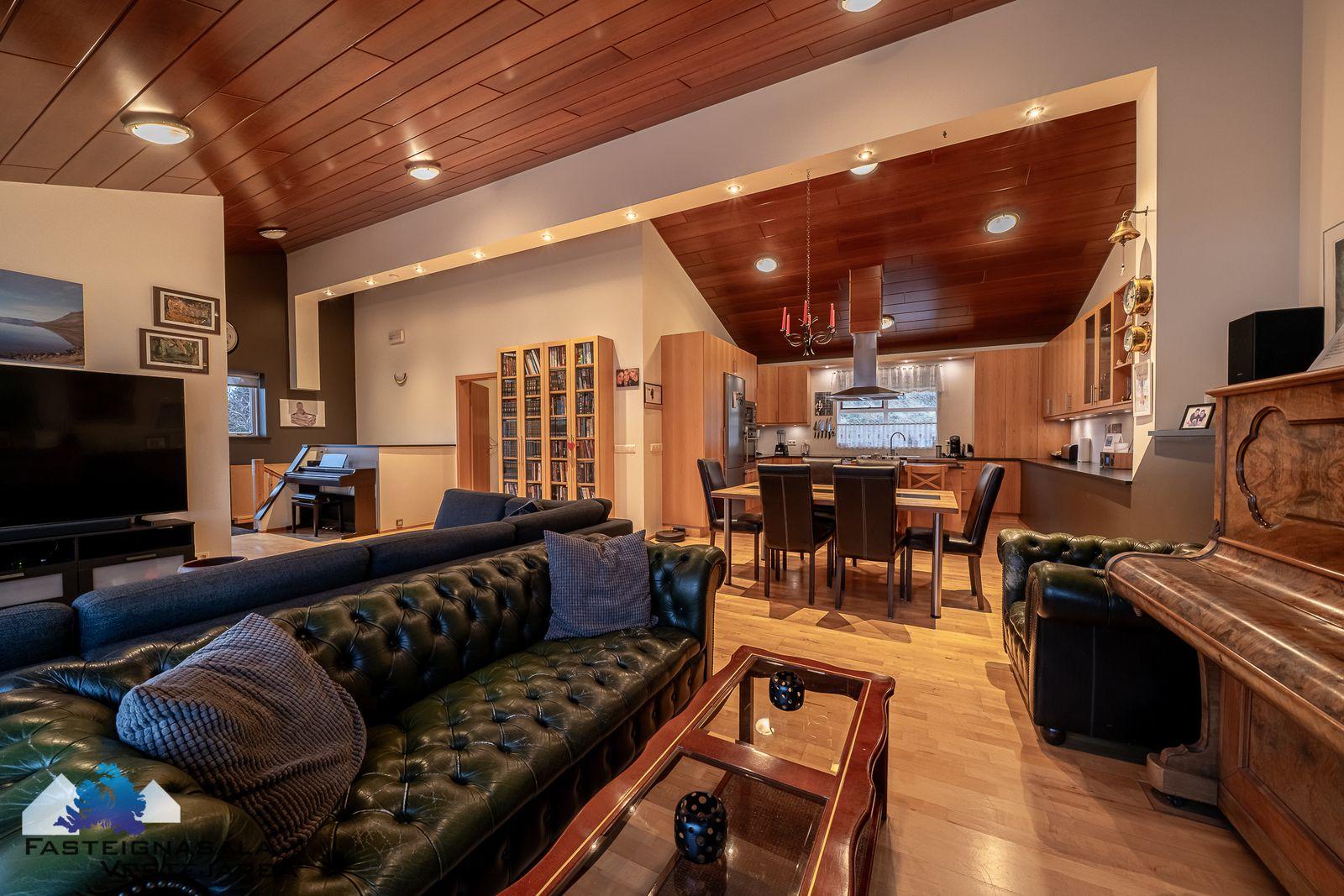 Stórt opið rými þar sem er sjónvarpsstofa, setustofa, borðstofa og eldhús. Góð lofthæð á efri hæðinni.