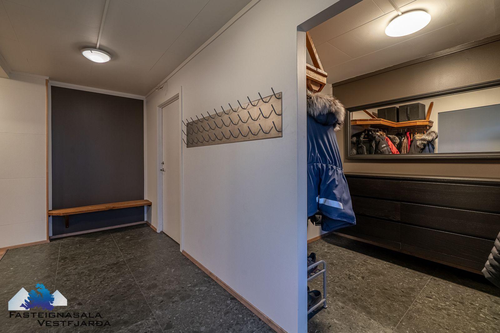 Komið inn í flísalagða forstofu, fataherbergi með hillum og fatahengi, flísar á gólfi. Hiti í er í gólfi á jarðhæð nema í minna svefnherbergi.