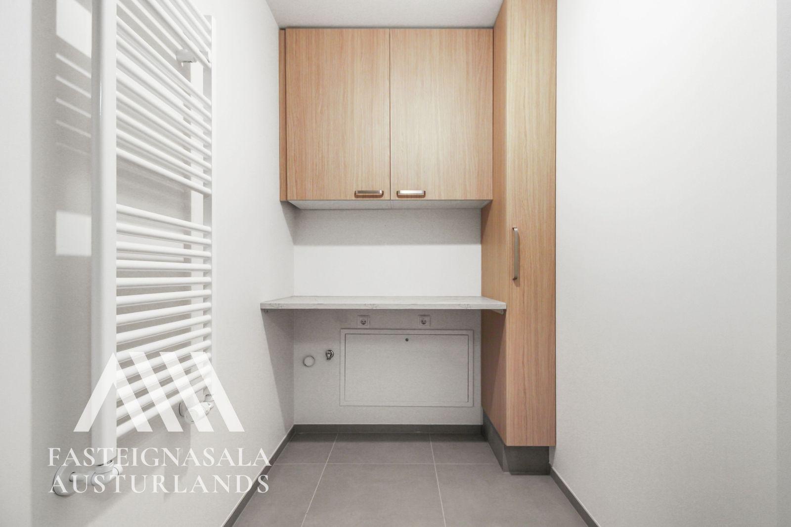 Þvottahús er á baðherbergi, pláss fyrir tvær vélar með vinnuborði ofan á og skápur fyrir ofan og til hliðar.