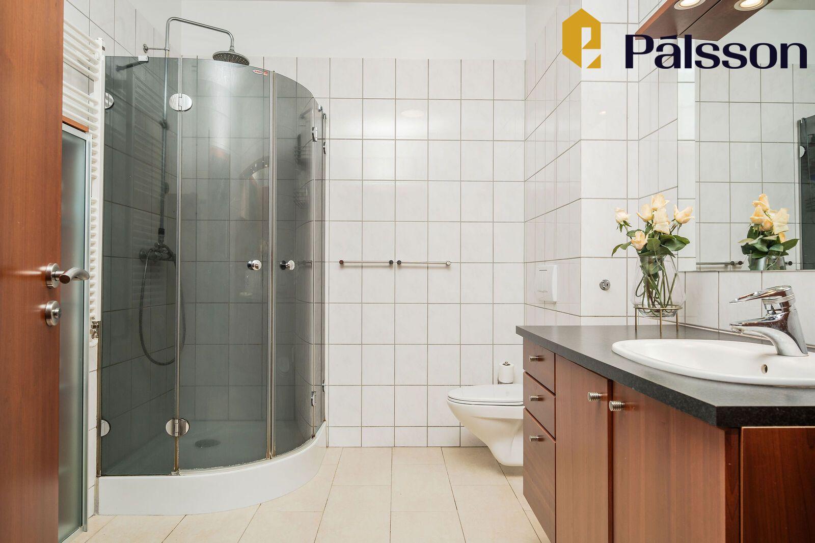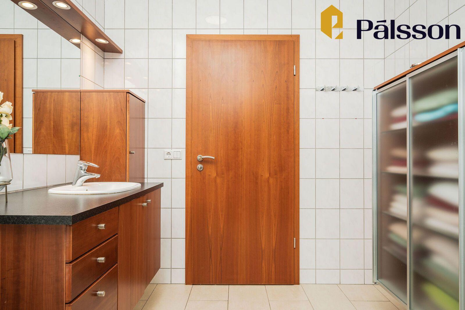 Baðherbergi er flísalagt í hólf og gólf og er með góðri viðarinnréttingu, dökkri borðplötu, handlaug, vegghengdu salerni, sturtuklefa og handklæðaofni.