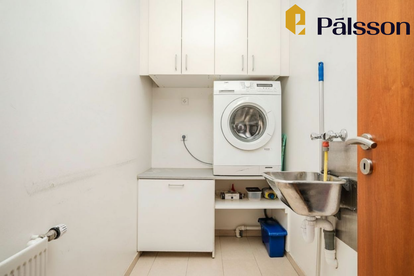 Þvottahús er með hvítri innréttingu og plássi fyrir þvottavél og þurrkara í vinnuhæð. Flísar á gólfi.