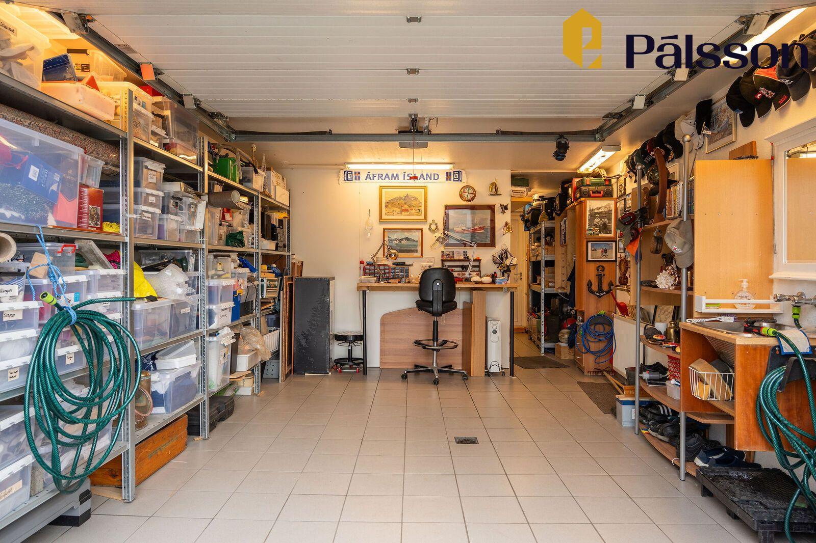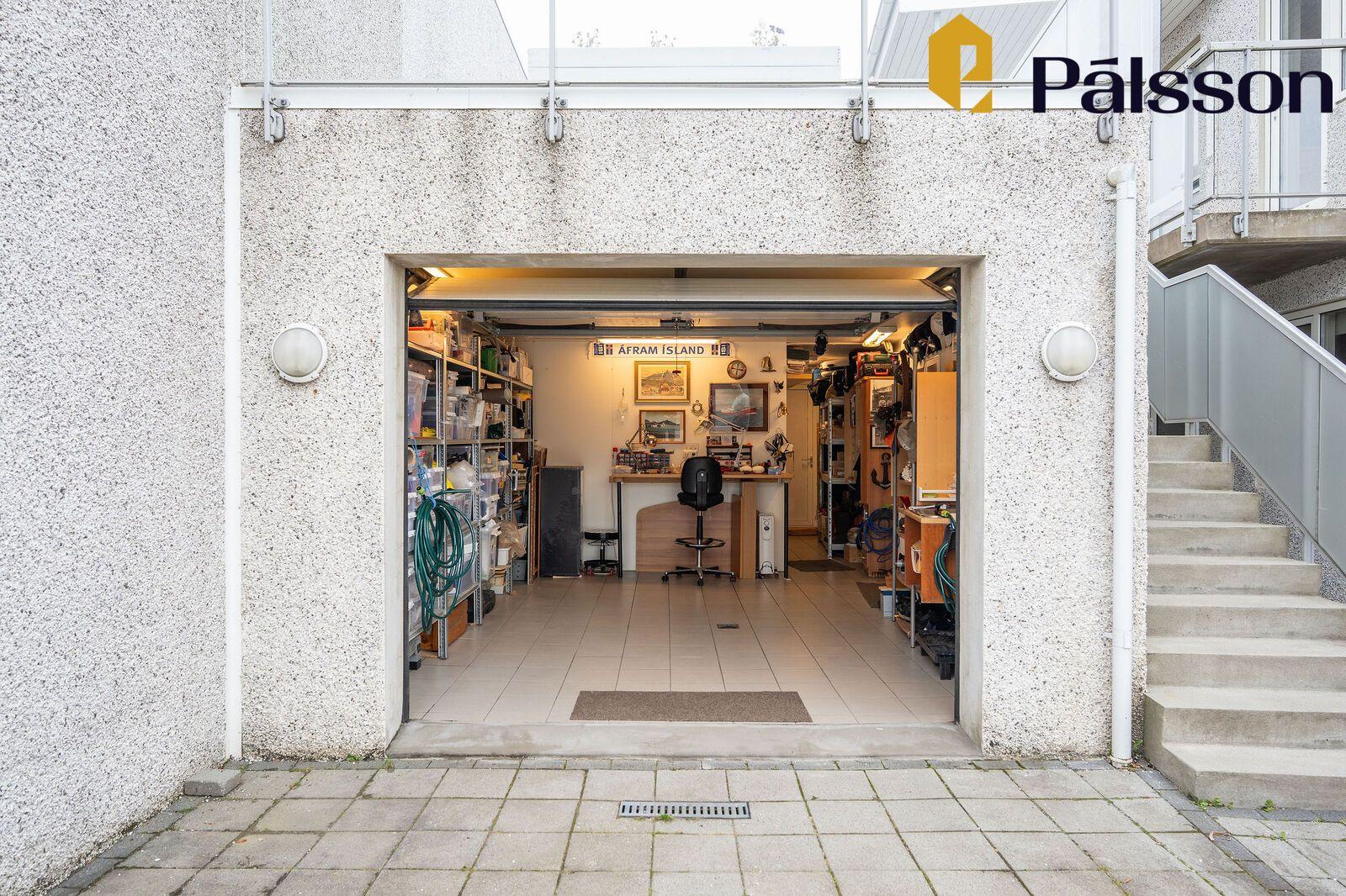Bílskúr er rúmgóður með rafdrifnum hurðaopnara og flísum á gólfi. Samkvæmt upprunalegri teikningu er geymsla inn af bílskúrnum með hurð að aftan en innra skipulagi skúrsin hefur verið breytt. Auðvelt er að breyta tilbaka.