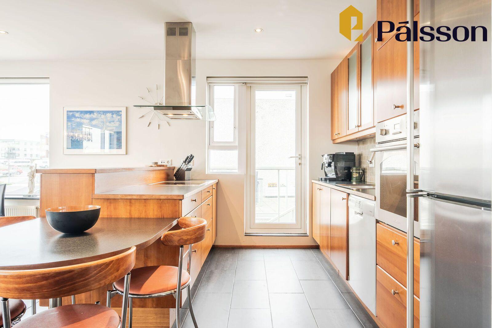 Eldhús er með góðu skápaplássi, viðarinnrétting með dökkri borðplötu, bakaraofn, helluborð og háfur. Flísar á gólfi.