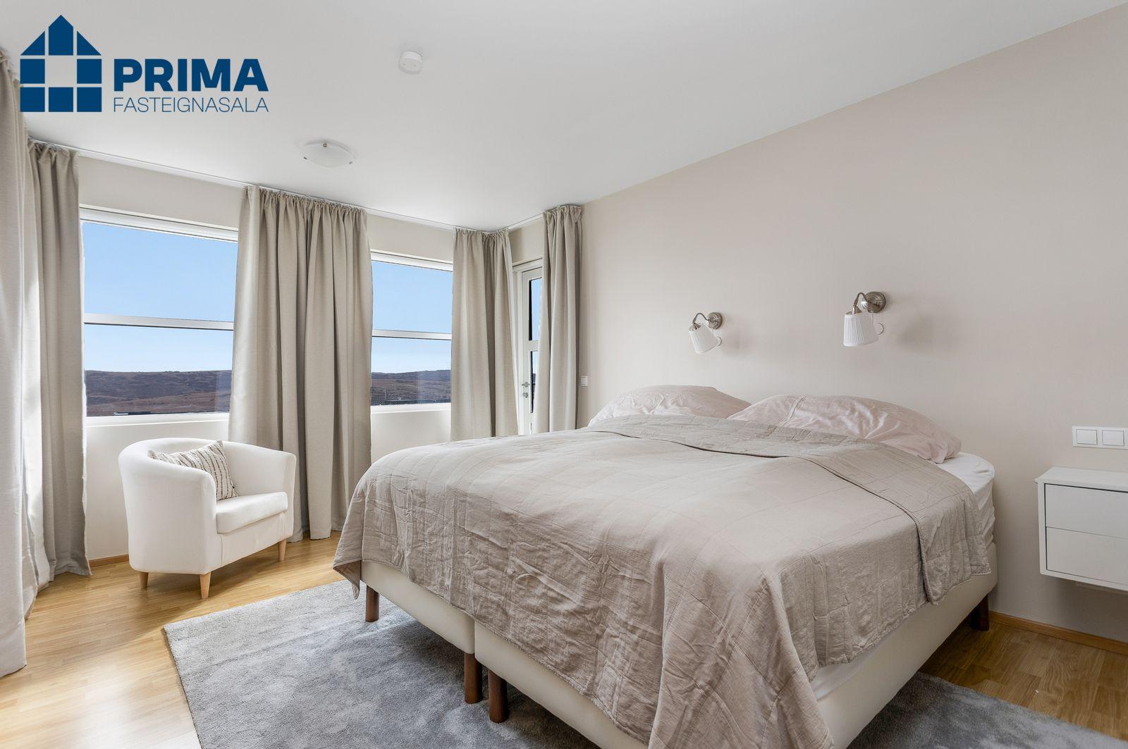 Hjónaherbergi með fataherbergi er mjög rúmgott.