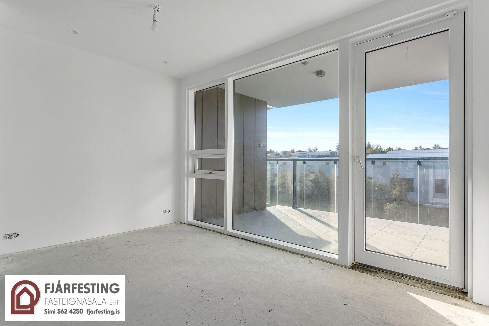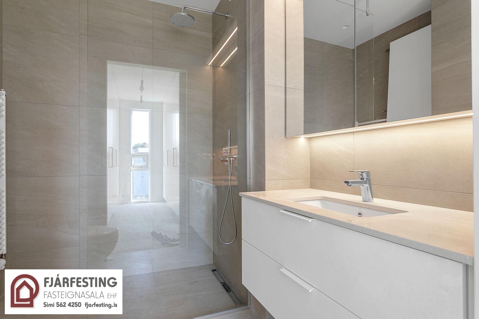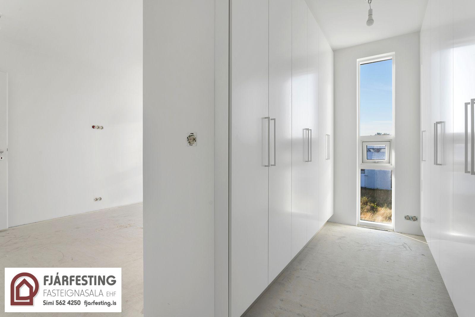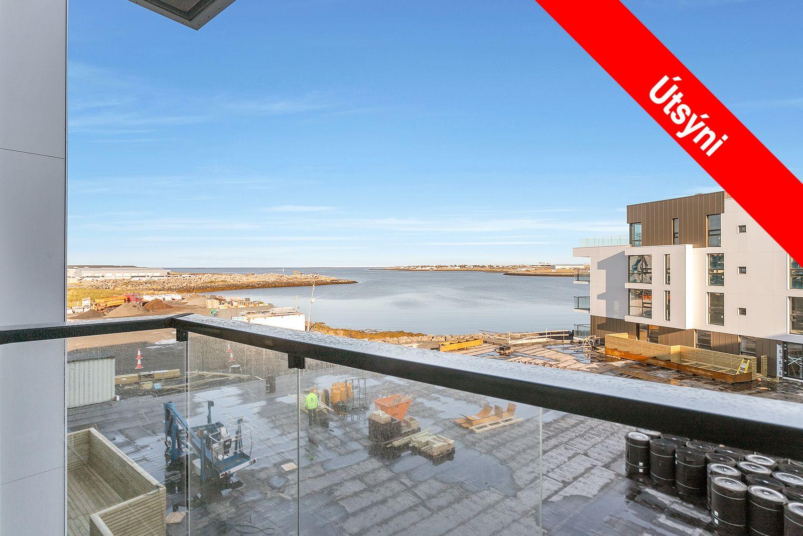 Nánari lýsing: Komið er inn í forstofu með góðum fataskáp. Eldhús með glæsilegri innréttingu og vönduðum AEG eldhústækjum. Þvottahús með flísum á gólfi og innréttingu. Björt stofa gegnið út á svalir með sjávarútsýni. Borðstofa, gengið út á svalir. Rúmgott sjónvarpshol. Aukinn lofthæð er í stofum og eldhúsi. Baðherbergi með flísum á gólfi og veggjum, stórri sturtu með glerþili, innbyggðum vönduðum blöndunartækjum frá Tengi, og fallegri innréttingu frá Brúnás. Hjónaherbergi með fataherbergi og sérbaðherbergi með sturtu og innréttingu. Herbergi með fataskáp.