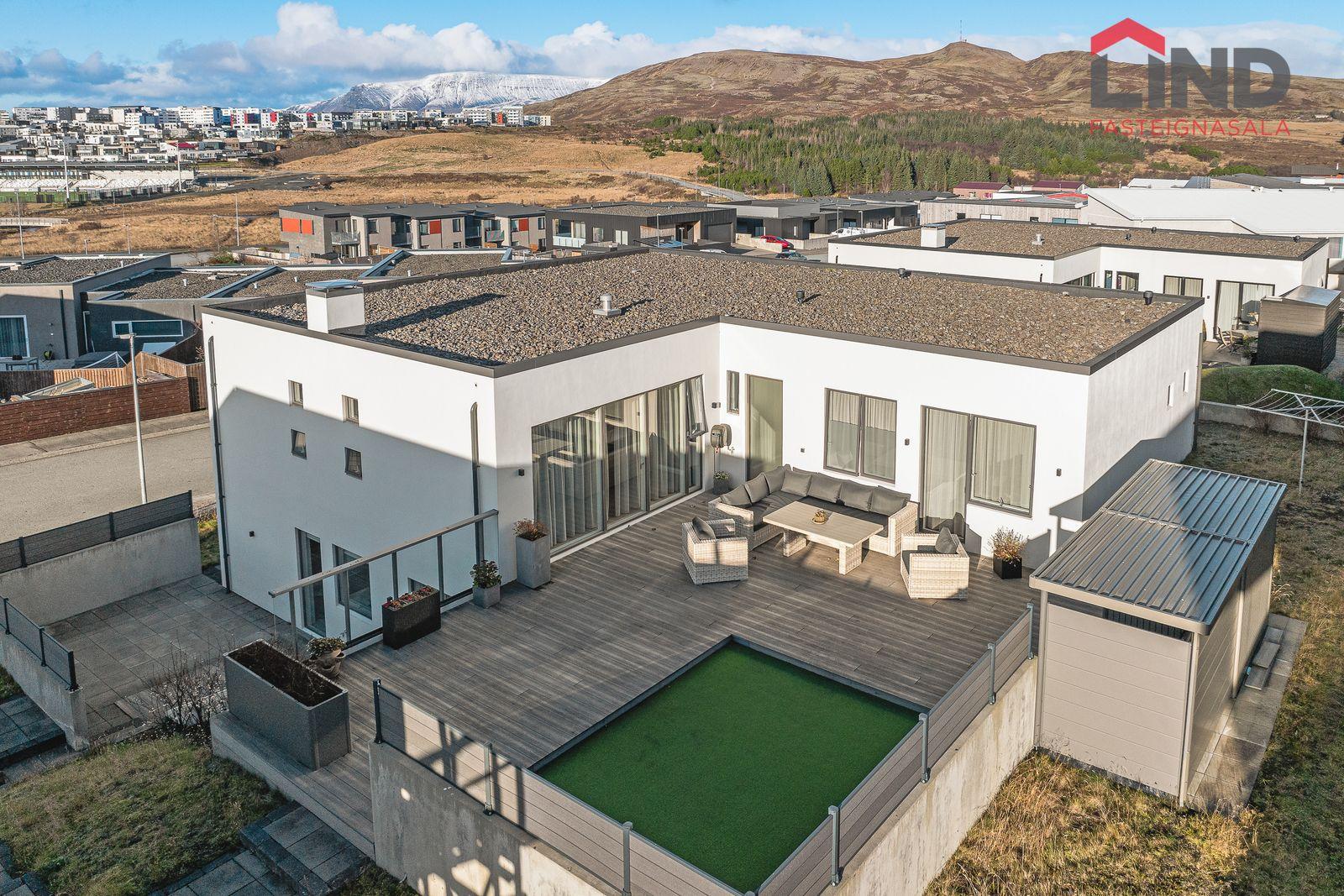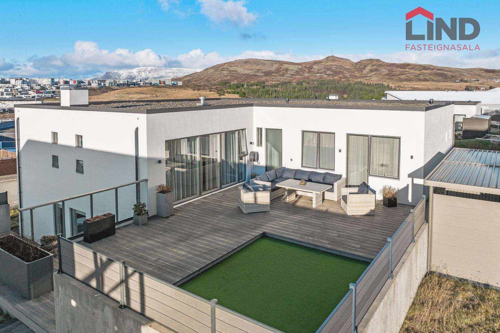 Um er að ræða afar vel staðsett hús með glæsilegu útsýni í rólegu fjölskylduhverfi í lokuðum botlanga við Haukdælabraut í Reykjavík. Húsið er afar glæsilegt með mikilli lofthæð, stórum gluggum og vönduðum sérsmíðuðum innréttingum og gólfefnum. Allt efnisval, sérsmíði og tæki hússins eru í hæsta gæðaflokki. Allar innréttingar (líka í aukaíbúð) eru sérsmíðaðar hjá Heggi smíðaverkstæði. Gólfhiti er í öllu húsinu. Stórar yfirbyggðar svalir liggja út frá stofu með fallegu útsýni að Esjunni og Úlfarsfelli.