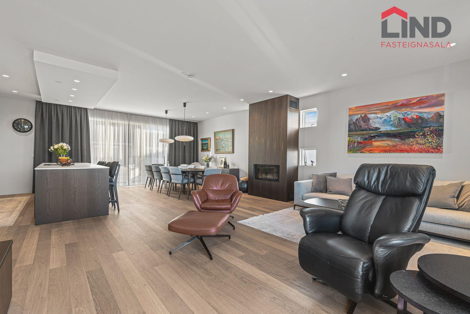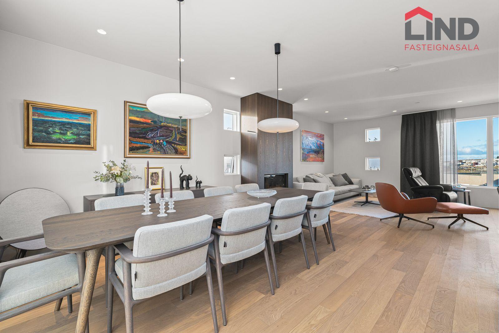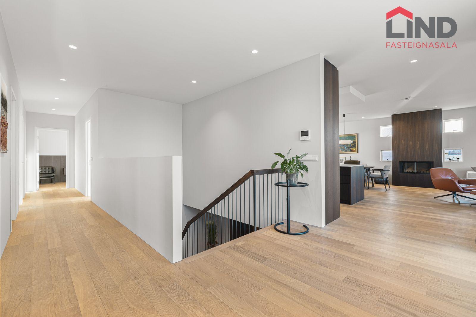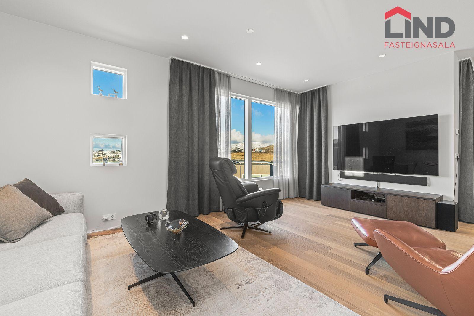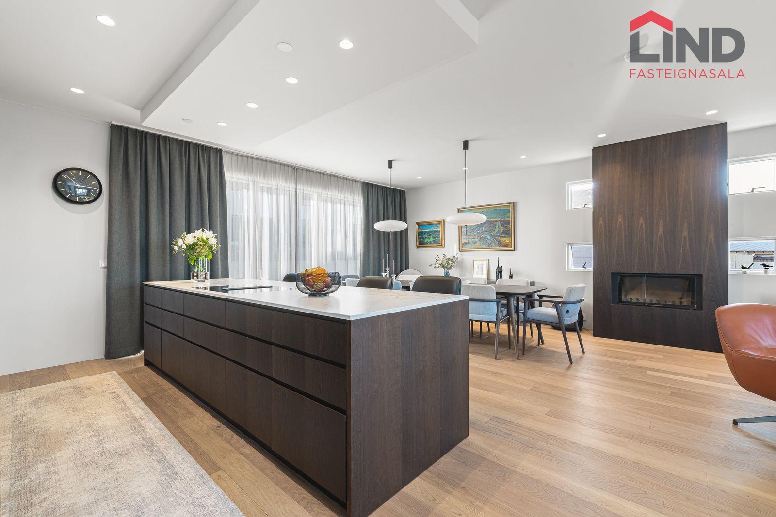 Aðalhæðin (efri hæð): Er vel skipulögð með stórum alrýmum og útgengi á rúmgóðar svalir með afar fallegu útsýni og stóra verönd til suðvesturs. Niðurtekin loft að hluta og innfelld lýsing í loftum. Fallegt útsýni er úr alrými efri hæðar. Glæsileg eldhúsinnrétting úr reyktri eik og steinn á borðum og eldhúseyju. Hjónasvíta með stóru fataherbergi og baðherbergi, 2 svefnherbergi, sjónvarpsstofa og baðherbergi.