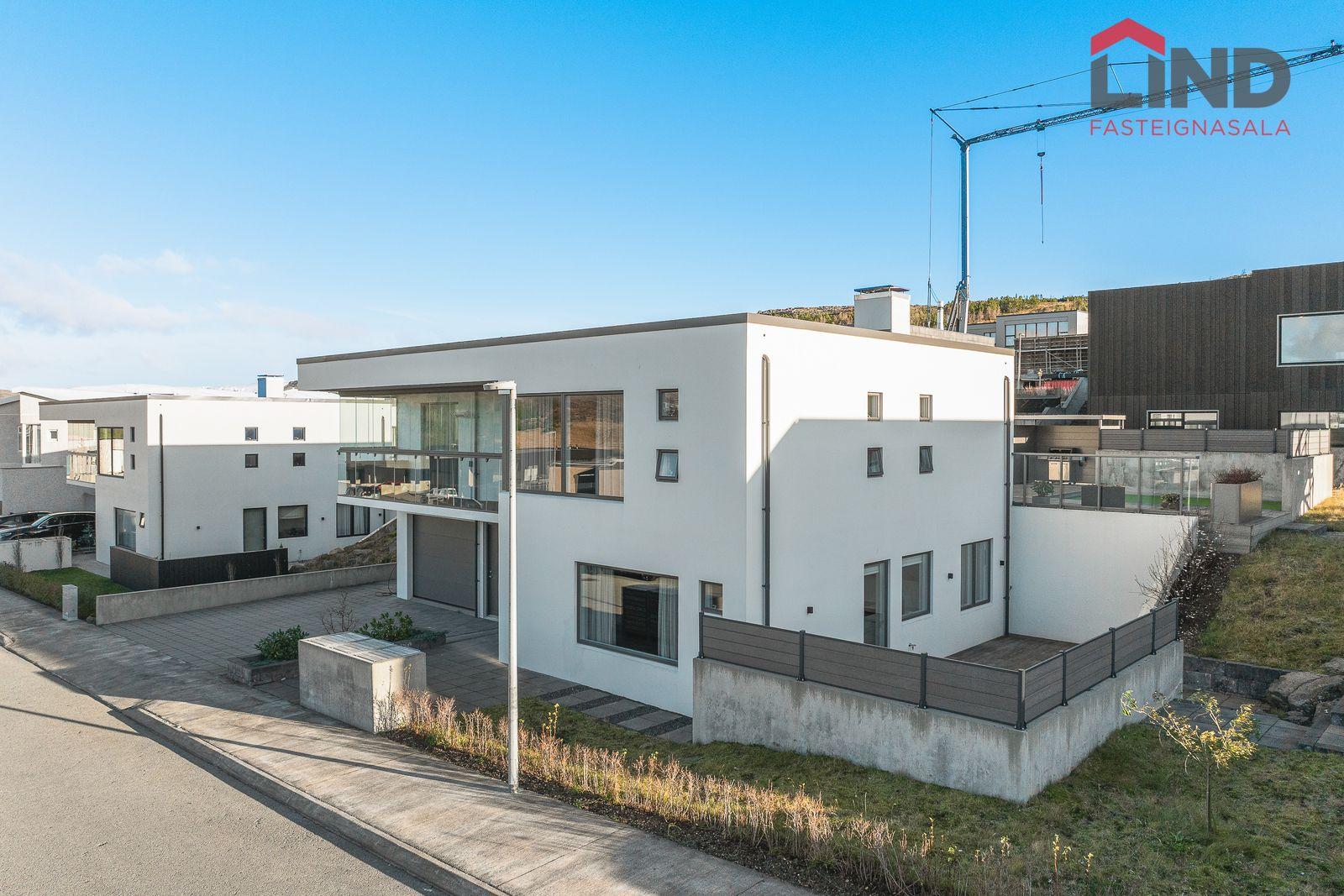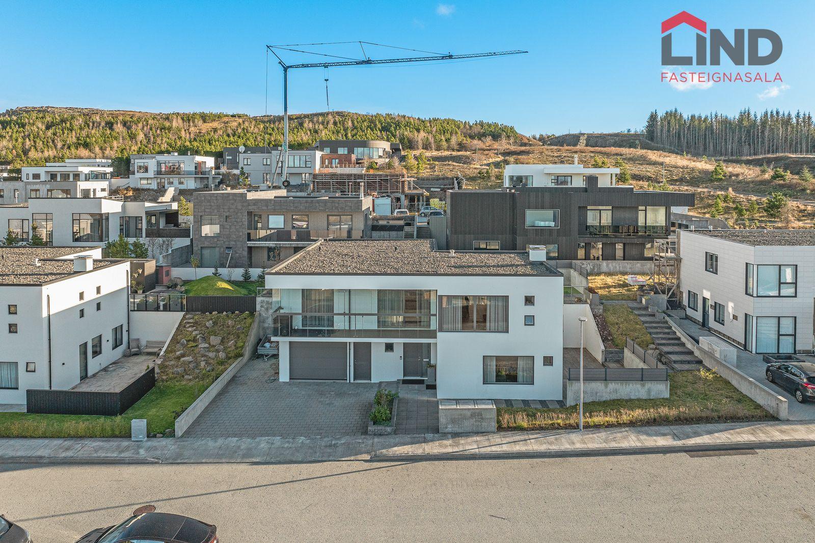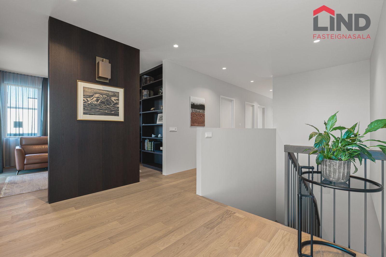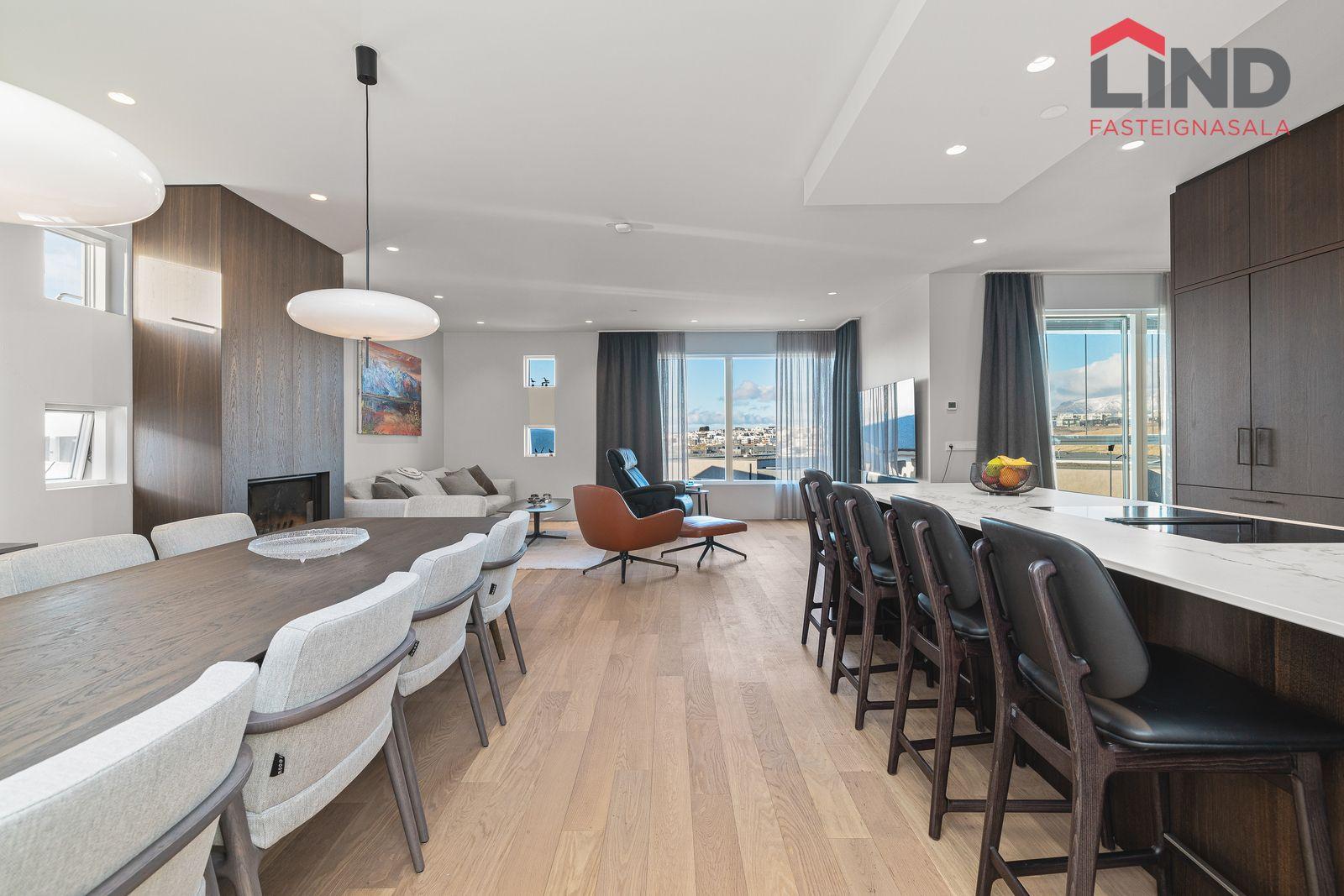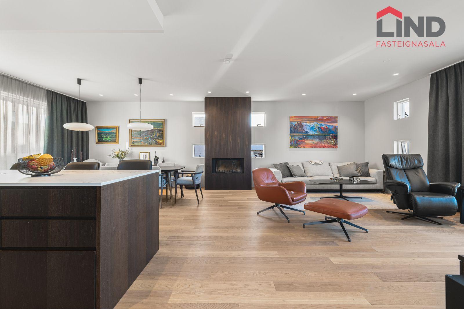 Aðalhæðin (efri hæð): Er vel skipulögð með stórum alrýmum og útgengi á rúmgóðar svalir með afar fallegu útsýni og stóra verönd til suðvesturs. Niðurtekin loft að hluta og innfelld lýsing í loftum. Fallegt útsýni er úr alrými efri hæðar. Glæsileg eldhúsinnrétting úr reyktri eik og steinn á borðum og eldhúseyju. Hjónasvíta með stóru fataherbergi og baðherbergi, 2 svefnherbergi, sjónvarpsstofa og baðherbergi.