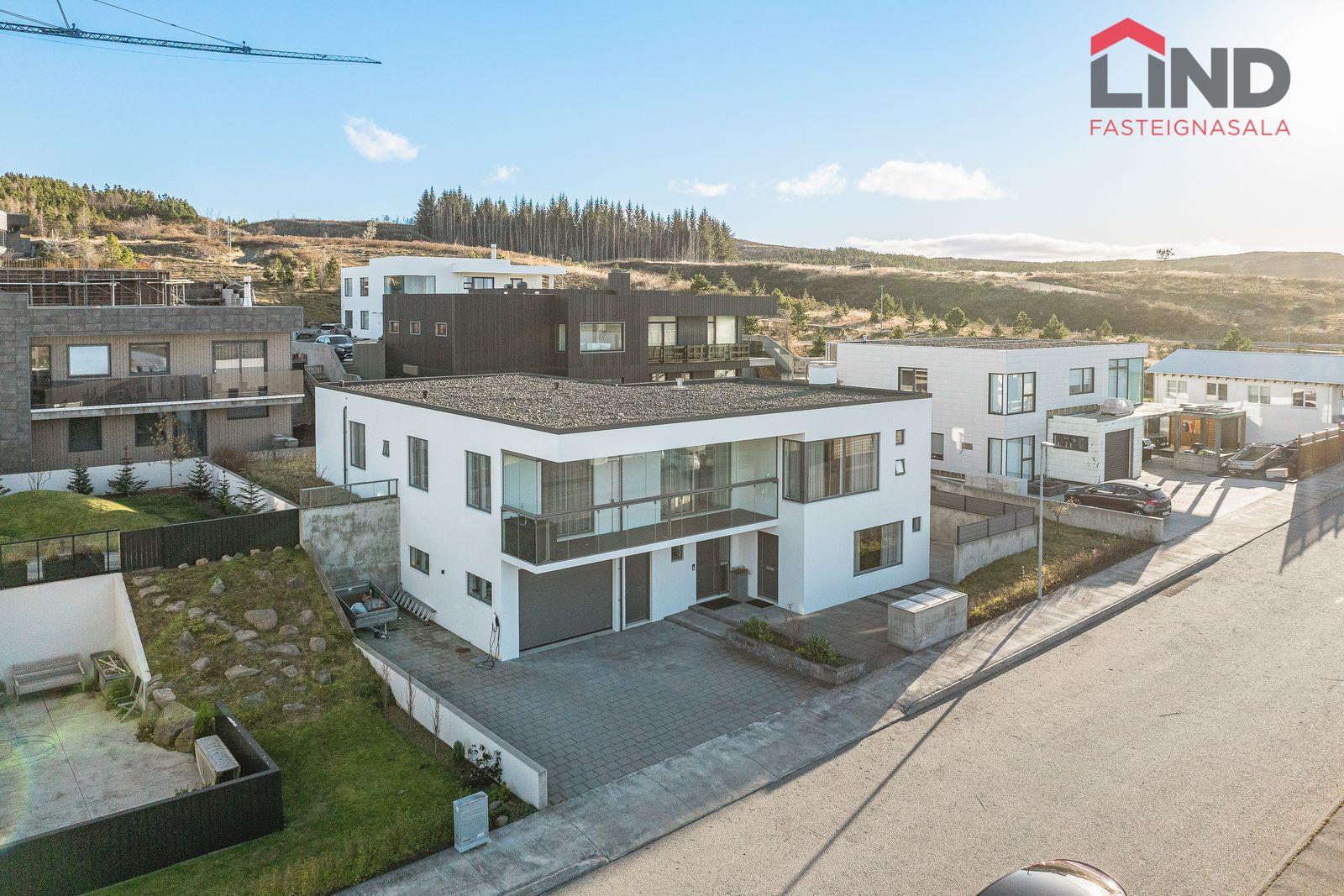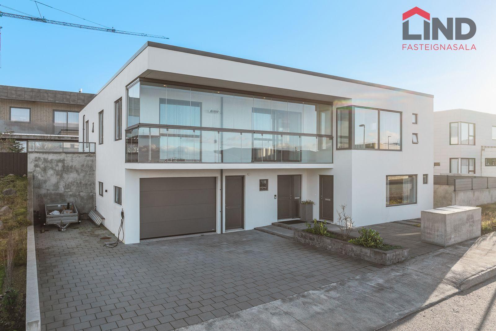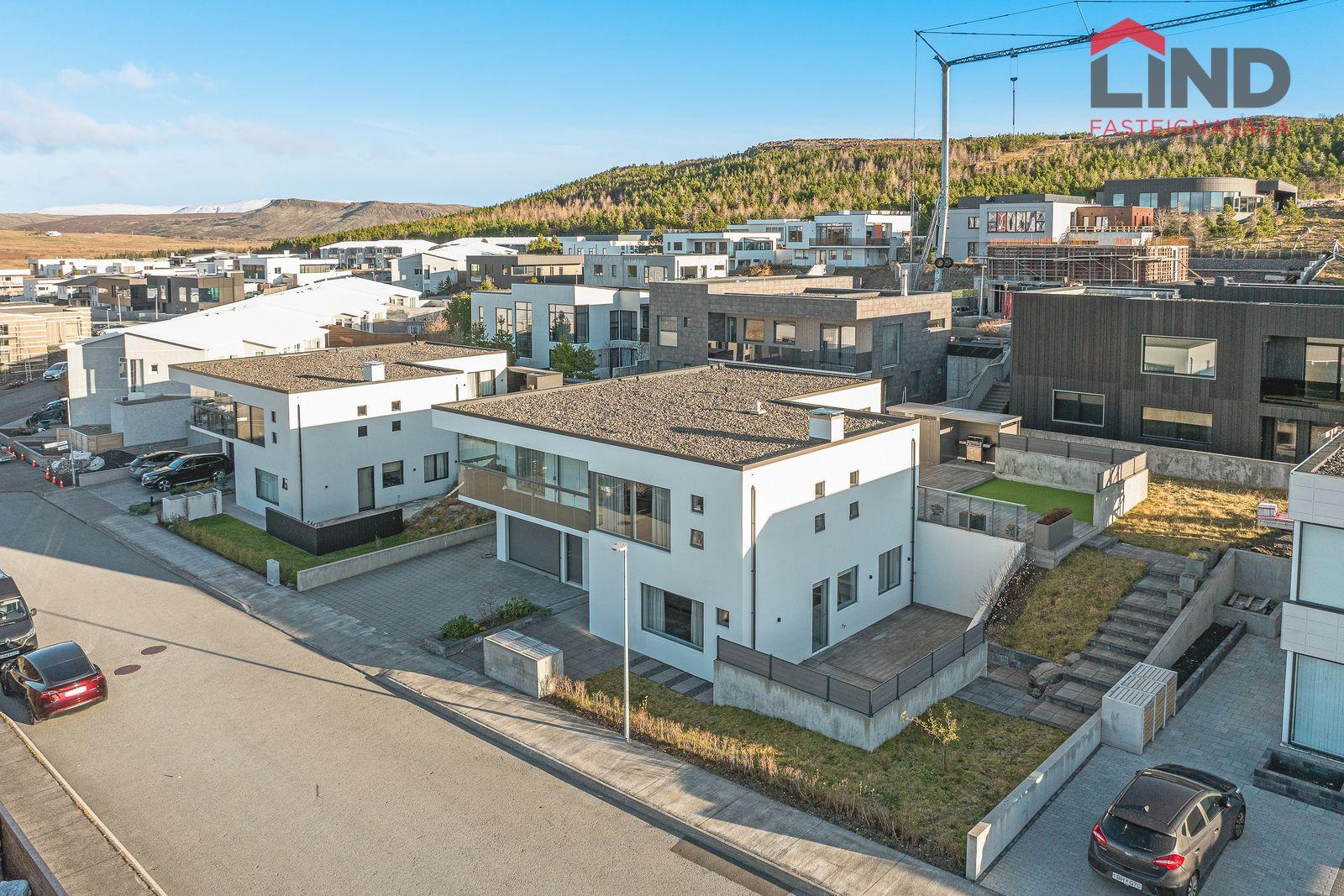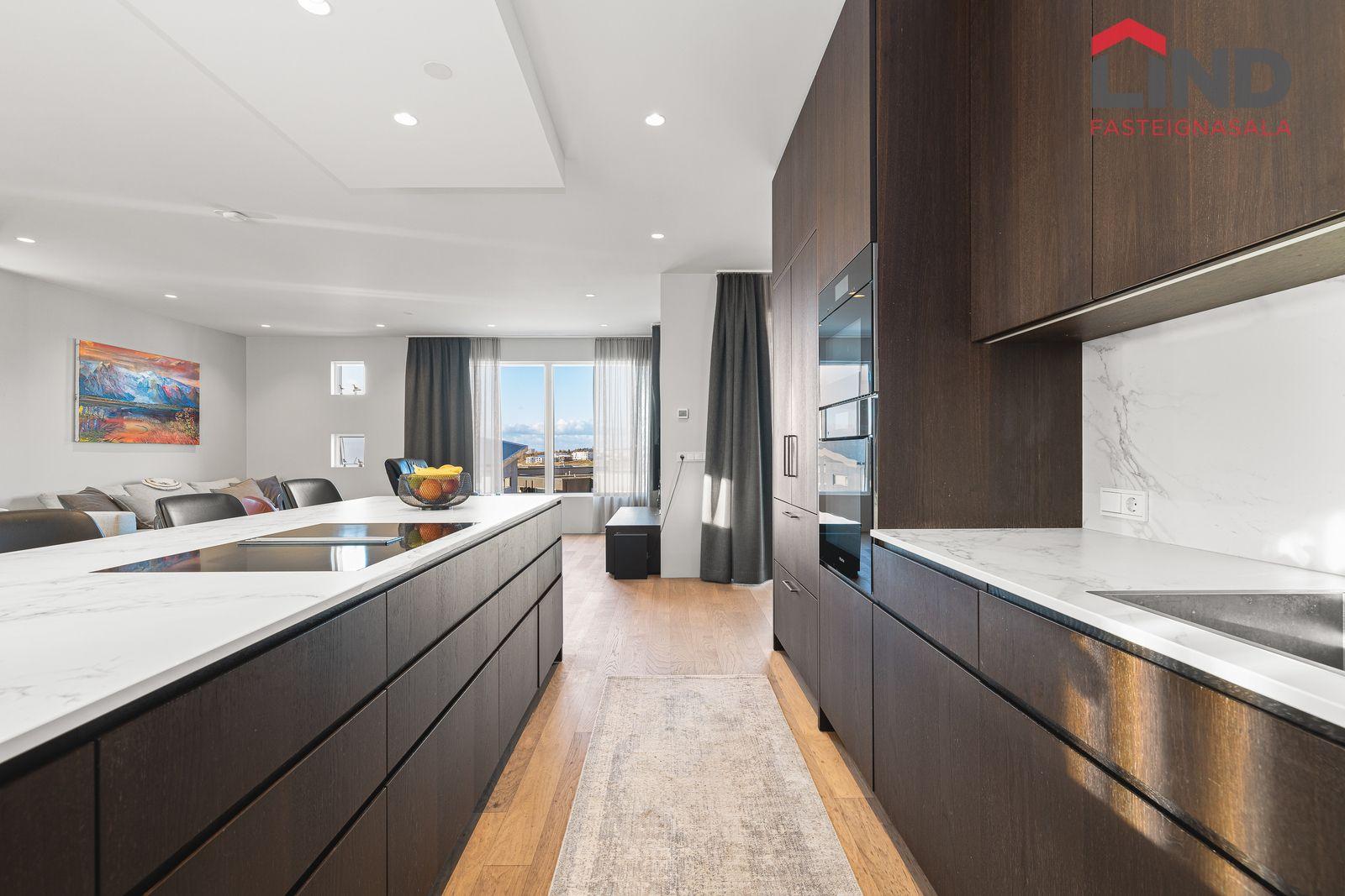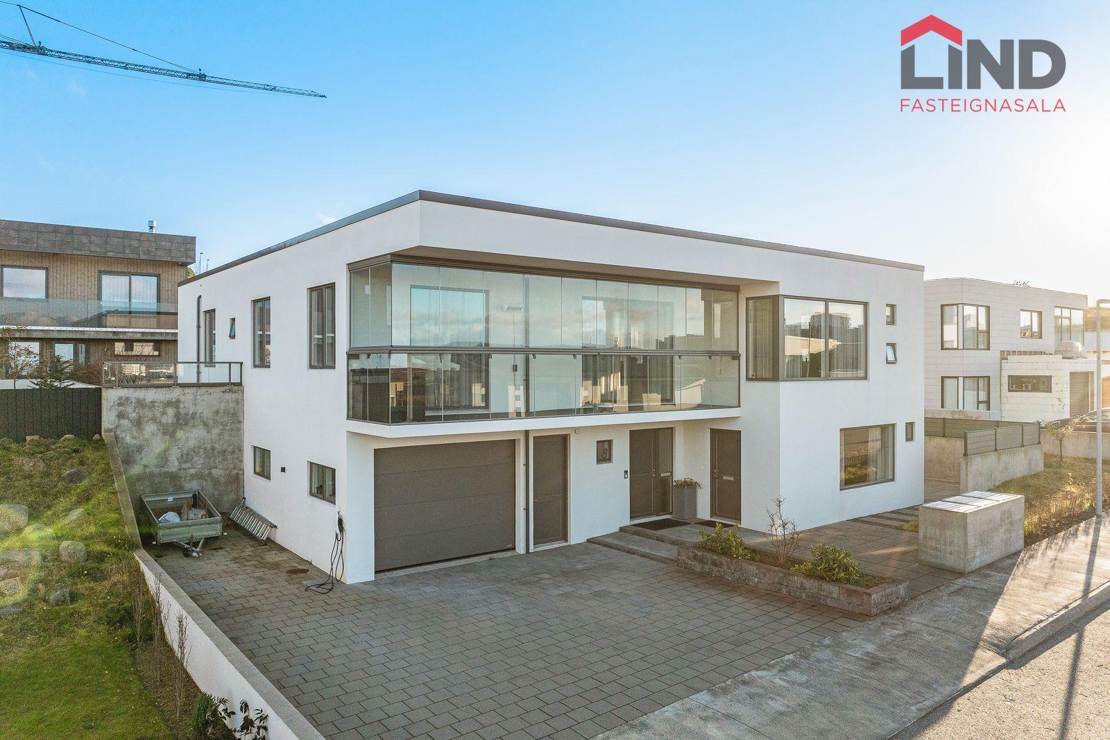 Aðalhæðin (efri hæð): Er vel skipulögð með stórum alrýmum og útgengi á rúmgóðar svalir með afar fallegu útsýni og stóra verönd til suðvesturs. Niðurtekin loft að hluta og innfelld lýsing í loftum. Fallegt útsýni er úr alrými efri hæðar. Glæsileg eldhúsinnrétting úr reyktri eik og steinn á borðum og eldhúseyju. Hjónasvíta með stóru fataherbergi og baðherbergi, 2 svefnherbergi, sjónvarpsstofa og baðherbergi.