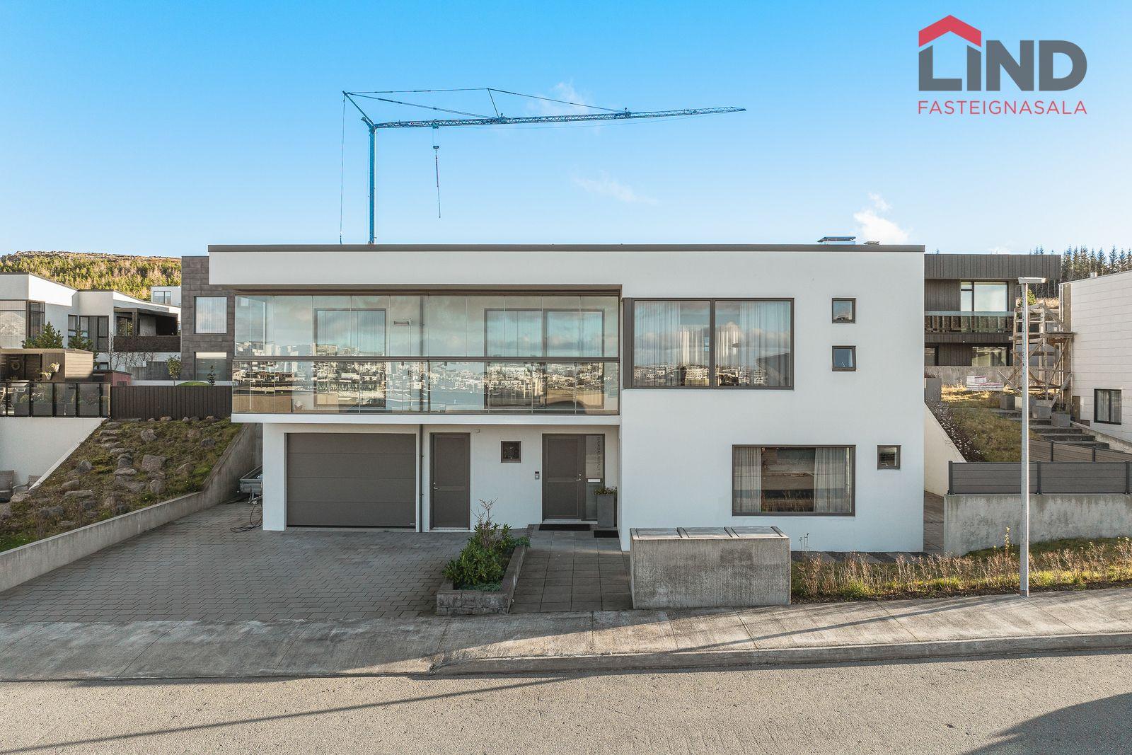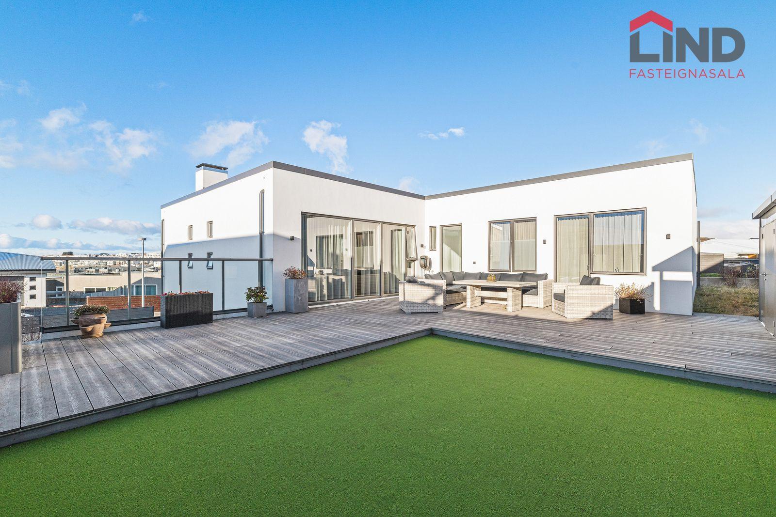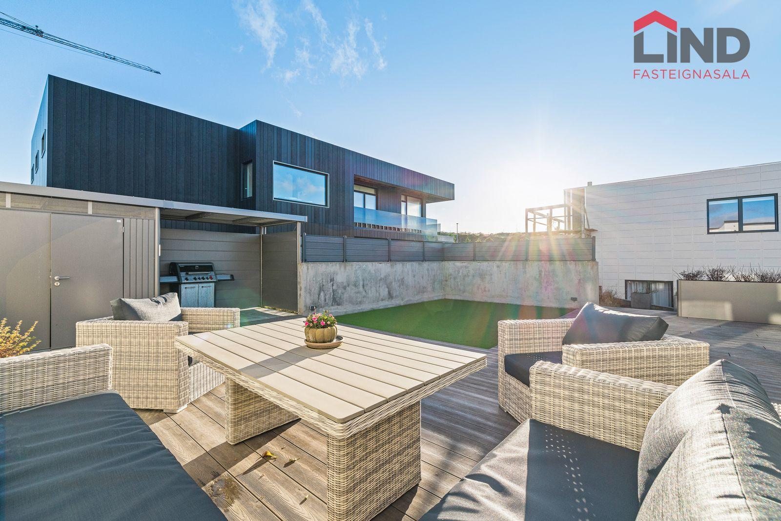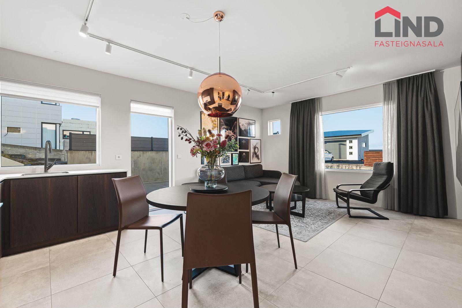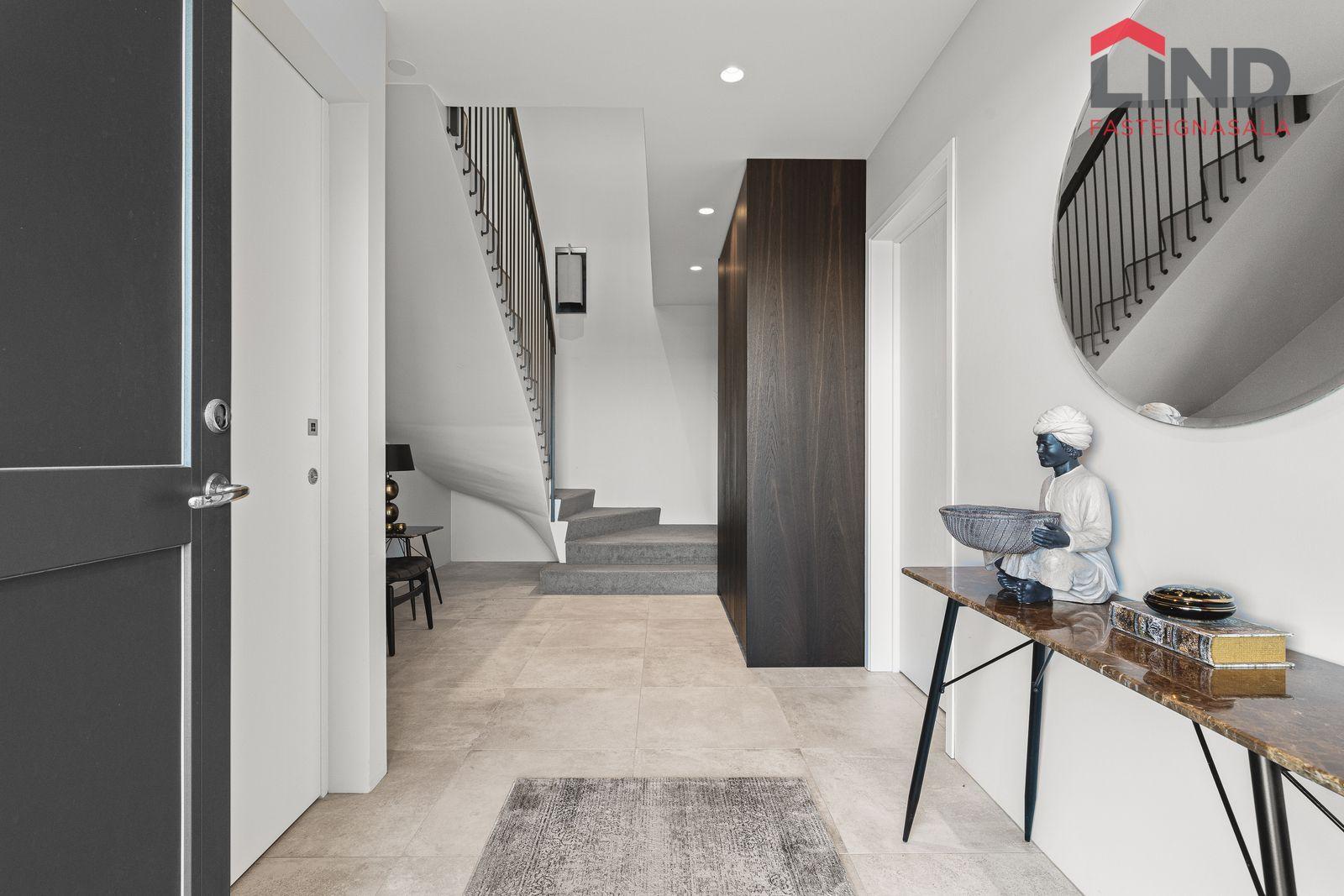 Aðalhæðin (efri hæð): Er vel skipulögð með stórum alrýmum og útgengi á rúmgóðar svalir með afar fallegu útsýni og stóra verönd til suðvesturs. Niðurtekin loft að hluta og innfelld lýsing í loftum. Fallegt útsýni er úr alrými efri hæðar. Glæsileg eldhúsinnrétting úr reyktri eik og steinn á borðum og eldhúseyju. Hjónasvíta með stóru fataherbergi og baðherbergi, 2 svefnherbergi, sjónvarpsstofa og baðherbergi.