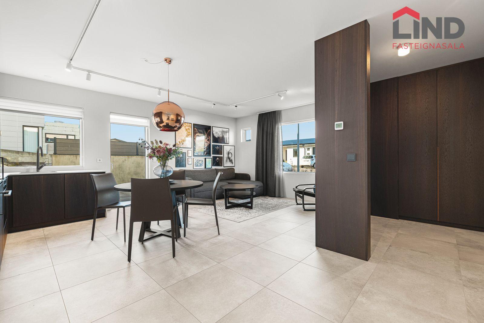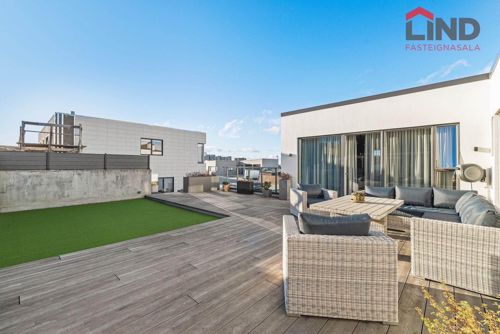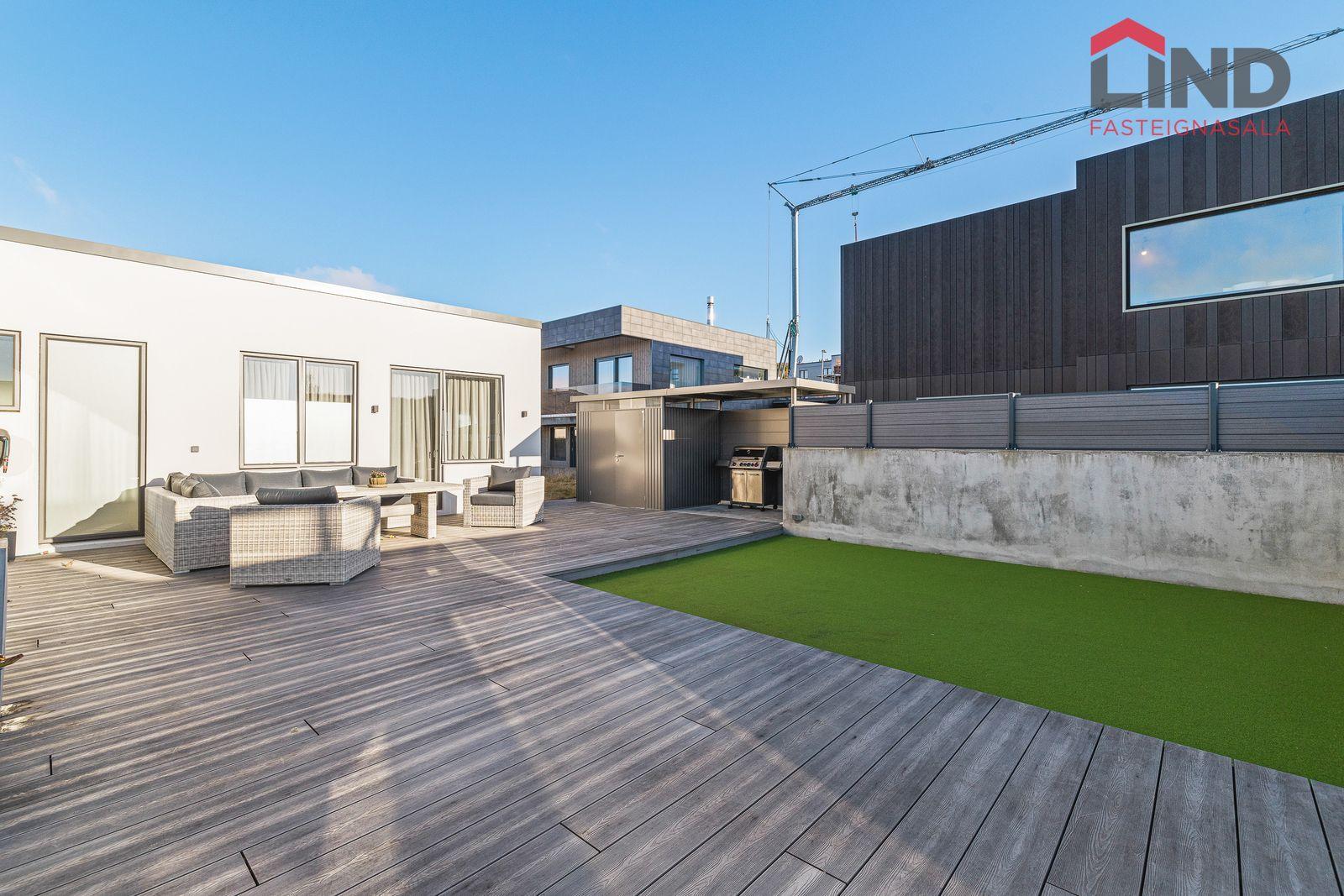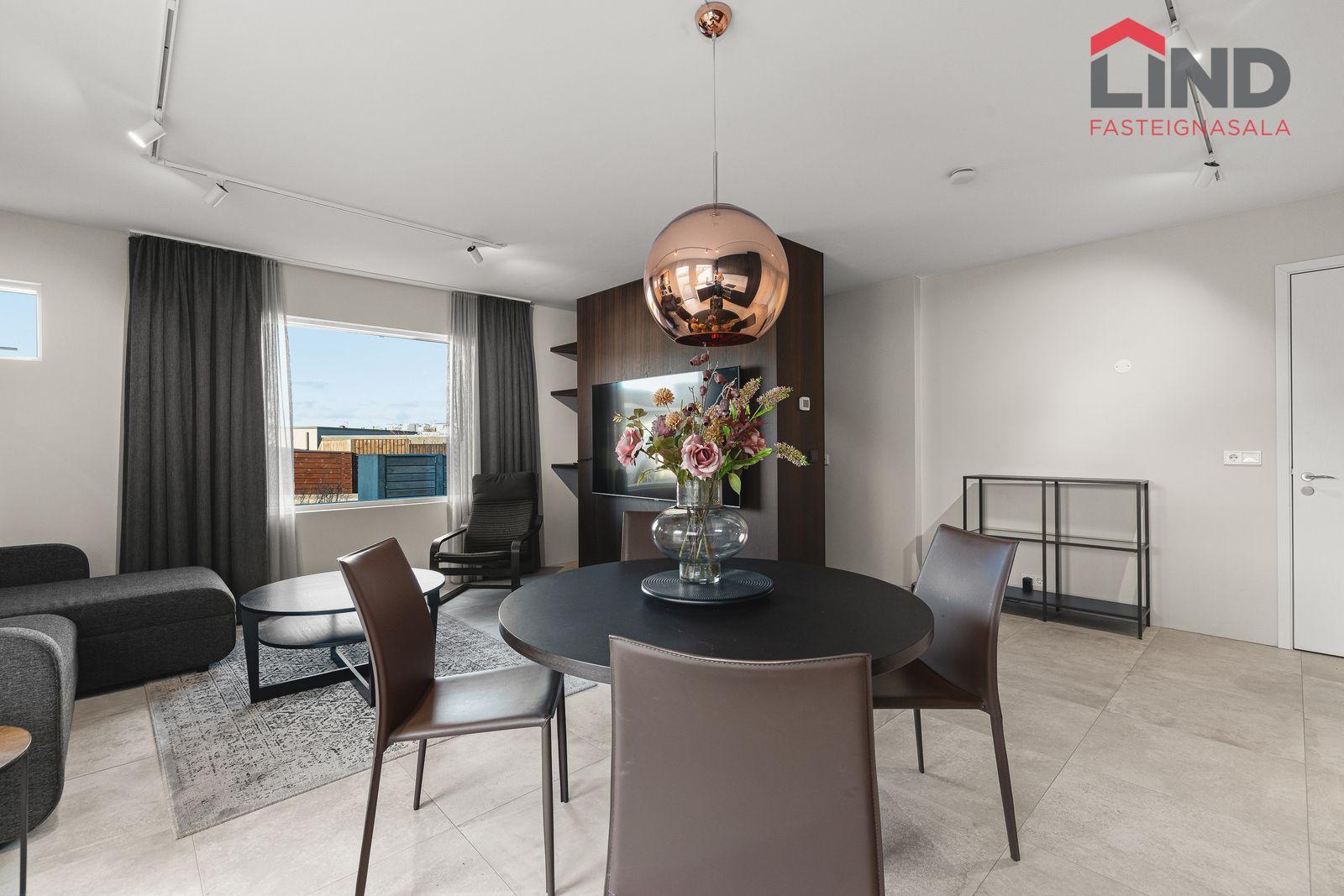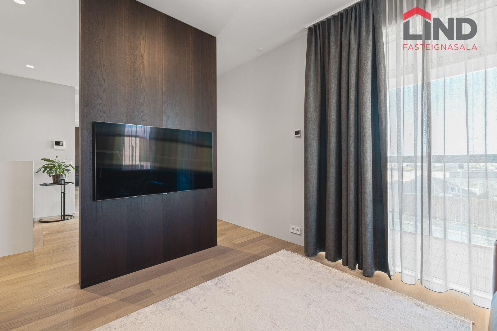 Aðalhæðin (efri hæð): Er vel skipulögð með stórum alrýmum og útgengi á rúmgóðar svalir með afar fallegu útsýni og stóra verönd til suðvesturs. Niðurtekin loft að hluta og innfelld lýsing í loftum. Fallegt útsýni er úr alrými efri hæðar. Glæsileg eldhúsinnrétting úr reyktri eik og steinn á borðum og eldhúseyju. Hjónasvíta með stóru fataherbergi og baðherbergi, 2 svefnherbergi, sjónvarpsstofa og baðherbergi.