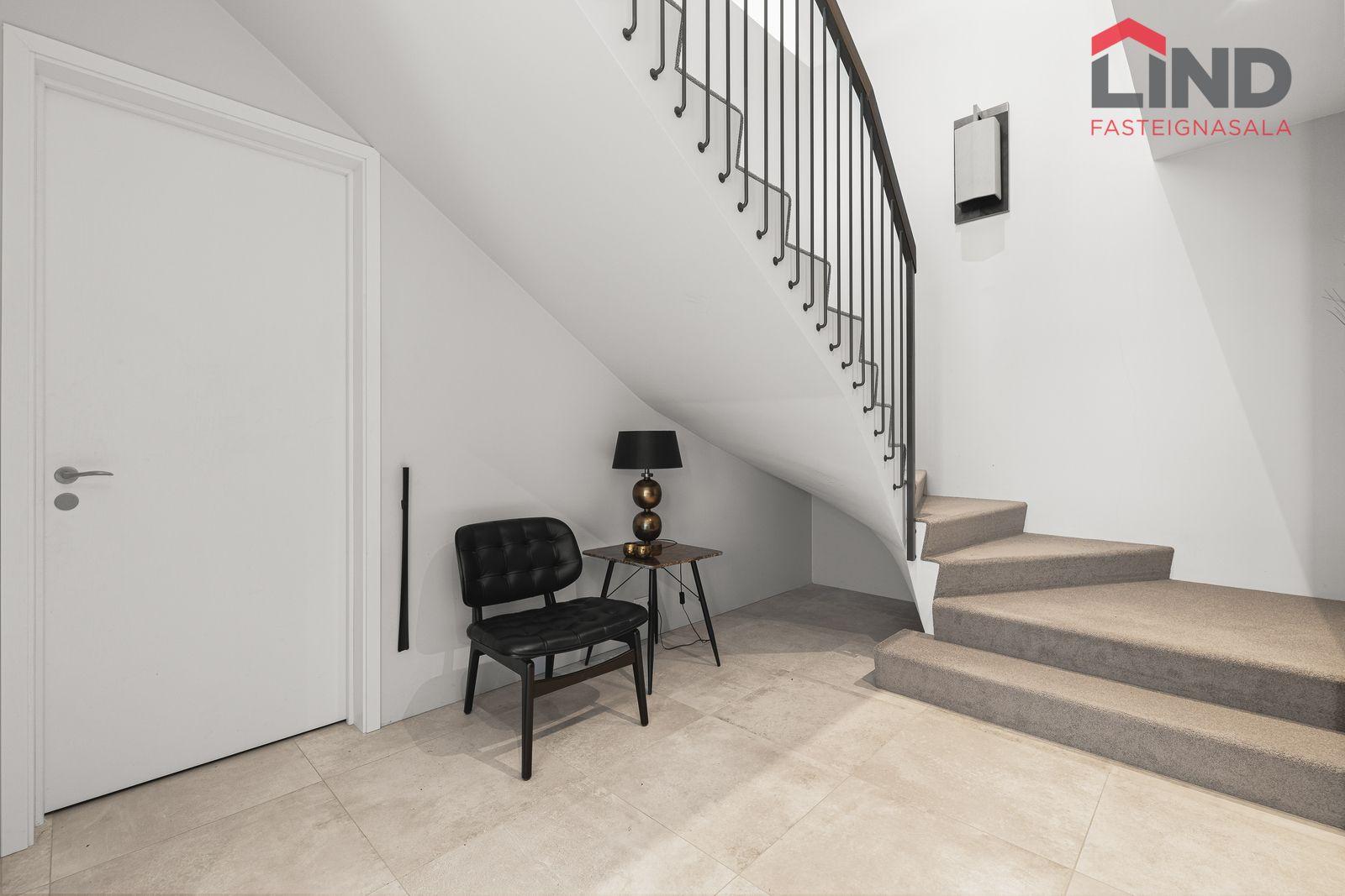 Aðalhæð: Gengið upp steyptan teppalagðan stiga með mikilli lofthæð.