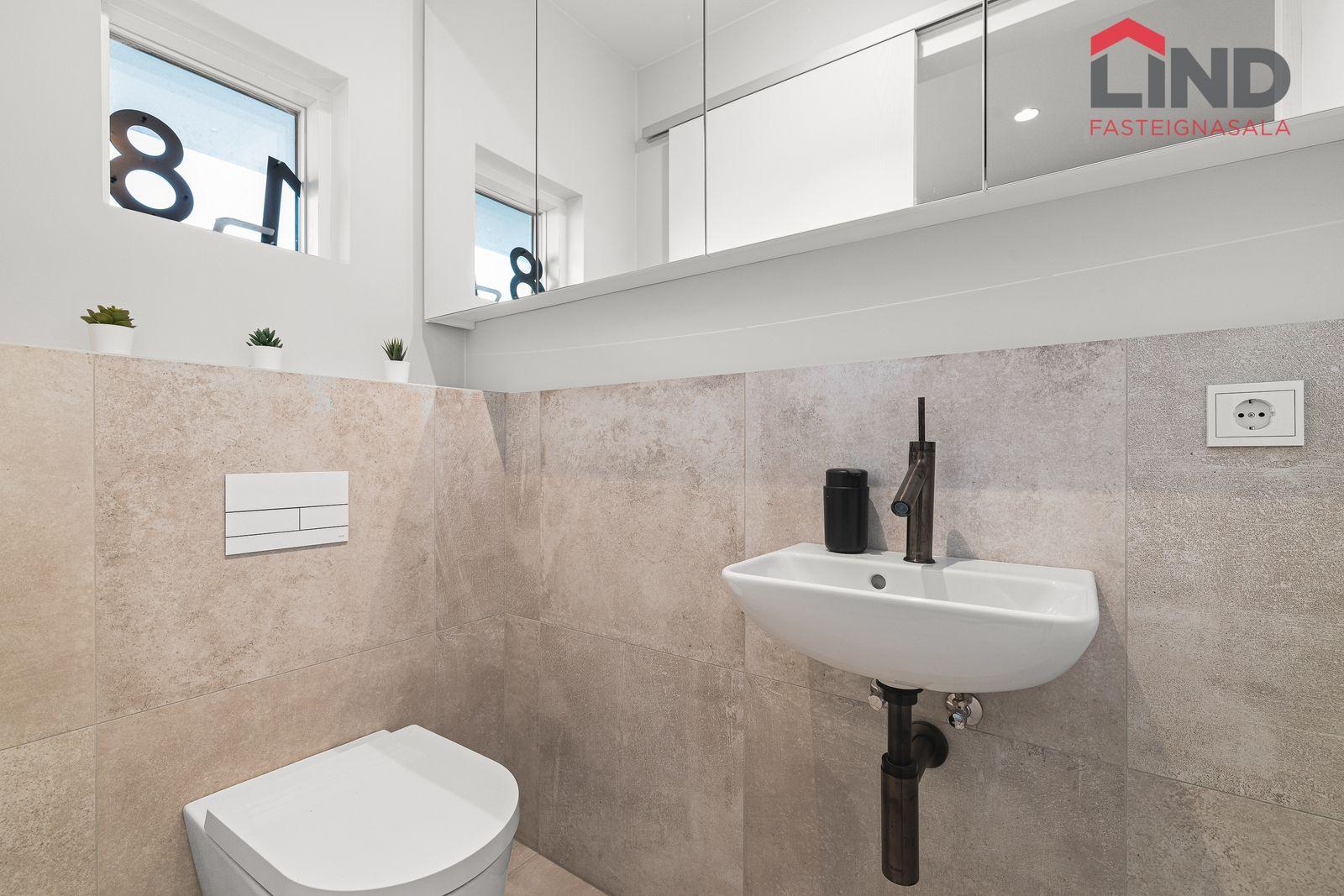 Gestasalerni: Með flísum á gólfi og hluta veggja. Upphengt salerni, vaskur og speglaskápur. Gluggi til norðvesturs.