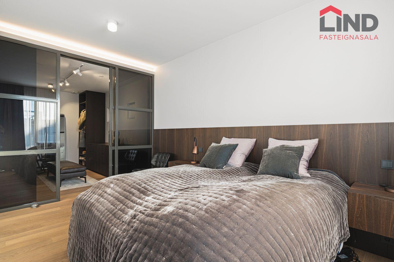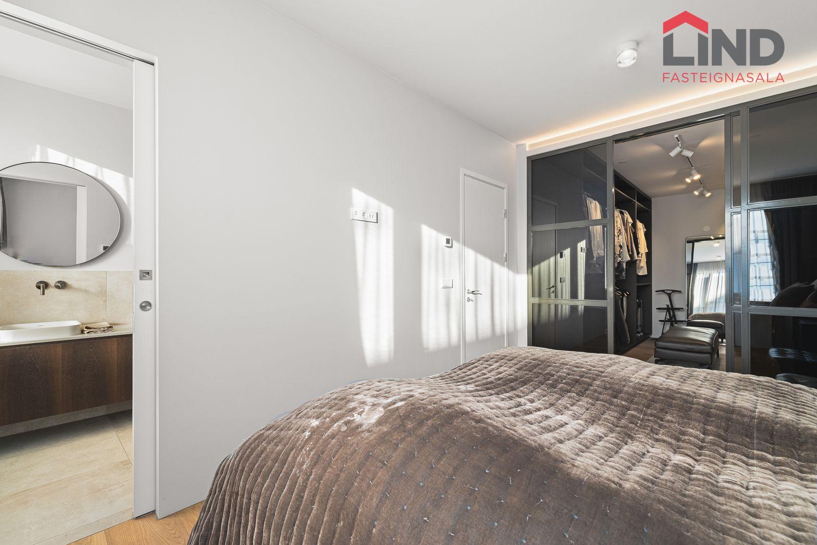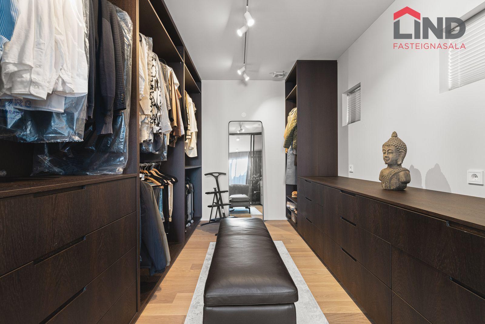 Fataherbergi: Er rúmgott með gegnheilu parketi á gólfi og miklum sérsmíðuðum innréttingu. Falleg sérsmíðuð gler rennihurð milli fataherbergis og hjónaherbergis.