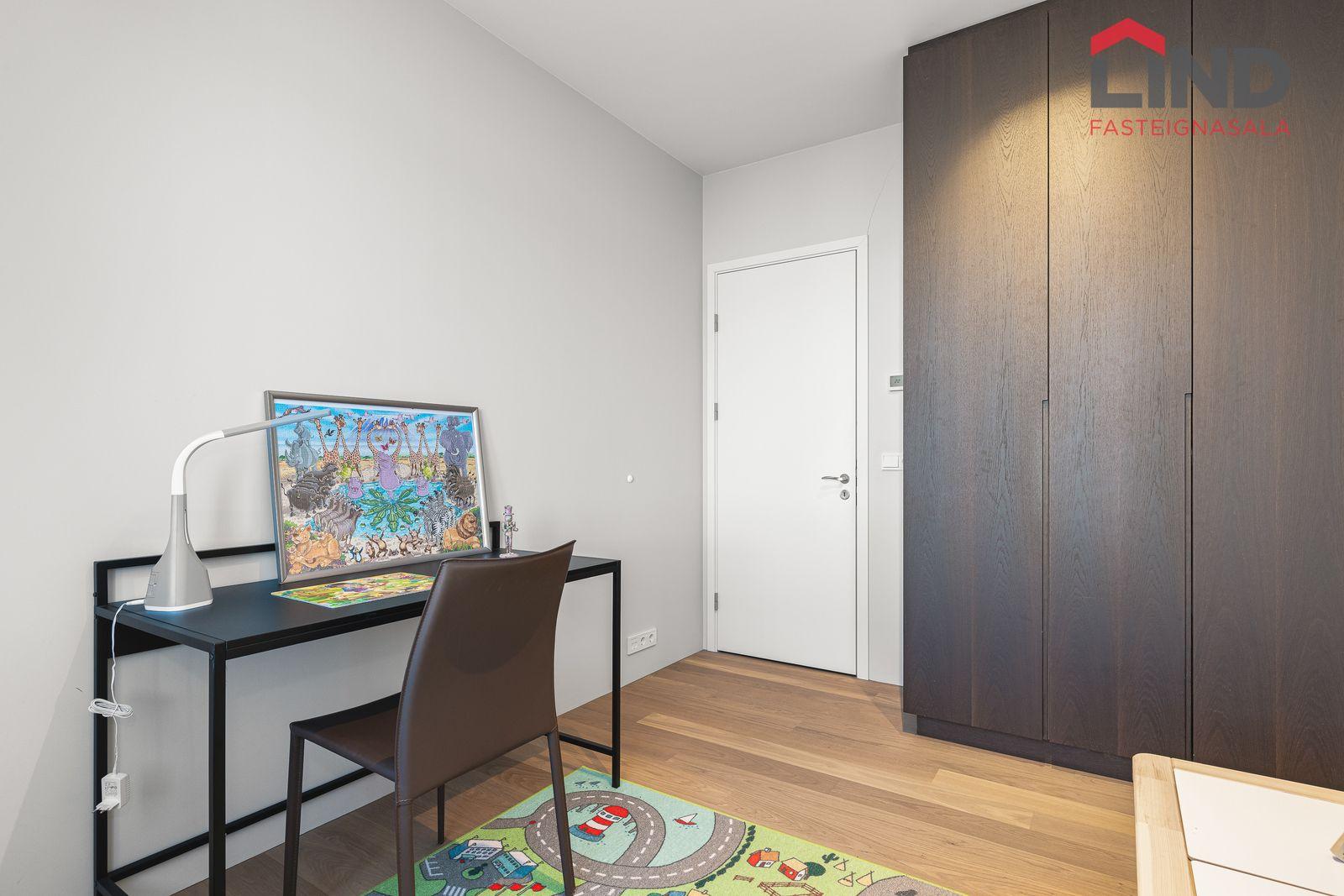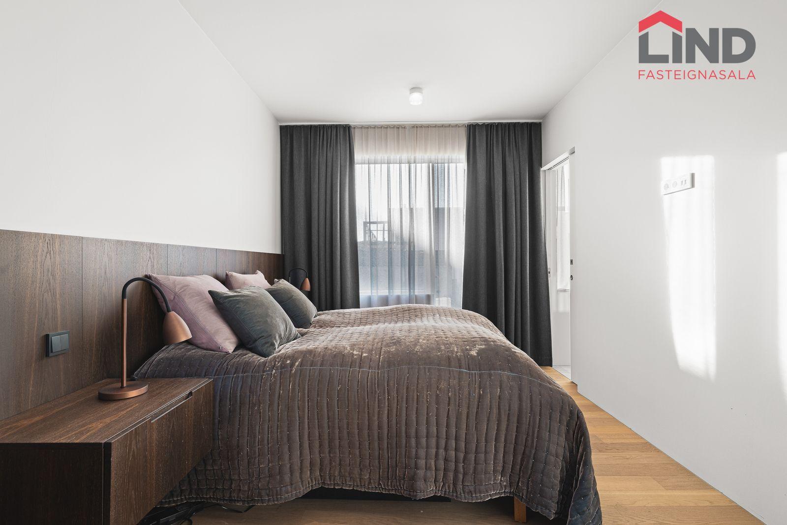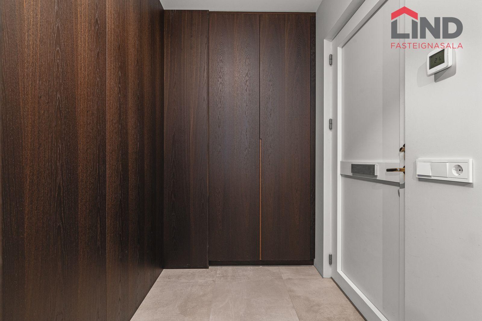 Fataherbergi: Er rúmgott með gegnheilu parketi á gólfi og miklum sérsmíðuðum innréttingu. Falleg sérsmíðuð gler rennihurð milli fataherbergis og hjónaherbergis.