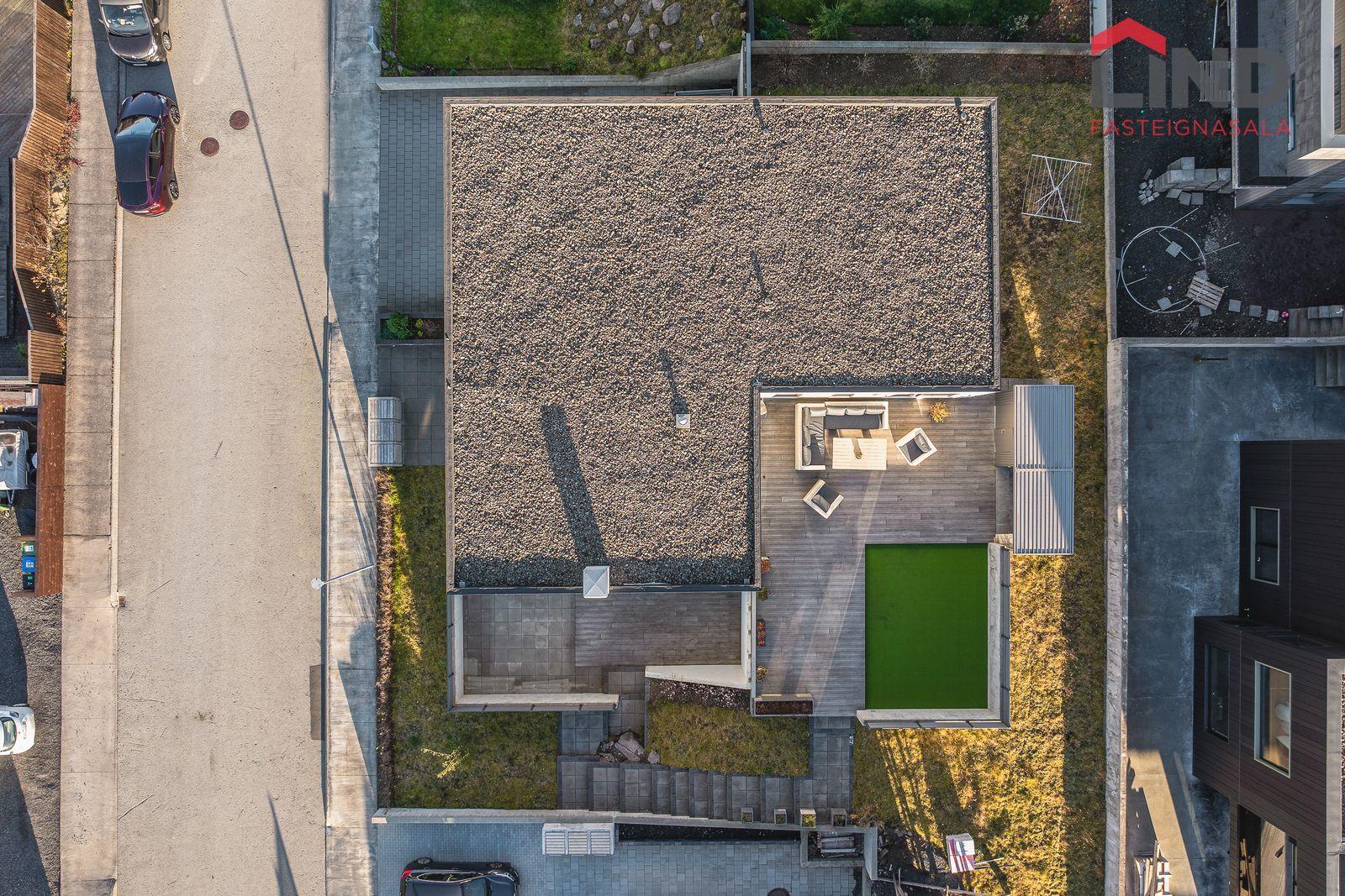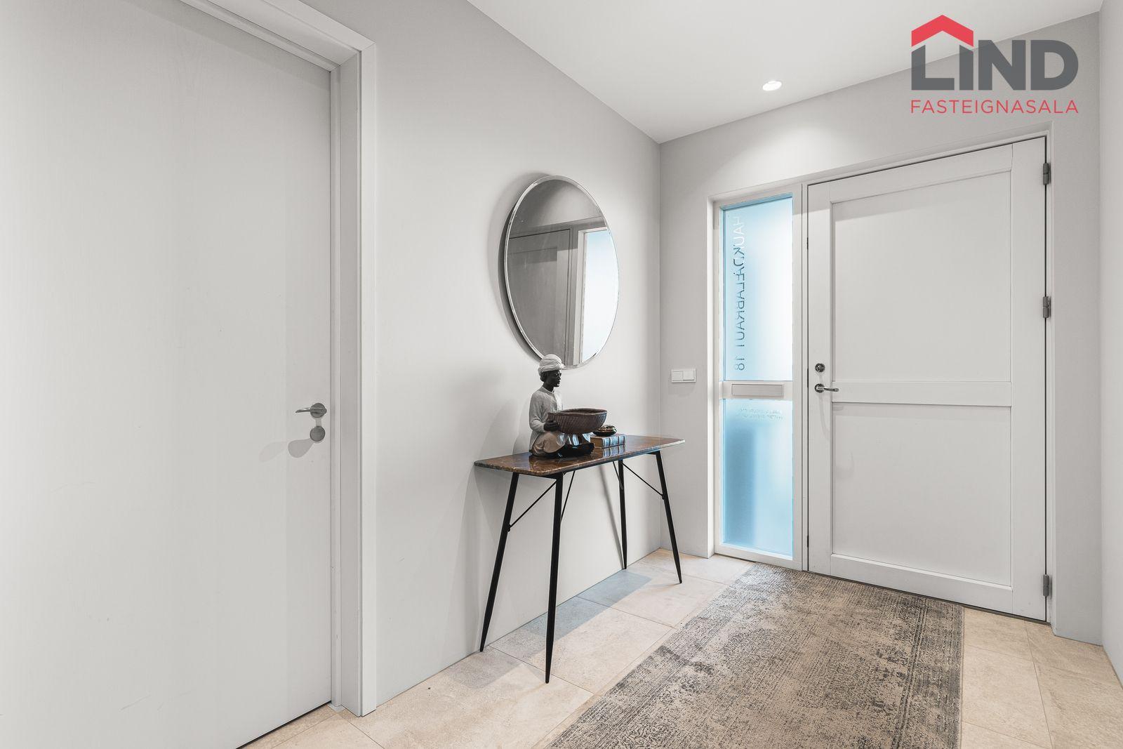 Lind fasteignasala / Heimir Hallgrímsson lögg. fasteignasali kynnir glæsilegt 7 herbergja 296,4 fermetra einbýlishús á tveimur hæðum við Haukdælabraut 18 í Reykjavík. Eignin skiptist í 177,3 fermetra efri hæð, 82,0 fermetra neðri hæð og stóran 37,1 fermetra bílskúr, samtals 296,4 fermetrar að stærð. Auka íbúð er á neðri hæð með sérinngangi sem er 60,0 fermetrar að stærð með forstofu, alrými sem er opið við eldhús, svefnherbergi og baðherbergi með aðstöðu fyrir þvottavél og þurrkara. Þrjú svefnherbergi eru á efri hæð hússins en auðvelt er að breyta sjónvarpsherbergi í fjórða svefnherbergið. Innanhúshönnun var í höndum Halla Friðgeirs.