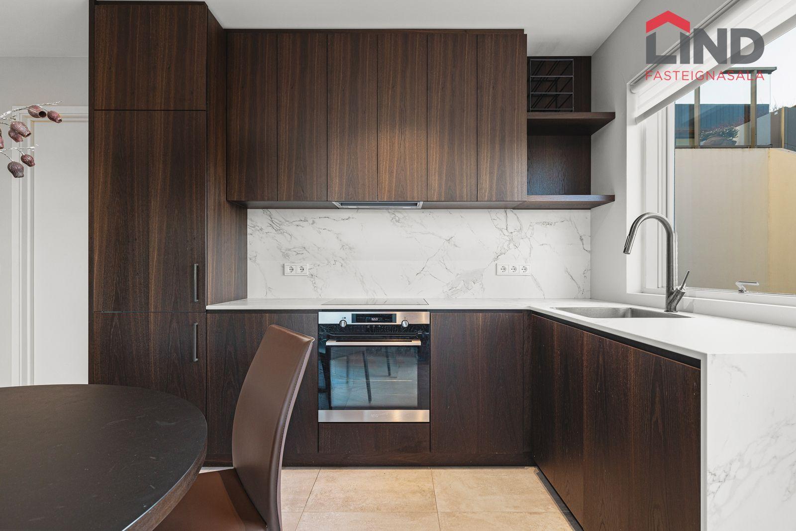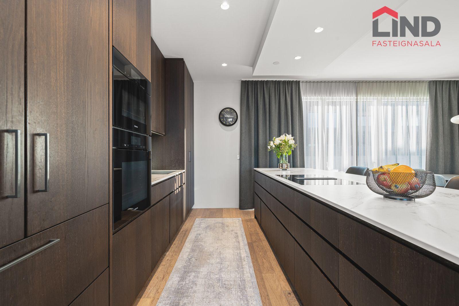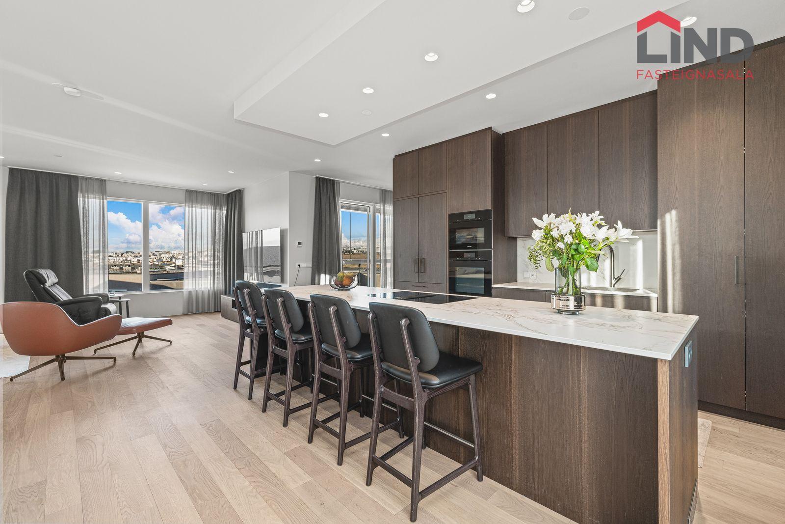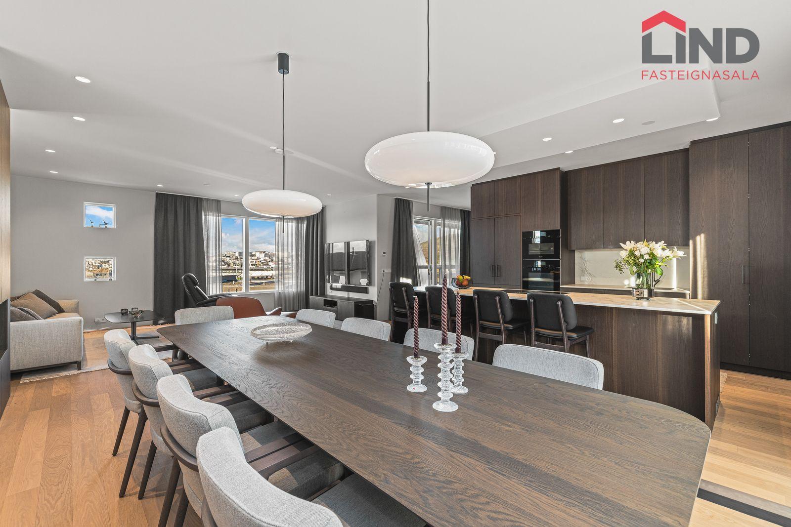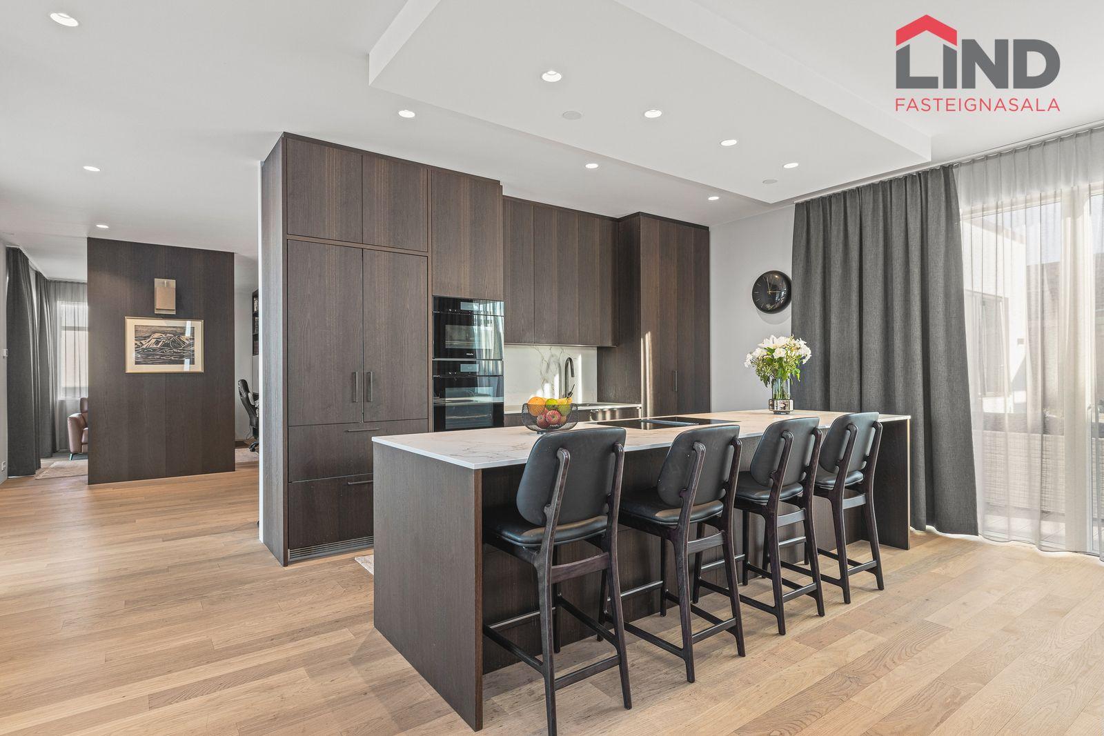 Eldhús II: Er stórt með gegnheilu parketi á gólfi og glæsilegri eldhúsinnréttingu úr reyktri eik og steini á borðum og eldhúseyju. Vönduð eldhústæki frá Miele, m.a. tveir ofnar, innb. uppþvottavél, spansuðu helluborð, stór innb. tvöfaldur kæliskápur með tveimur frysti skúffum. Niðurtekið loft með innf. lýsingu fyrir ofan eldhúseyju.