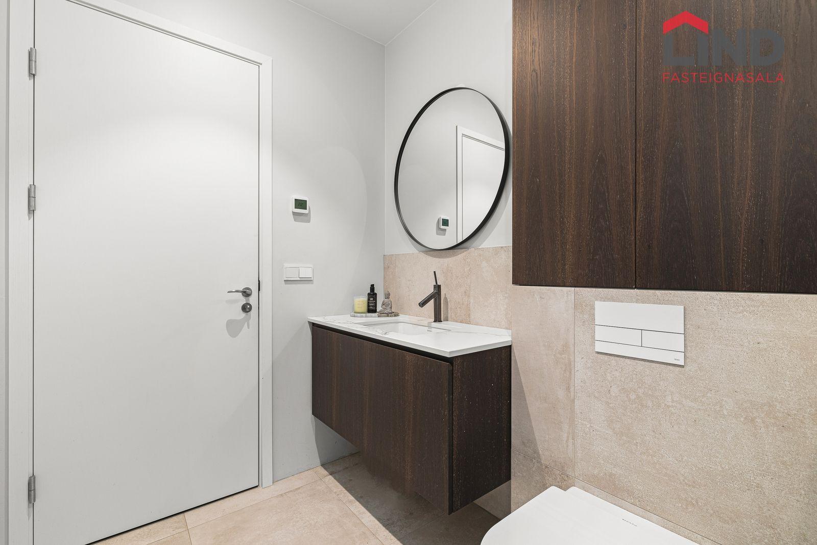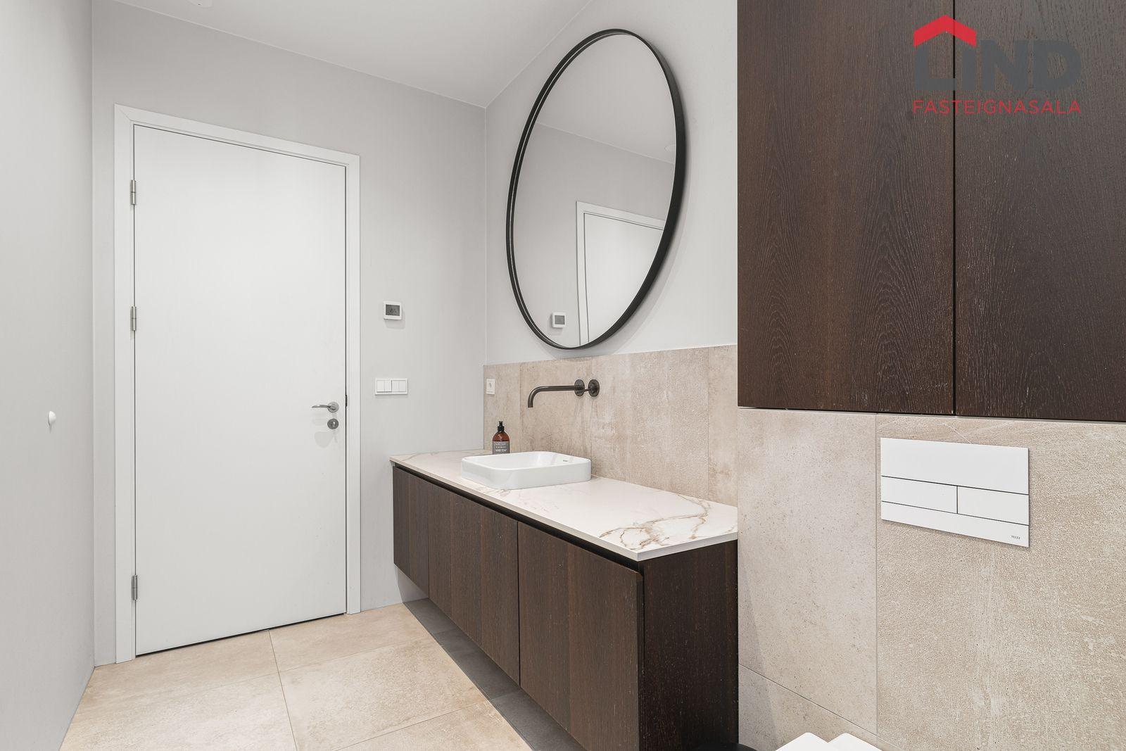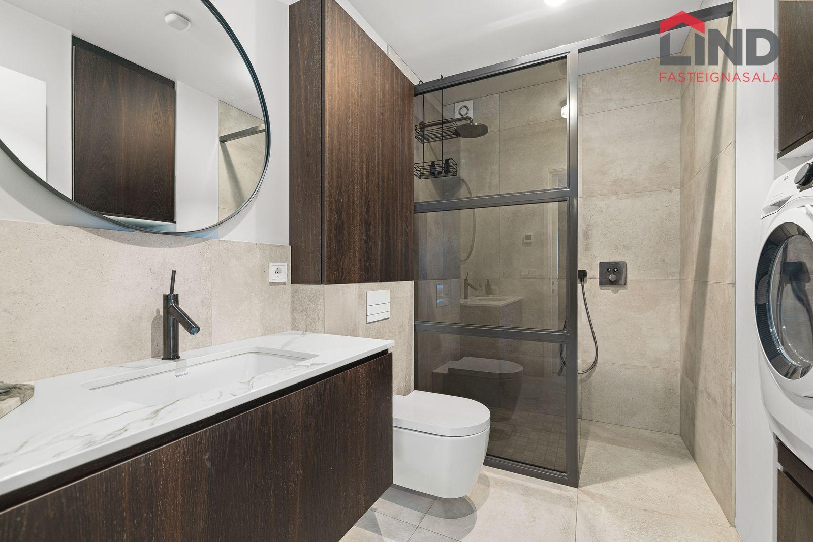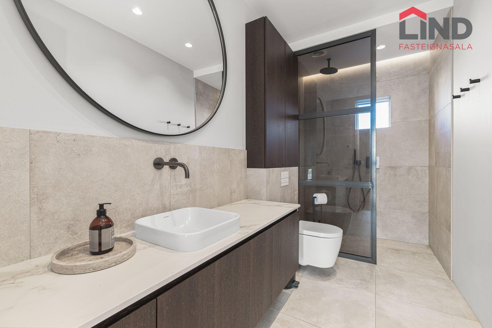 Baðherbergi I: Með flísum á gólfi og hluta veggja. Sérsmíðuð innrétting við vask með steini á borði. Flísalögð sturta með glerþili og innb. Axor blöndunartækjum. Upphengt salerni, tengi fyrir þvottavél og þurrkara inn í innréttingu og góðir skápar.