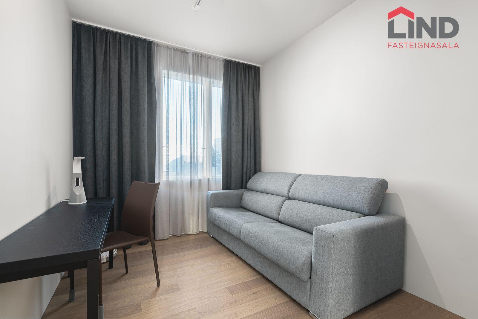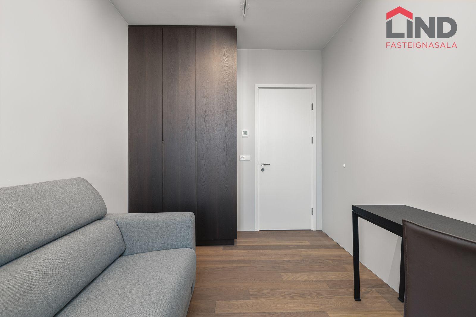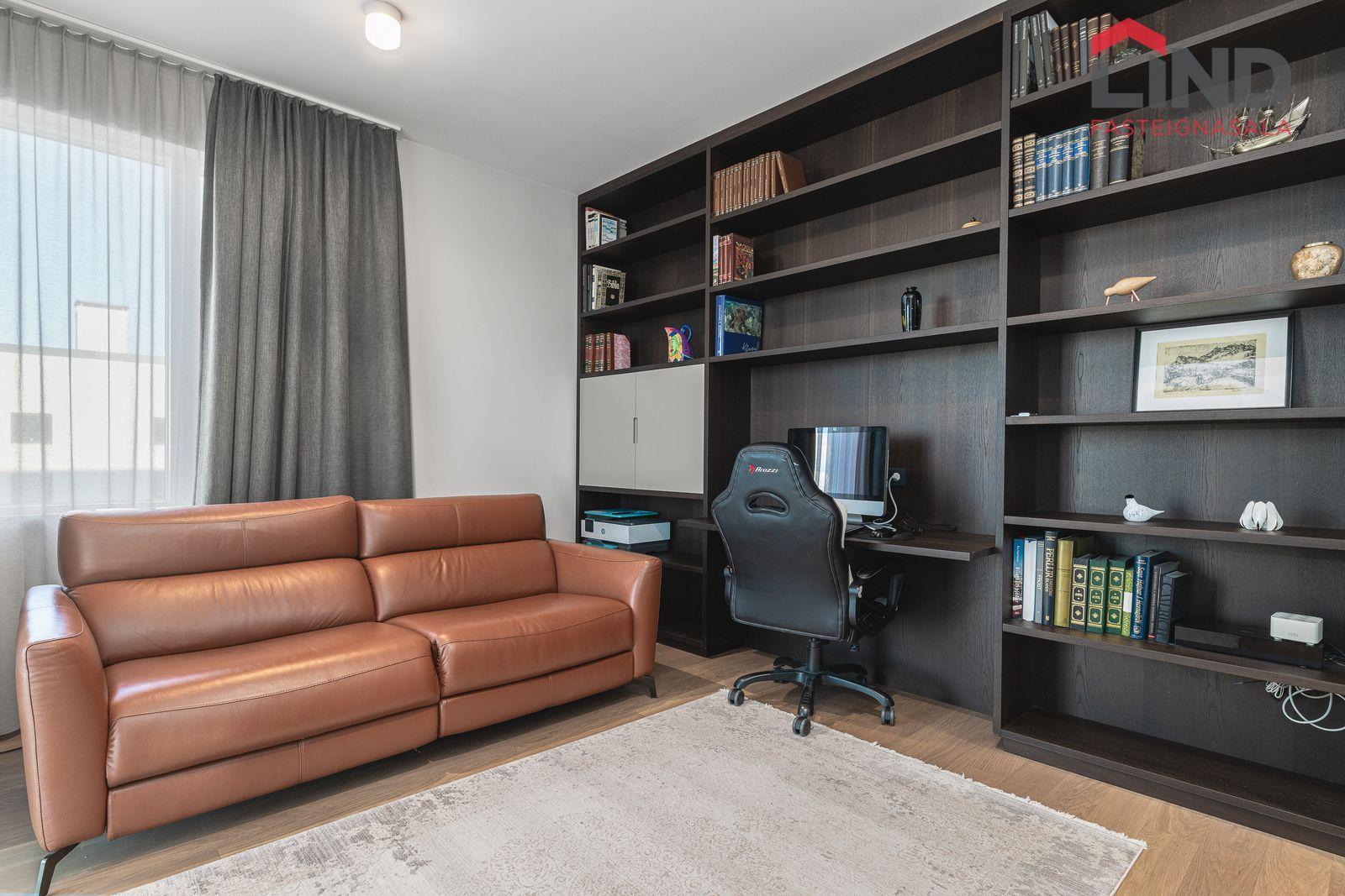 Sjónvarpsstofa (möguleiki að breyta í svefnherbergi): Með gegnheilu parketi á gólfi og fallegum panel klæddum vegg úr reyktri eik. Gólfsíðir gluggar til norðvesturs og gluggi til norðausturs. Sérsmíðaðar hillur úr reyktri eik á heilan vegg.