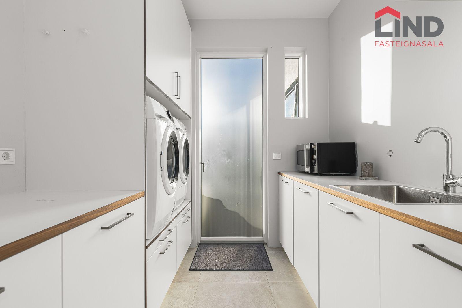 Neðri hæð: Komið er inn í stóra forstofu með miklu skápaplássi og gestasalerni. Stórt hol þar sem gengið er upp fallegan steyptan stiga með stál handirði. Innangengt þaðan inn í bílskúr og auka íbúð. Auka íbúð er 60,0 fermetrar og er öll með sérsmíðuðum innréttingum frá Heggi smíðaverkstæði.