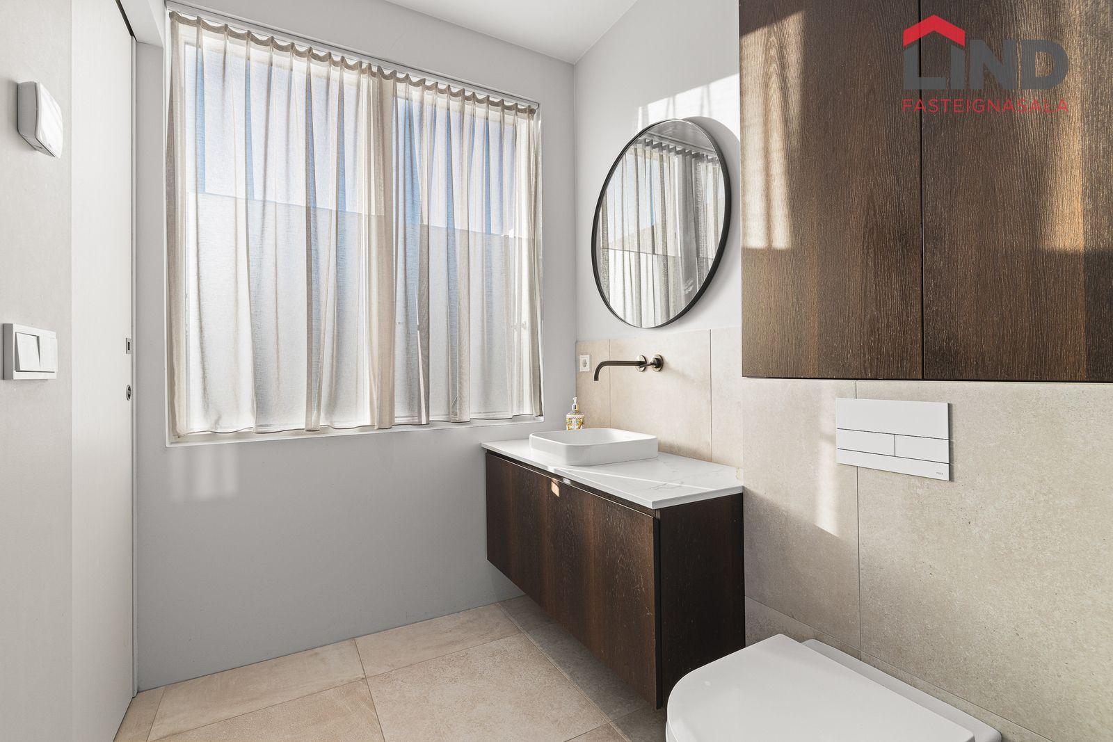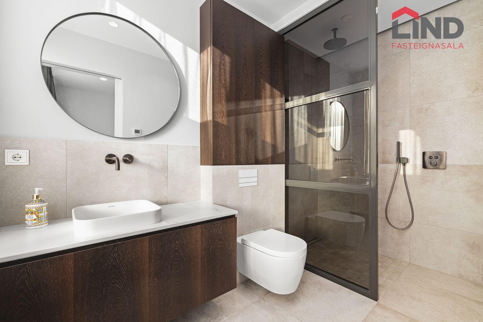 Baðherbergi II: Með flísum á gólfi og hluta veggja. Flísalögð sturta með glerþili og innb. Axor blöndunartækjum. Innf. lýsing í lofti. Sérsmíðuð innrétting með steini á borðum við vask. Upphengt innb. salerni og gluggi til suðvesturs.