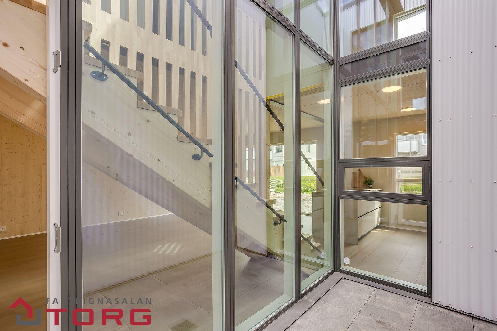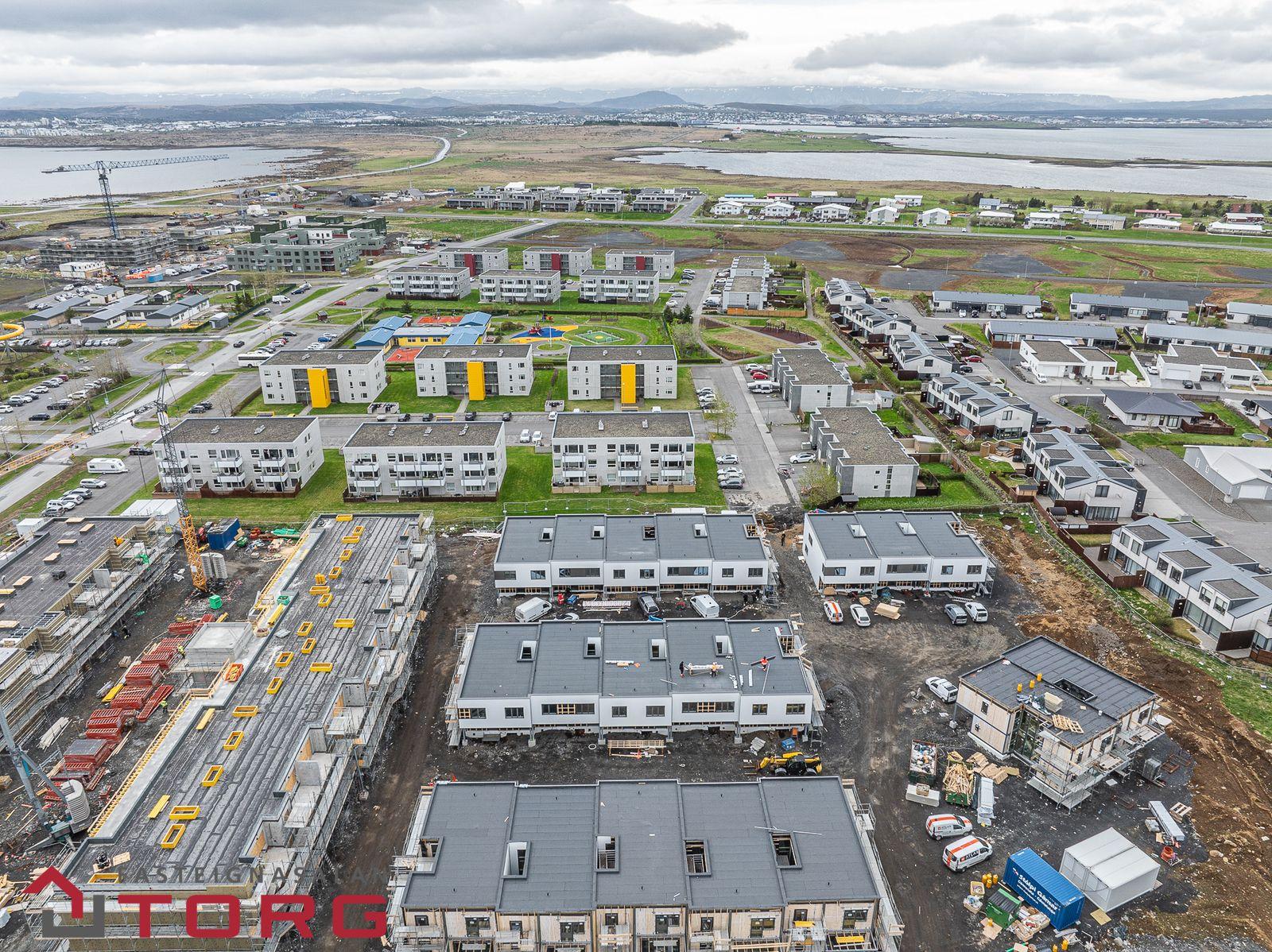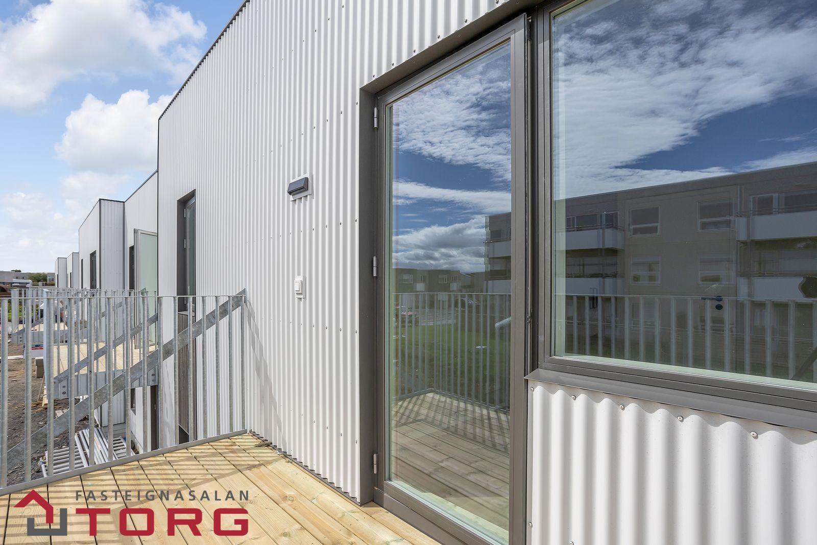 Útveggir raðhúsa eru úr CLT krosslímdum timbureiningum, einangraðir að utan og klæddir með viðhaldslítilli álbáru í hvítum lit og timbri á völdum stöðum í gráum lit sem sameina fallegt útlit, endingu og þol gagnvart íslenskri veðráttu. Þök á húsunum eru einhalla úr CLT einingum með pappalagi, einangrun og ásoðin tvö pappalög. Þak er frágengið með úthagatorfi. Svalir og svalahandrið eru úr heitgalvaniseruðu stáli. Gluggar eru verksmiðjuframleiddir ál-timbur gluggar frá danska framleiðandanum Rationel með slitinni kuldabrú. Gler er tvöfalt k-einangrunargler. Útihurðir eru einnig frá Rationel. Utanhúss lýsing er samkvæmt teikningum raflagnahönnuðar. Vönduð led útilýsing er undir milliplötu við aðkomu/bílastæði. Útilýsing er á vegg í inngarði og garði ásamt útitengli. Ídráttarleið er fyrir rafhleðslustöð frá aðaltöflu að útvegg við aðkomu/bílastæði. Ídráttarrör fyrir rafmagn er frá aðaltöflu að verönd. Lóð umhverfis húsið verður jöfnuð í rétta hæð og þökulögð. Bílastæði og aðkoma verða hellulögð. Inngarður er frágengin með hellum. Snjóbræðsla er í bílaplani, aðkomu og inngarði. Sólpallur/verönd/skjólveggur fylgir ekki. Ídráttarrör fyrir vatnslögn er frá inntaksgrind að verönd.