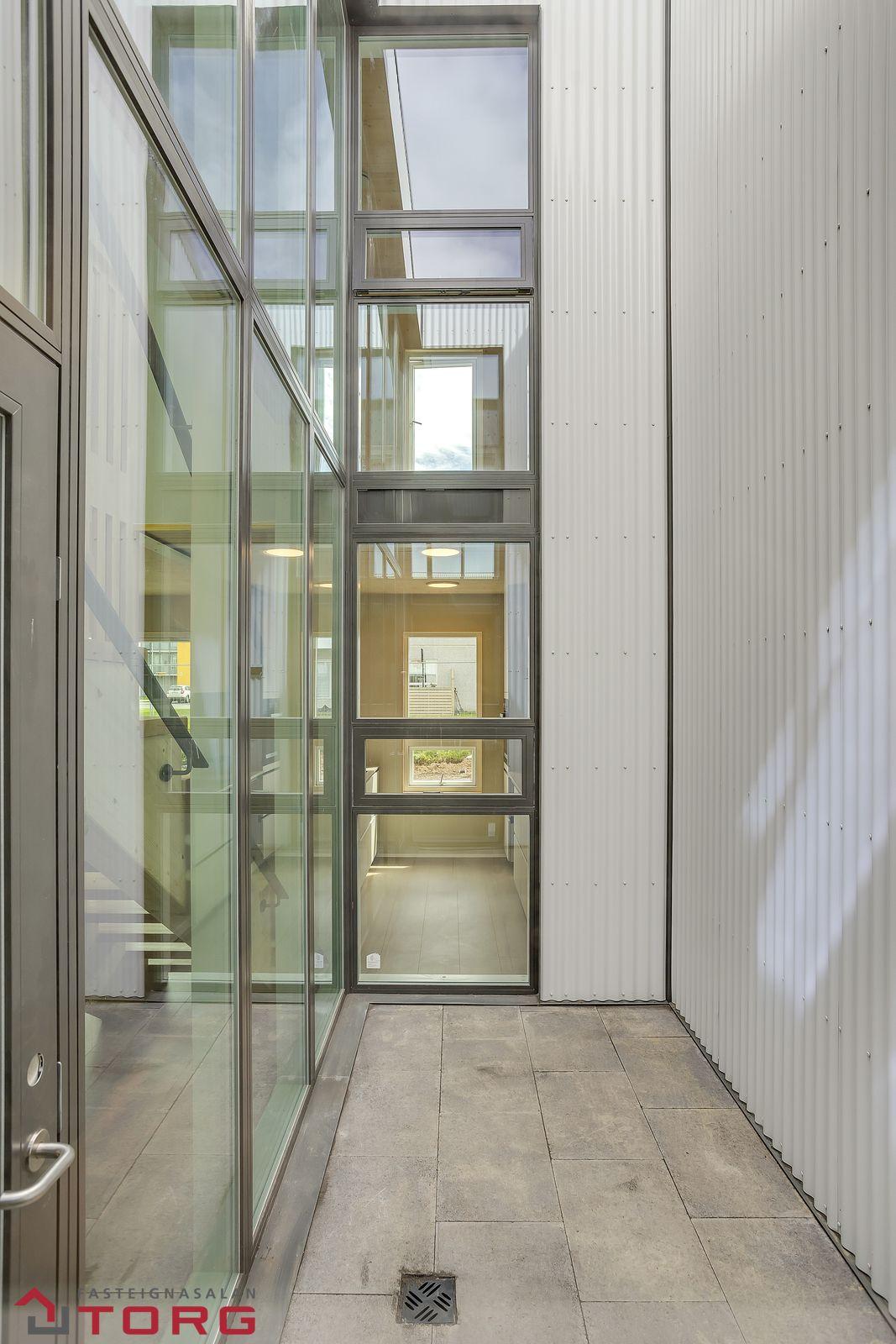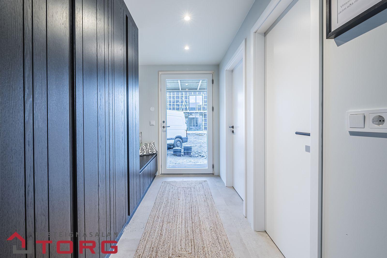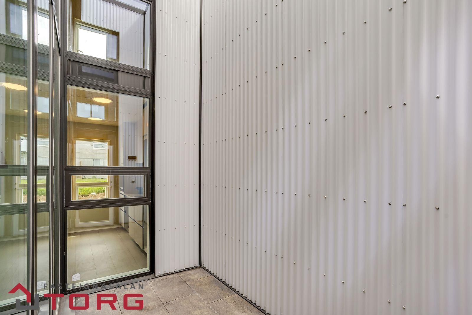 Útveggir raðhúsa eru úr CLT krosslímdum timbureiningum, einangraðir að utan og klæddir með viðhaldslítilli álbáru í hvítum lit og timbri á völdum stöðum í gráum lit sem sameina fallegt útlit, endingu og þol gagnvart íslenskri veðráttu. Þök á húsunum eru einhalla úr CLT einingum með pappalagi, einangrun og ásoðin tvö pappalög. Þak er frágengið með úthagatorfi. Svalir og svalahandrið eru úr heitgalvaniseruðu stáli. Gluggar eru verksmiðjuframleiddir ál-timbur gluggar frá danska framleiðandanum Rationel með slitinni kuldabrú. Gler er tvöfalt k-einangrunargler. Útihurðir eru einnig frá Rationel. Utanhúss lýsing er samkvæmt teikningum raflagnahönnuðar. Vönduð led útilýsing er undir milliplötu við aðkomu/bílastæði. Útilýsing er á vegg í inngarði og garði ásamt útitengli. Ídráttarleið er fyrir rafhleðslustöð frá aðaltöflu að útvegg við aðkomu/bílastæði. Ídráttarrör fyrir rafmagn er frá aðaltöflu að verönd. Lóð umhverfis húsið verður jöfnuð í rétta hæð og þökulögð. Bílastæði og aðkoma verða hellulögð. Inngarður er frágengin með hellum. Snjóbræðsla er í bílaplani, aðkomu og inngarði. Sólpallur/verönd/skjólveggur fylgir ekki. Ídráttarrör fyrir vatnslögn er frá inntaksgrind að verönd.