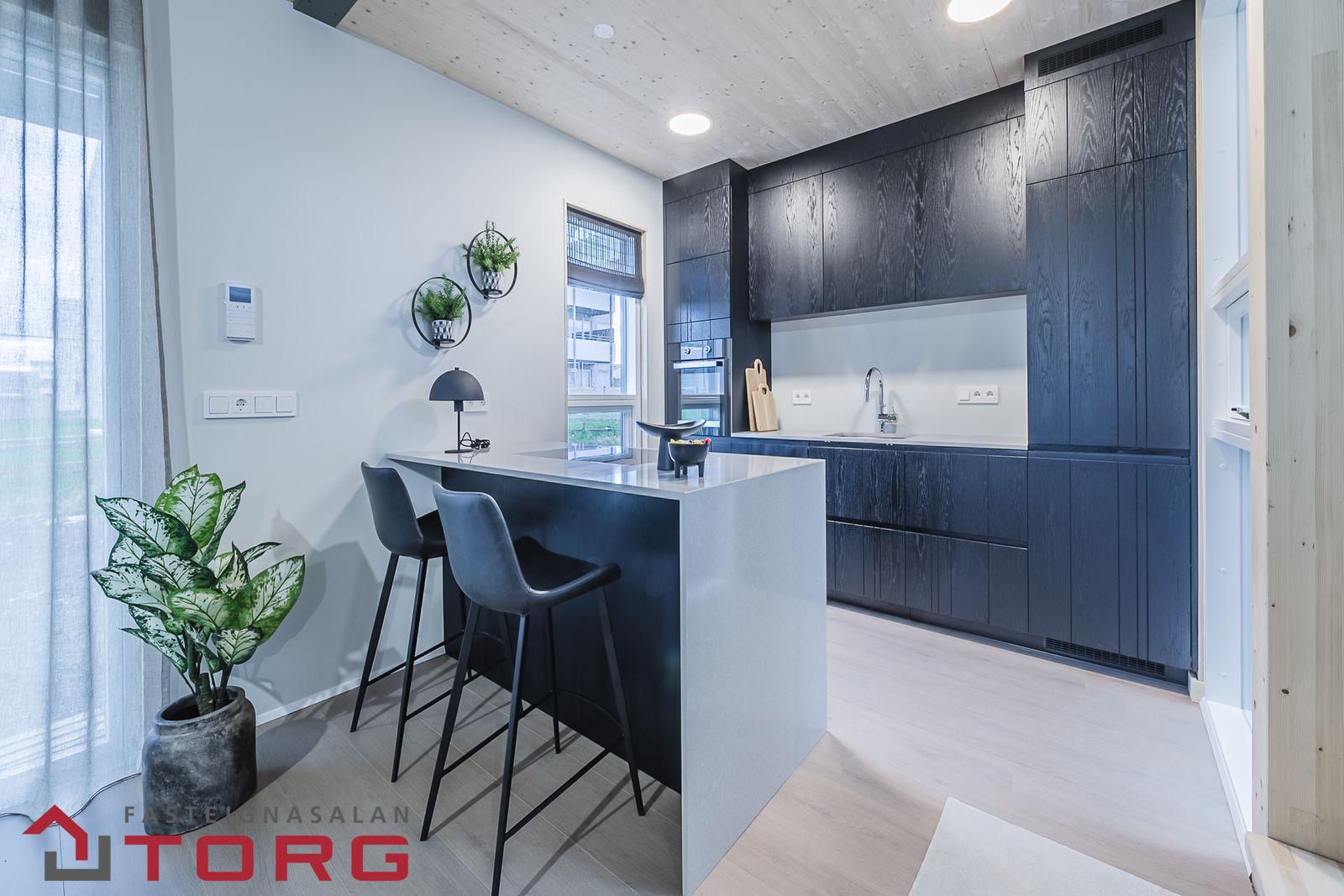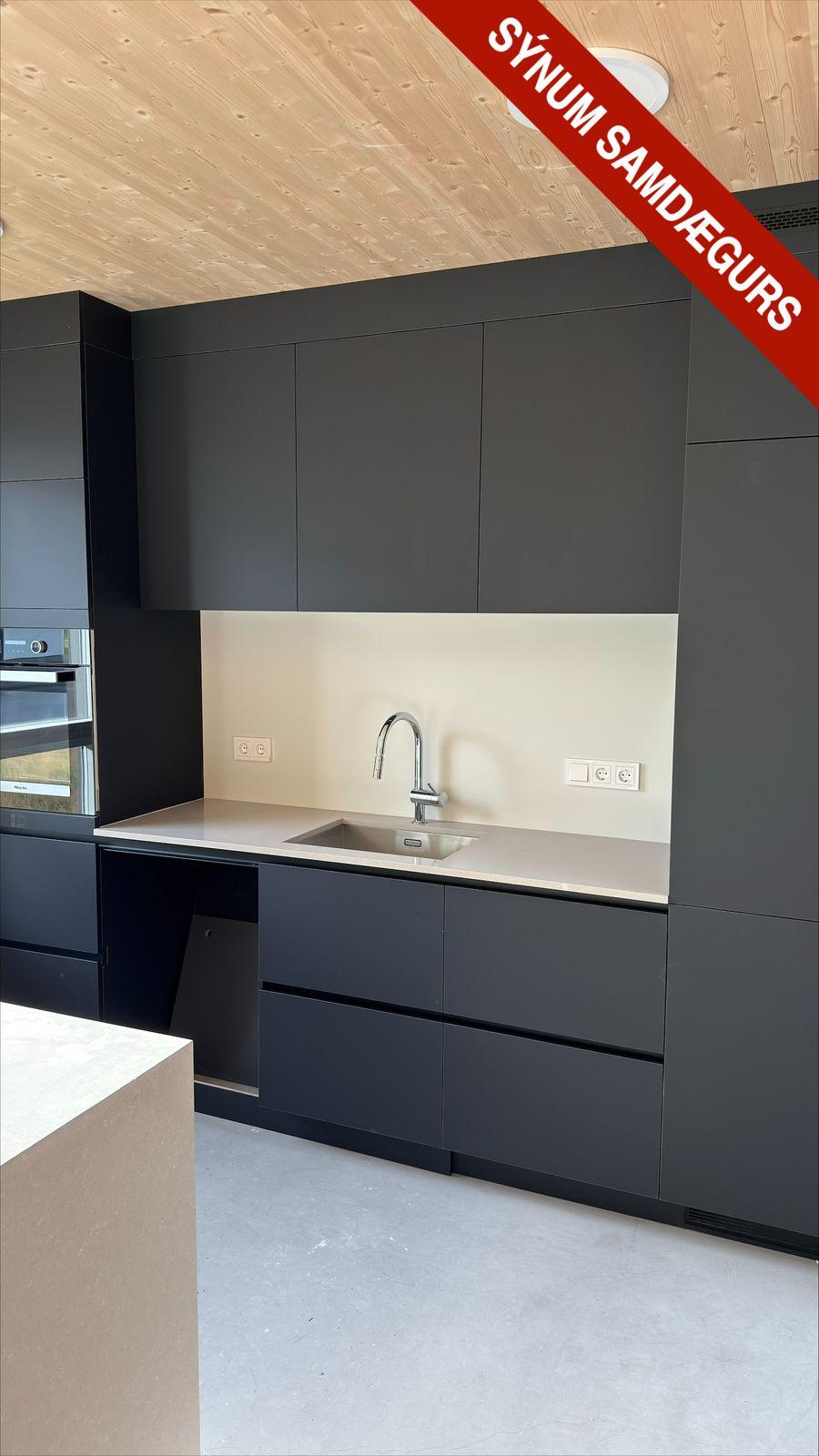 Eldhúsnnrétting og eldunareyja eru frá innréttingarframleiðandanum VOKE-3 og eru í ljósum eða dökkum lit skv. vali kaupanda. Eldhús skilast með veggofni og spanhelluborði. Íbúðum er skilað til kaupanda án gufuhleypis, kæli-/frystiskáps og uppþvottavélar. Baðherbergi á neðri hæð er með sturtu og skilast með sturtugleri. Baðherbergi á efri hæð er með baðkari og sturtu, á milli sturtu og baðkars kemur veggur ásamt gleri til afskermingar.