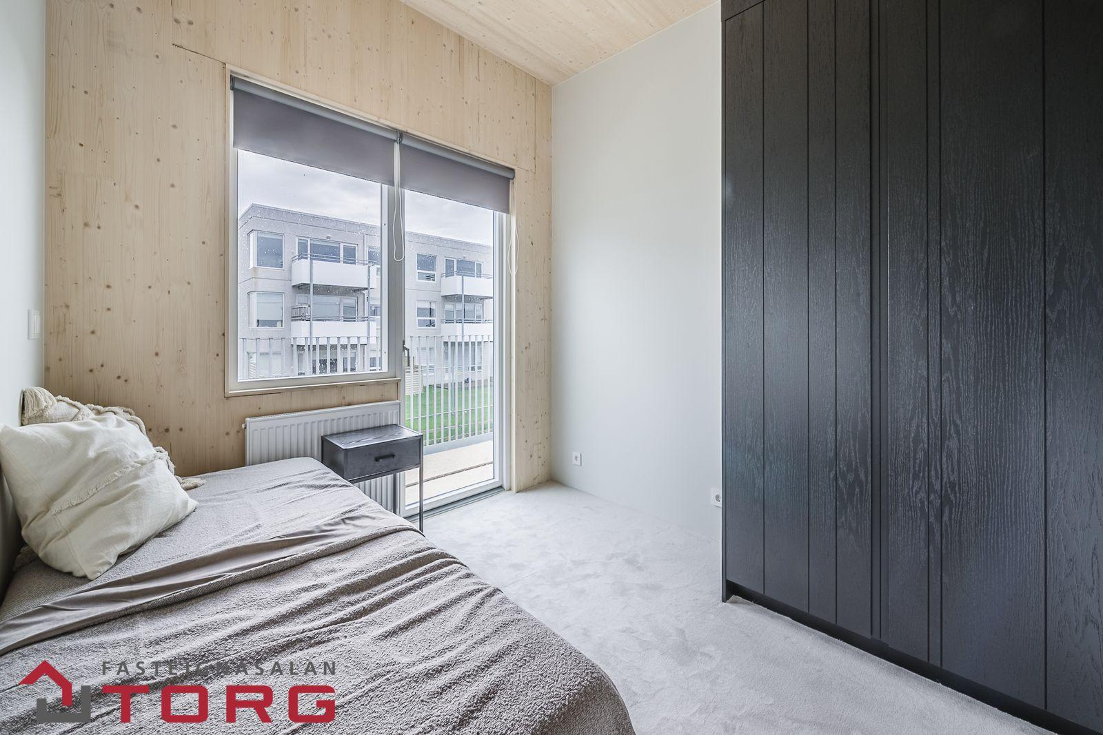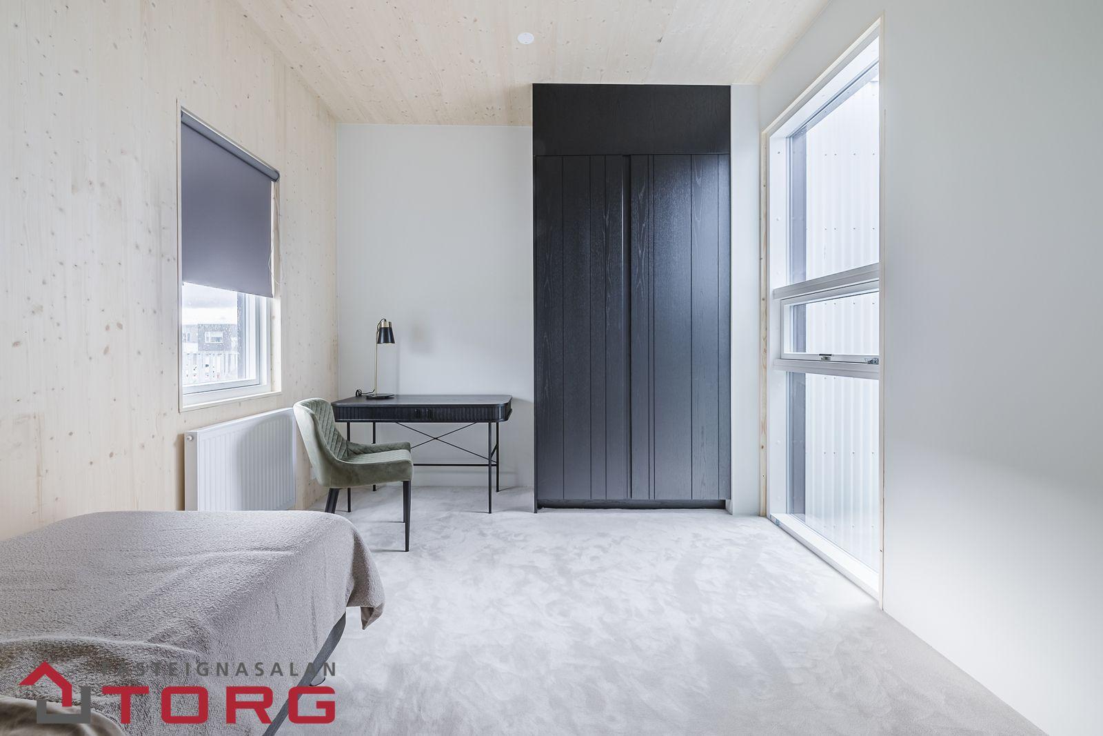 Búið er að innrétta húsið og setja upp fimmta svefnherbergið, þar sem sjónvarpsstofa er sýnd á teikningu. Dökk : Perfect Matte Laminated MDF (Egger U999 PM)
