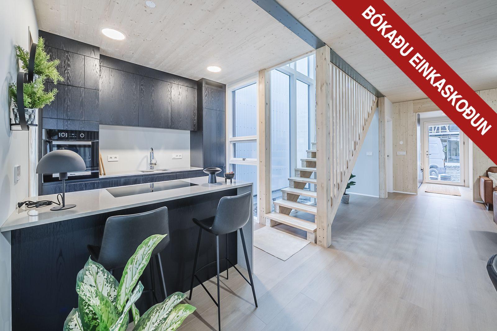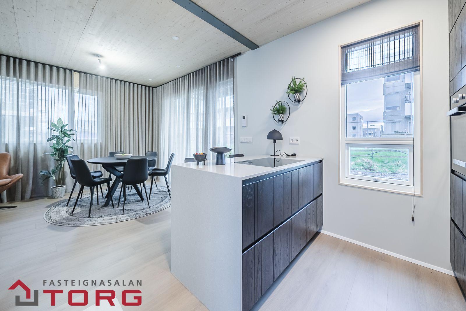 Íbúðum er skilað fullbúnum með innréttingum samkvæmt skilalýsingu en án gólfefna að undanskildu anddyri, baðherbergjum, þvottahúsi og geymslu innan íbúðar sem eru flísalögð. Allar innréttingar eru sérsmíðaðar frá VOKE-3. Gólfhiti er á neðri hæð, á efri hæð er hefðbundið ofnakerfi en gólfhiti á baðherbergi. Útveggir og hluti innveggja innan íbúða eru úr krosslímdum timbureiningum (CLT) , yfirborð þeirra verður annarsvegar sýnilegt CLT (langveggur í stofu og aðliggjandi veggur móts við stofu ásamt gluggavegg í samliggjandi svefnherbergjum á efri hæð) og hins vegar gifsklætt, spartlað og málað. Allt sýnilegt CLT er ómeðhöndlað. Aðrir innveggir eru úr blikkstoðum, klæddir með gifsi og eru spartlaðir og málaðir. Veggir eru málaðir í ljósum lit. Veggir á böðum sem verða flísalagðir eru klæddir baðplötum. Timbur límtréssúlur við inngarð eru sýnilegar og ómeðhöndlaðar. Loft eru sýnileg úr ómeðhöndluðum krosslímdum timbureiningum nema í anddyri, geymslum, baðherbergjum og þvottahúsi þar sem verður niðurtekið loft máluð í ljósum lit. Stálbitar í loftum eru sýnilegir í hvítum lit, ral 9016. Hurðir eru hefðbundnar yfirfelldar hurðir. Innihurðir eru sprautulakkaðar hvítar, frá Ebson eða sambærilegt. Gólf á baðherbergjum, þvottahúsi, anddyri og geymslu innan íbúðar eru flísalögð með gæðaflísum í ljósgráum lit stærðinni 60x60cm. Öðrum rýmum íbúðar er skilað án gólfefna.