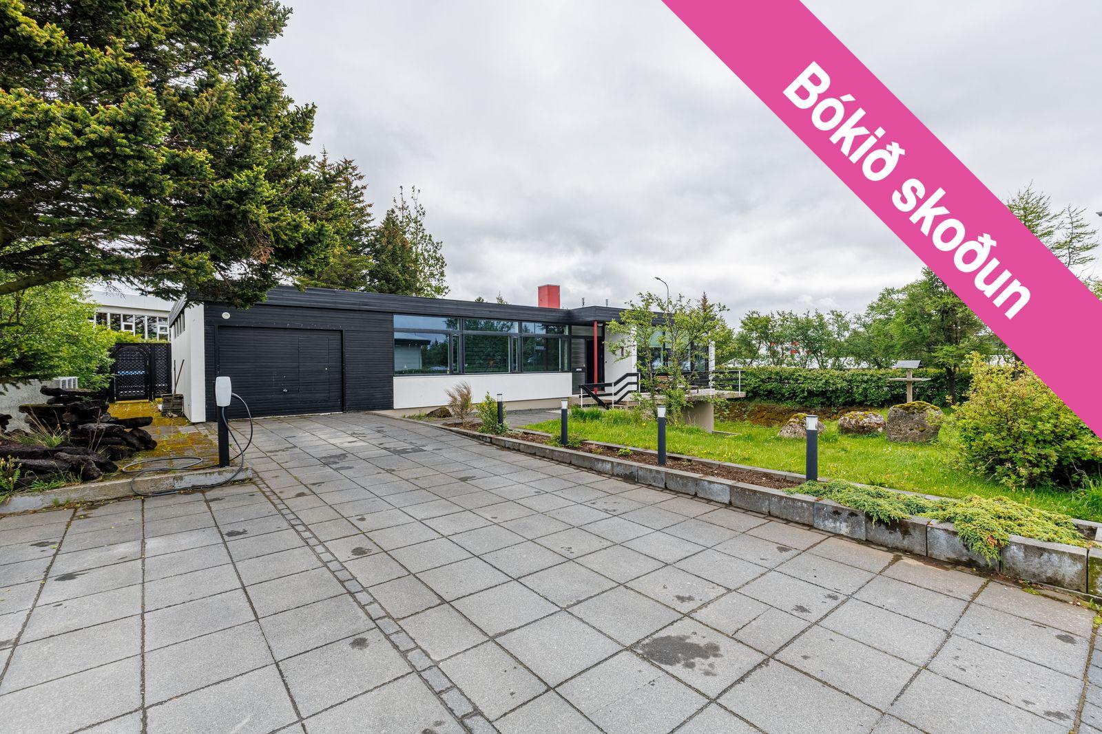 CROISETTE - KNIGHT kynnir eignina Þrastahraun 2, 220 Hafnarfjörður. Eignin er alls 244,2 fm að stærð sem skiptist þannig að efri hæðin er 155,3 fm, neðri hæðin (aukaíbúð) 62,7 fm og bílskúrinn 26,2 fm sem er innréttaður sem stúdíóíbúð. Fallegt hús í fúnkísstíl á hornlóð á þessum vinsæla stað í Hafnarfirði sem er með fimm svefnherbergi í heildina. Stórt og opið eldhús með aðgengi á stóra verönd. Mjög bjart og fallegt hús með mikilli náttúrlegri lýsingu. Hús sem er búið að endurnýja mikið í s.l. ár. og er í mjög góðu ástandi. Allar nánari upplýsingar veita Karl Lúðvíksson, löggiltur fasteignasali í s. 663-6700 eða kalli@croisette.is og Styrmir Bjarur Karlsson löggiltur fasteignasali í S: 899-9090 eða styrmir@croisette.isSMELLTU HÉR TIL AÐ FÁ SÖLUYFIRLIT.Nánar um eignina:Efri hæð: Rúmgóð forstofa með góðum skápum. Hol/gangur. Björt og stór stofa og borðstofa, gluggar í norður, austur og suðurátt, útg. út á svalir. Eldhúsið er opið í stofuna, eyja, nýju spanhelluborði, háfur, glerhurð út á stóra afgirta verönd með heitum potti. Þrjú herbergi (voru fjögur, lítið mál að breyta), fataherbergi inn af hjónaherberginu. Lítið fata og snyrtiherbergi.