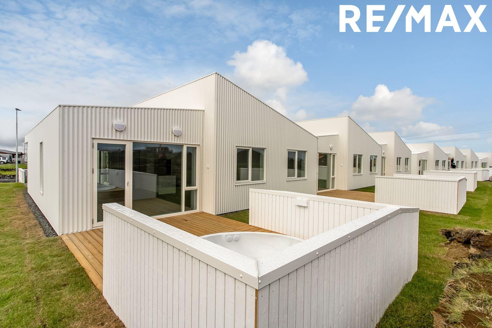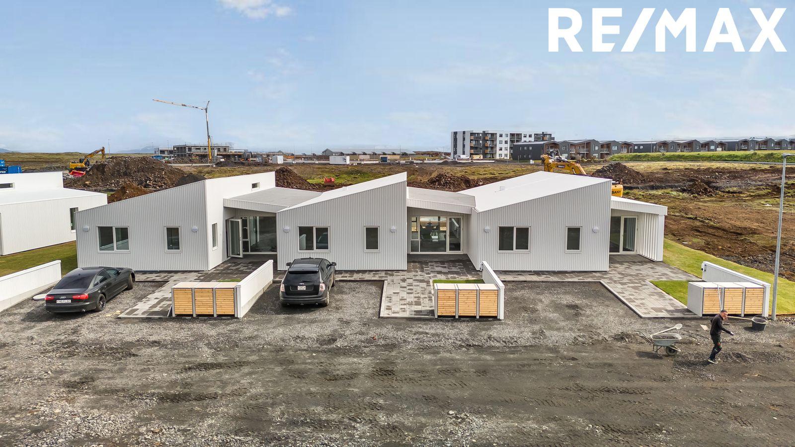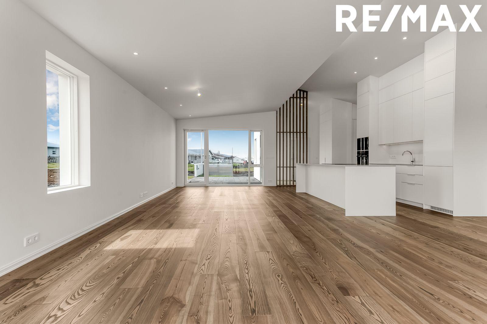 Nánari lýsing eignar: Forstofa: Er með flísum á gólfum og rúmgóðum fataskápum. Stofa og borðstofa er í opnu alrými með eldhúsi, rúmgóð stofa með útgengi á sólpall sem klæddur er með fallegu lerki, búið er að koma fyrir heitum pott, lofthæð innan eignarinnar á hæsta punkt eru um fjórir metrar og setur það mikinn svip á stofuna. Innfelld lýsing þar sem á við. Eldhús: er opið við stofu. Eldhúsinnrétting er hvít melamine með ljósri Quartz borðplötu. Með hverri íbúð fylgir span helluborð með gufugleypi, bakarofn, örbylguofn, innbyggð uppþvottavél og ísskápur með frysti. Svefnherbergi eru fjögur talsins þeim fylgja fataskápar í sama lit og efni og er á eldhúsinnréttingu. Parket á gólfum. Baðherbergi: Er flísalagt í hólf og gólf með 60x60 flísum, upphengt salerni, sturtuklefi og innrétting við vask með ljúflokun á skúffum, tengi fyrir þvottavél og þurrkara. Þvottahús / Geymsla er með flísum á gólfi, innrétting með tengi fyrir þvottavél og þurrkara.