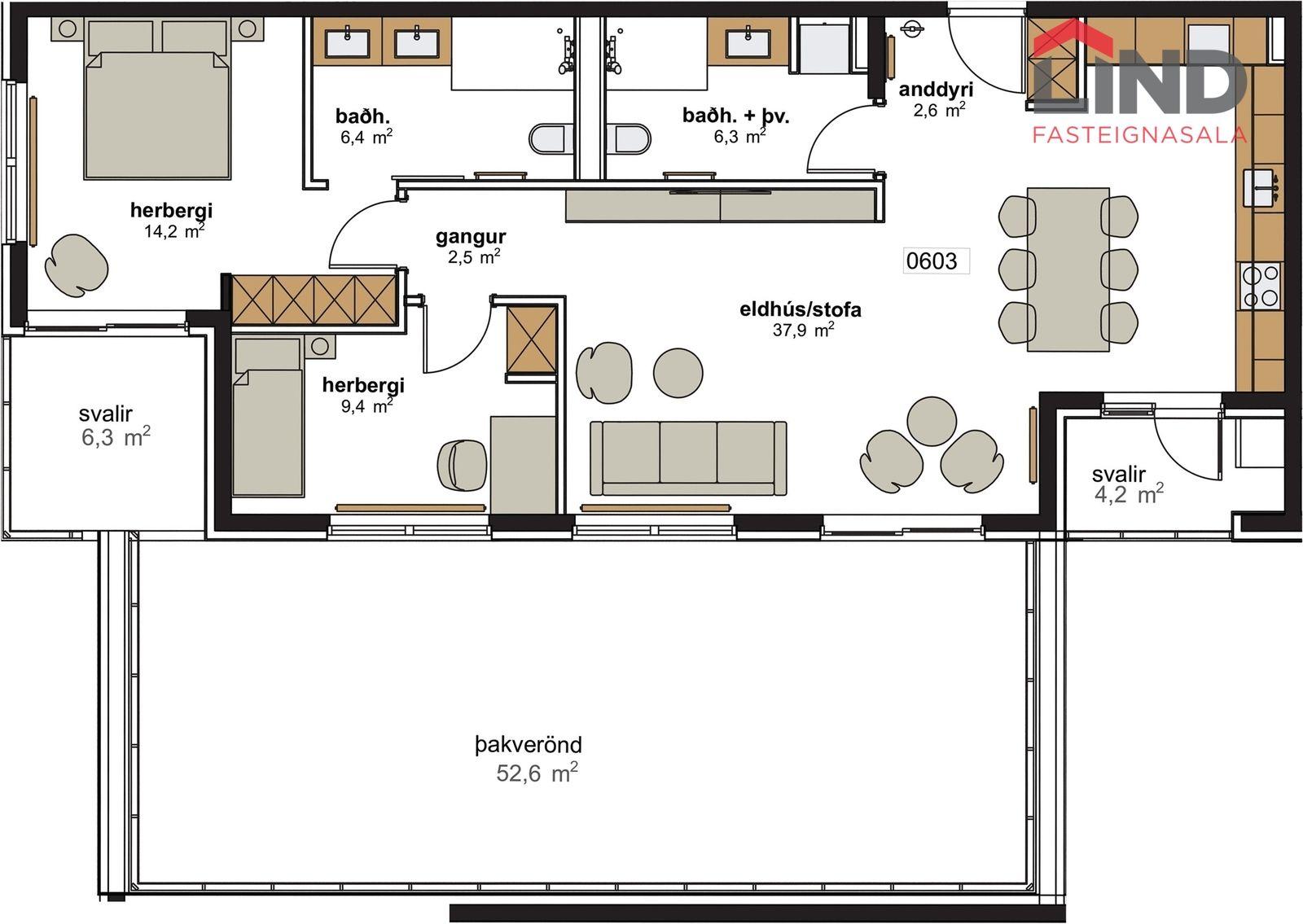 ***Íbúð 603 er þriggja herbergja með bílastæði í kjallara. Rúmgóðum þaksvölum & tveimur baðherbergjum.