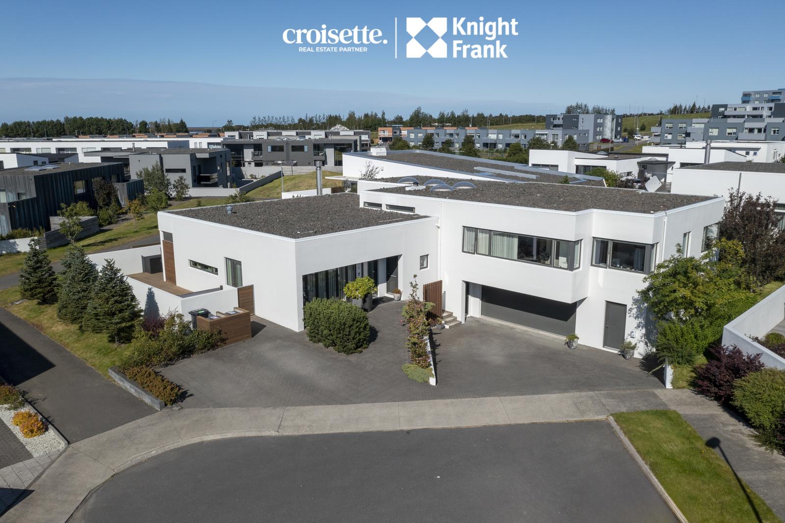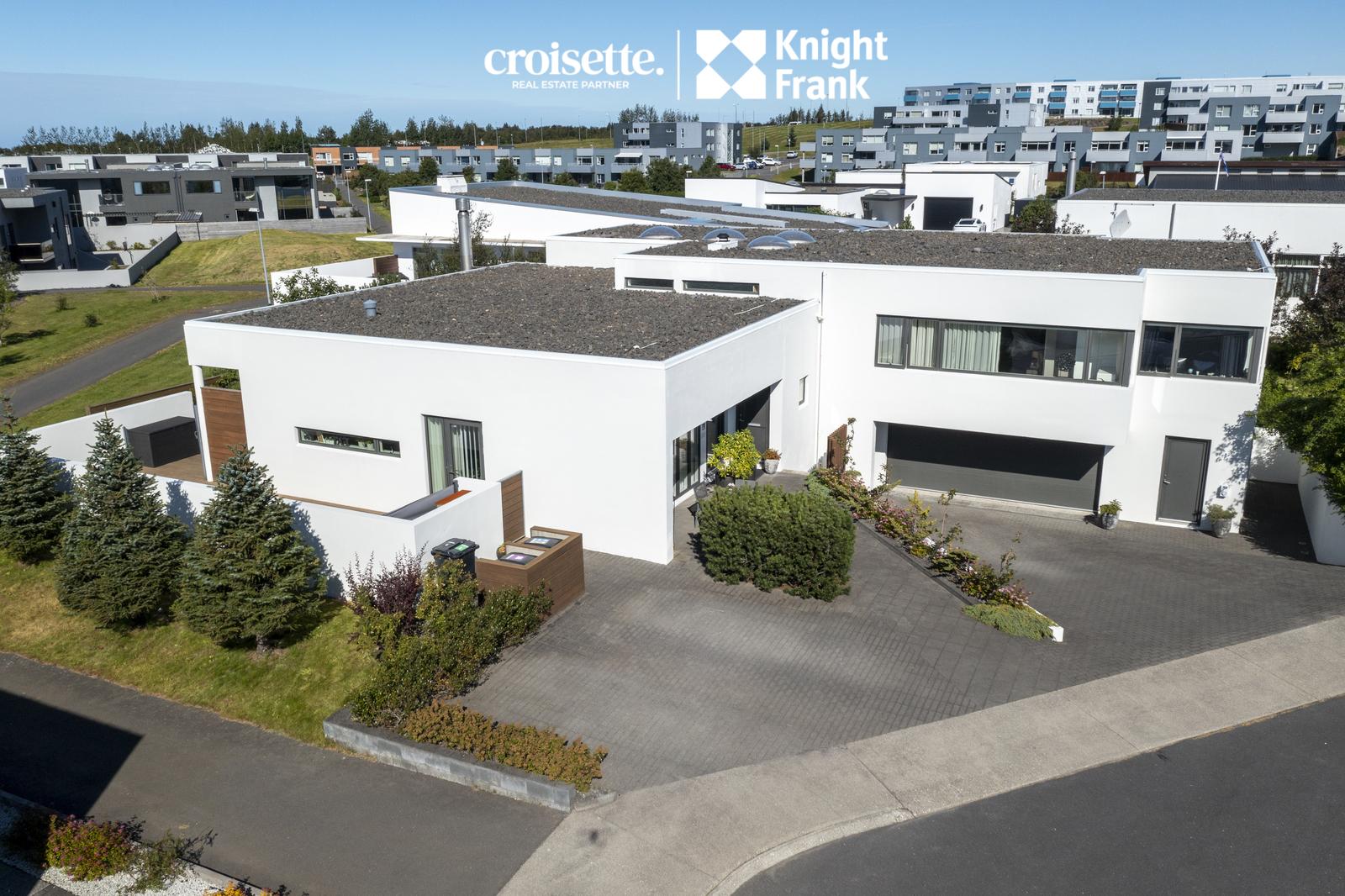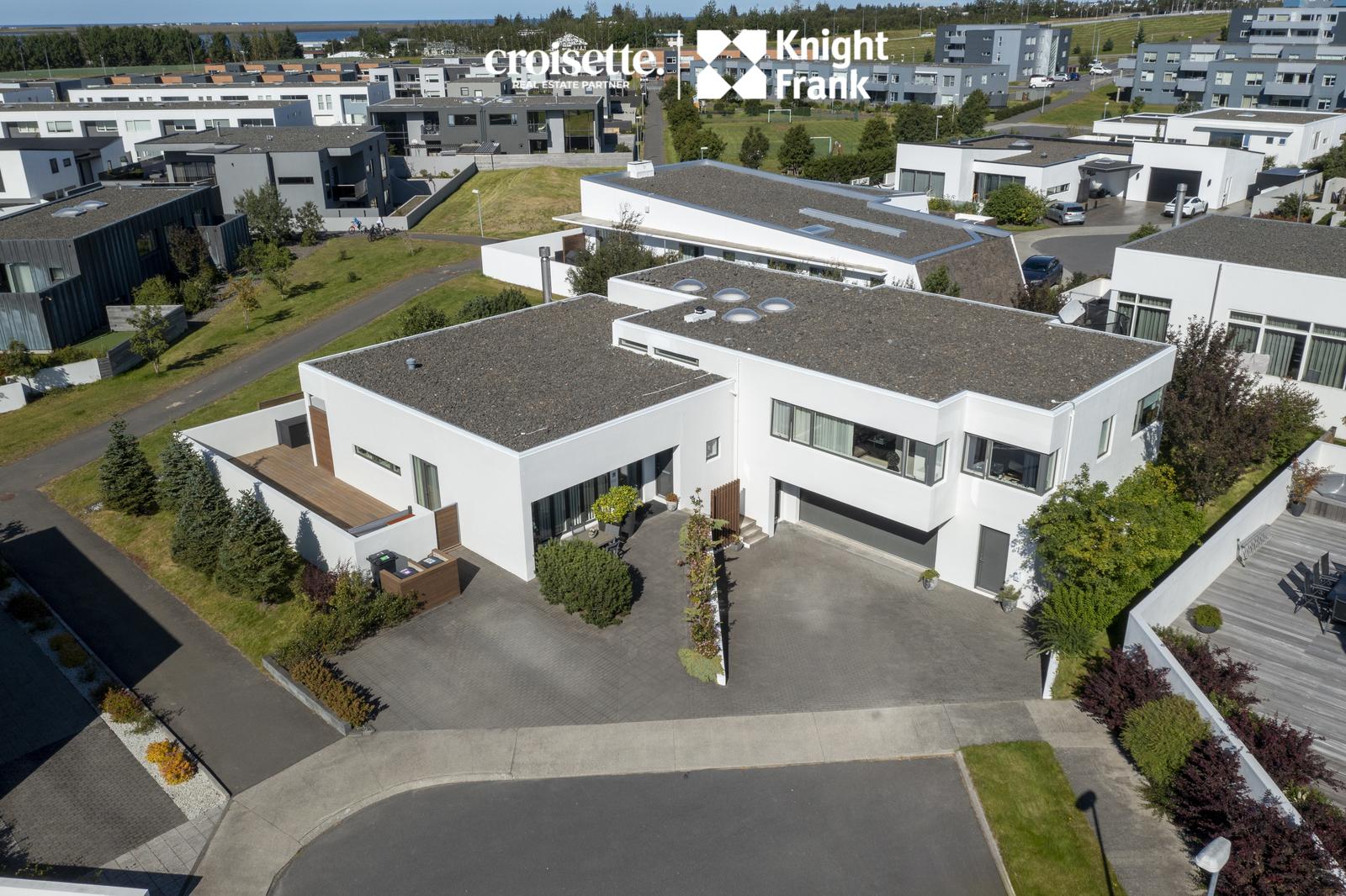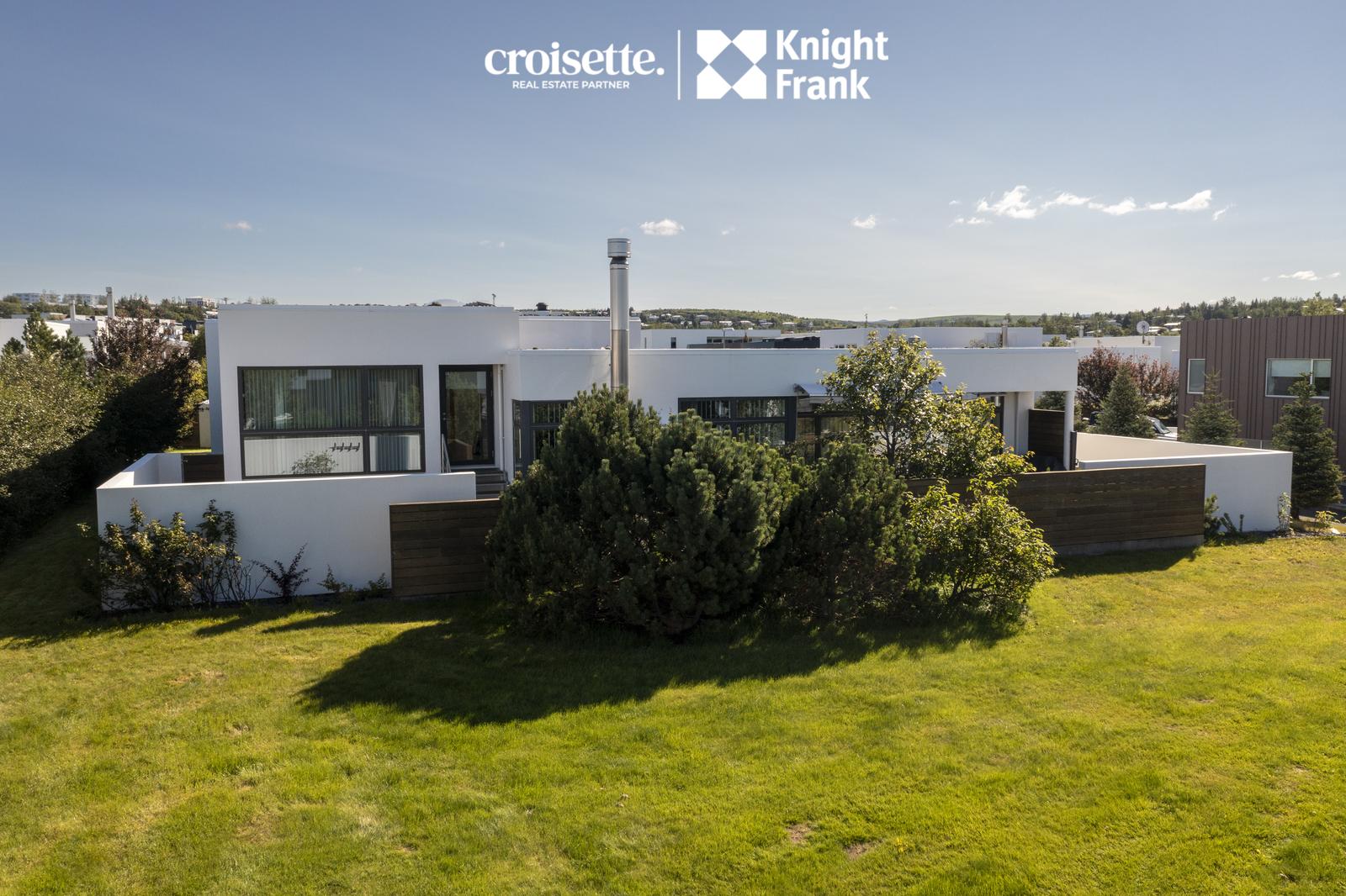 CROISETTE - KNIGHT FRANK kynnir í einkasölu einstaklega fallegt og vel staðsett einbýlishús á þremur pöllum með aukinni lofthæð. Eignin er skráð 395 fm en að auki er 60 fm tómstundaherbergi sem er ekki skráð inní heildarfermetratölu. Í skráðum fermetrum er svo 71, 9 fm innbyggð bílageymsla, vínkjallari og hjólageymsla. Staðsett innst í botnlanga í rólegu og fjölskylduvænu umhverfi í Akrahverfinu, Garðabæ. Eignin skiptist í fjögur svefnherbergi, þrjár stofur, þrjú baðherbergi, eldhús, tómstundarherbergi og bílageymslu. Fullfrágenginn fallegur skjólsæll garður með sólpalli og heitum potti. Sigurður Hallgrímsson hannaði húsið og Guðbjörg Magnúsdóttir sá um innanhúshönnun. Húsið er á frábærum stað, stutt í skóla, leikvelli og verslanir. Allar nánari upplýsingar veitir Karl Lúðvíksson Lfs í S: 663-6700 eða kalli@croisette.is