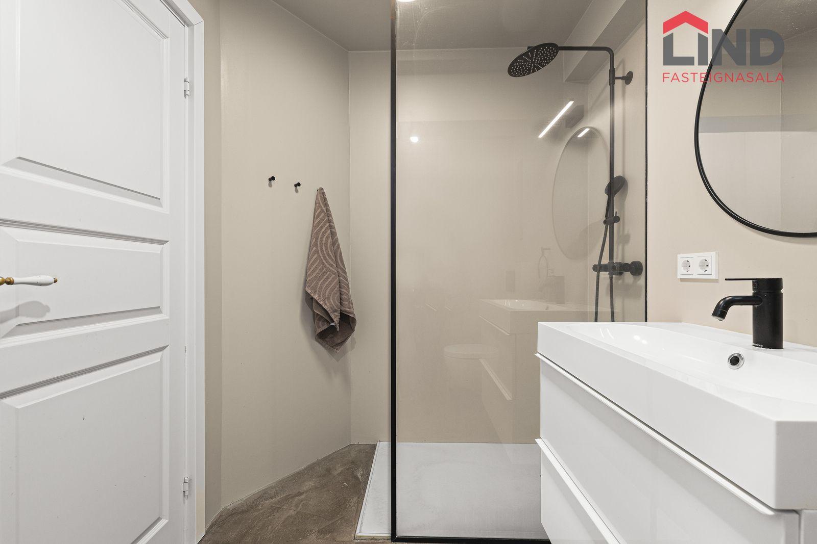 Baðherbergi: Flotað gólf, gólfhiti, hvít innrétting, sturta með gleri og nýleg tæki, þ.e. upphengt salerni, vaskur og blöndunartæki.