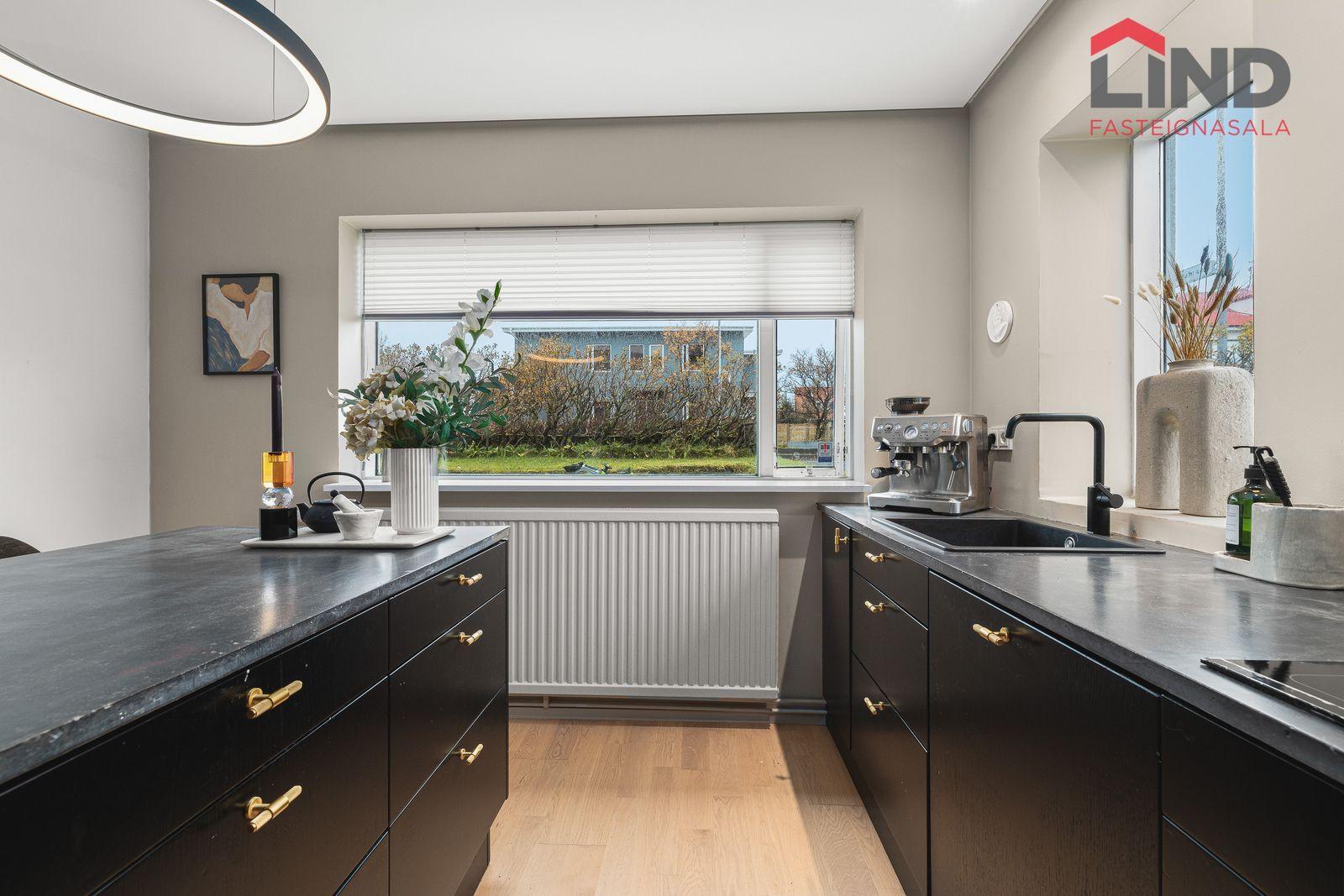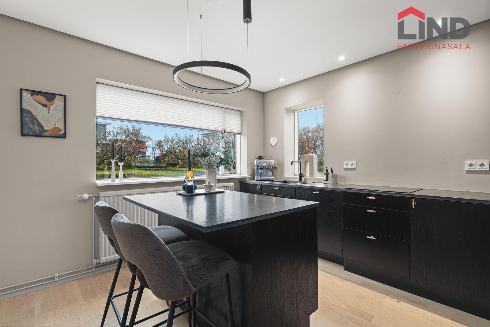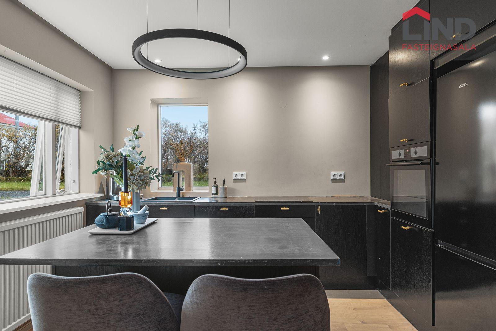 Eldhús: Svört innrétting með miklu skápaplássi og nýlegri borðplötu, nýleg eldhústæki, innbyggð uppþvottavél, spanhelluborð, svartur vaskur.