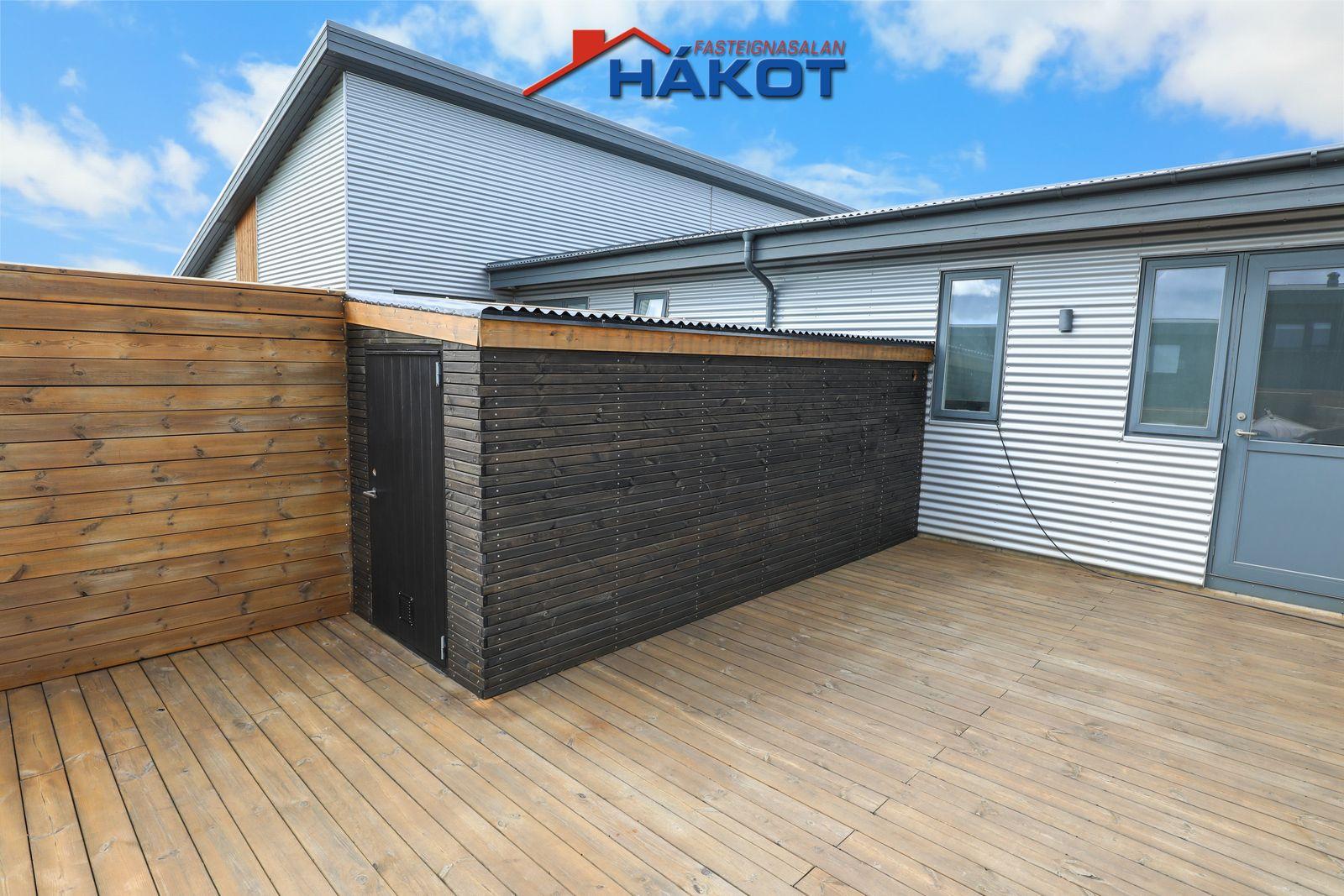 Stofa (parket, útgangur út á stóra verönd í suður, geymsluskúr).