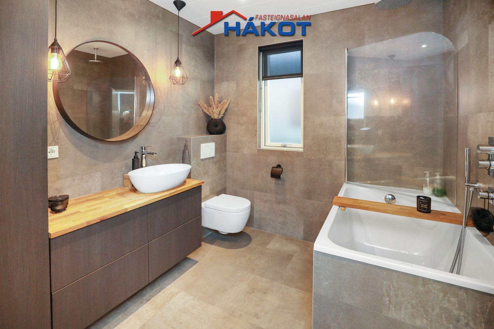 Baðherbergi (flísar, flísar á vegg, baðkar m/sturtu, handklæðaofn, innrétting, handklæðaofn).