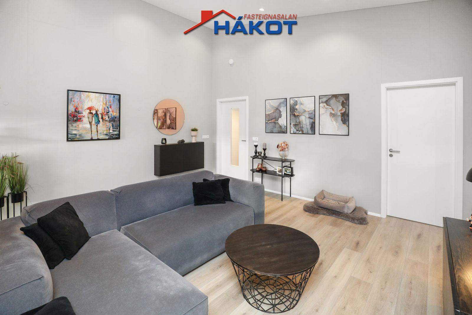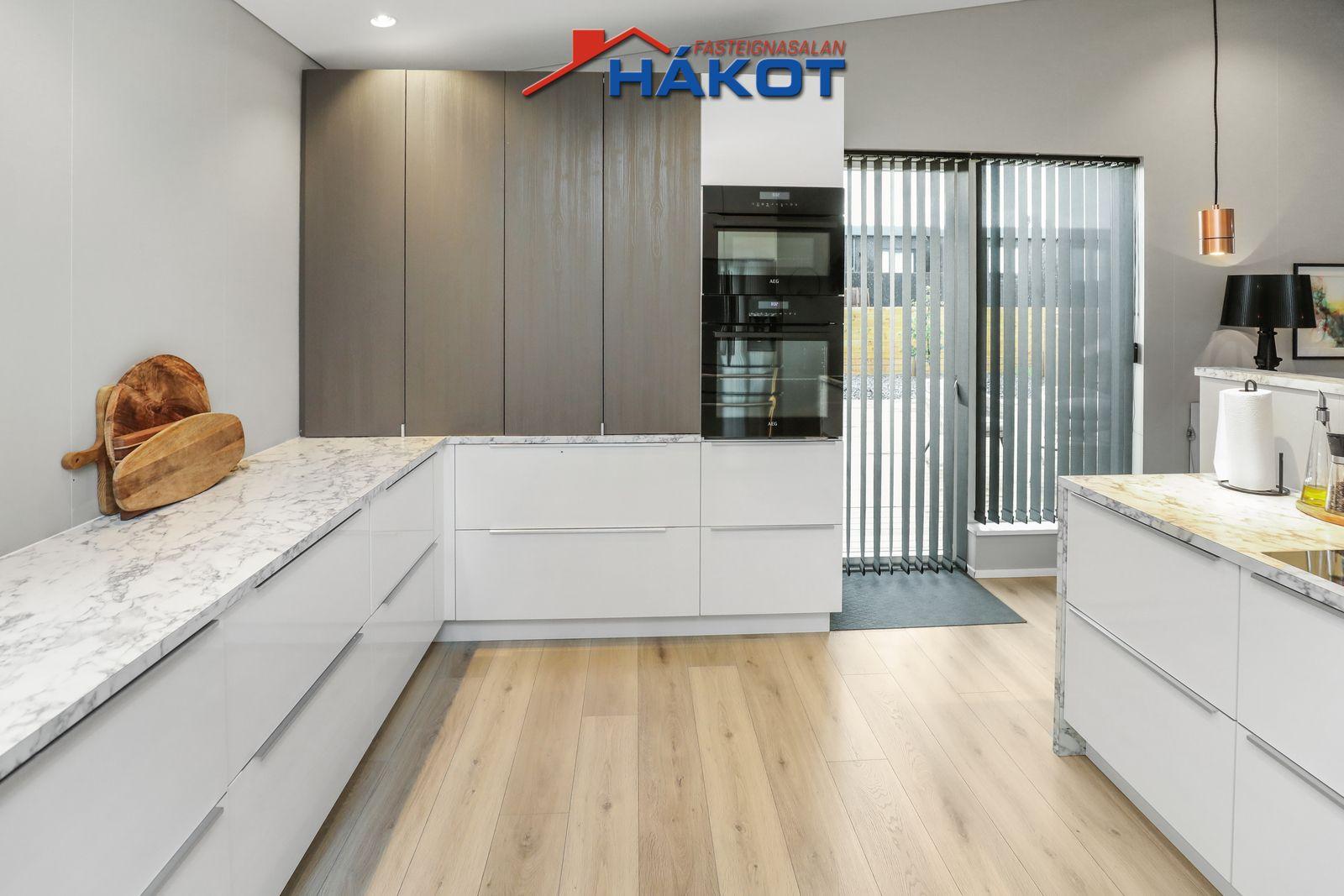 Eldhús (parket, flísar, grá/hvít innrétting, lítil eyja, helluborð, ofn, uppþvóttavél, opið að stofu).