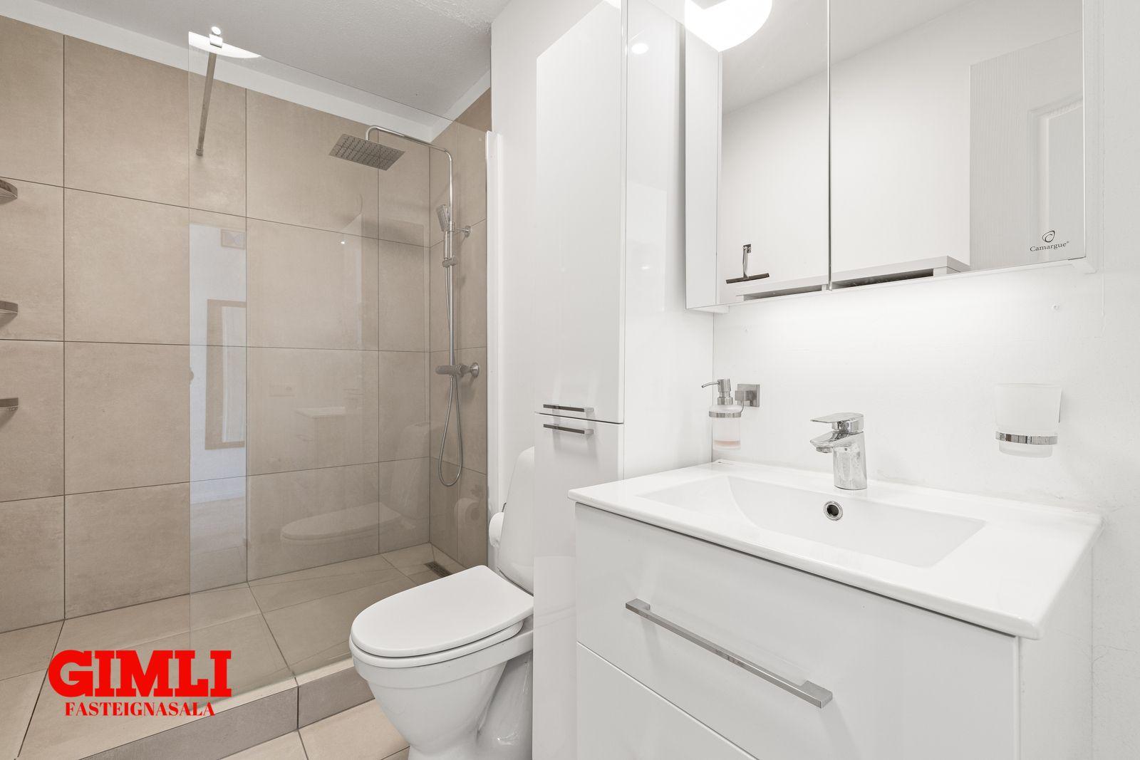 Baðherbergi: allt endurnýjað, flísar á gólfi, stór Walk-In-sturta, vaskur í innréttingu, speglaskápur fyrir ofan og skápur til hliðar. Hitalagnir í gólfi virkar nánast eins og gólfhiti.
