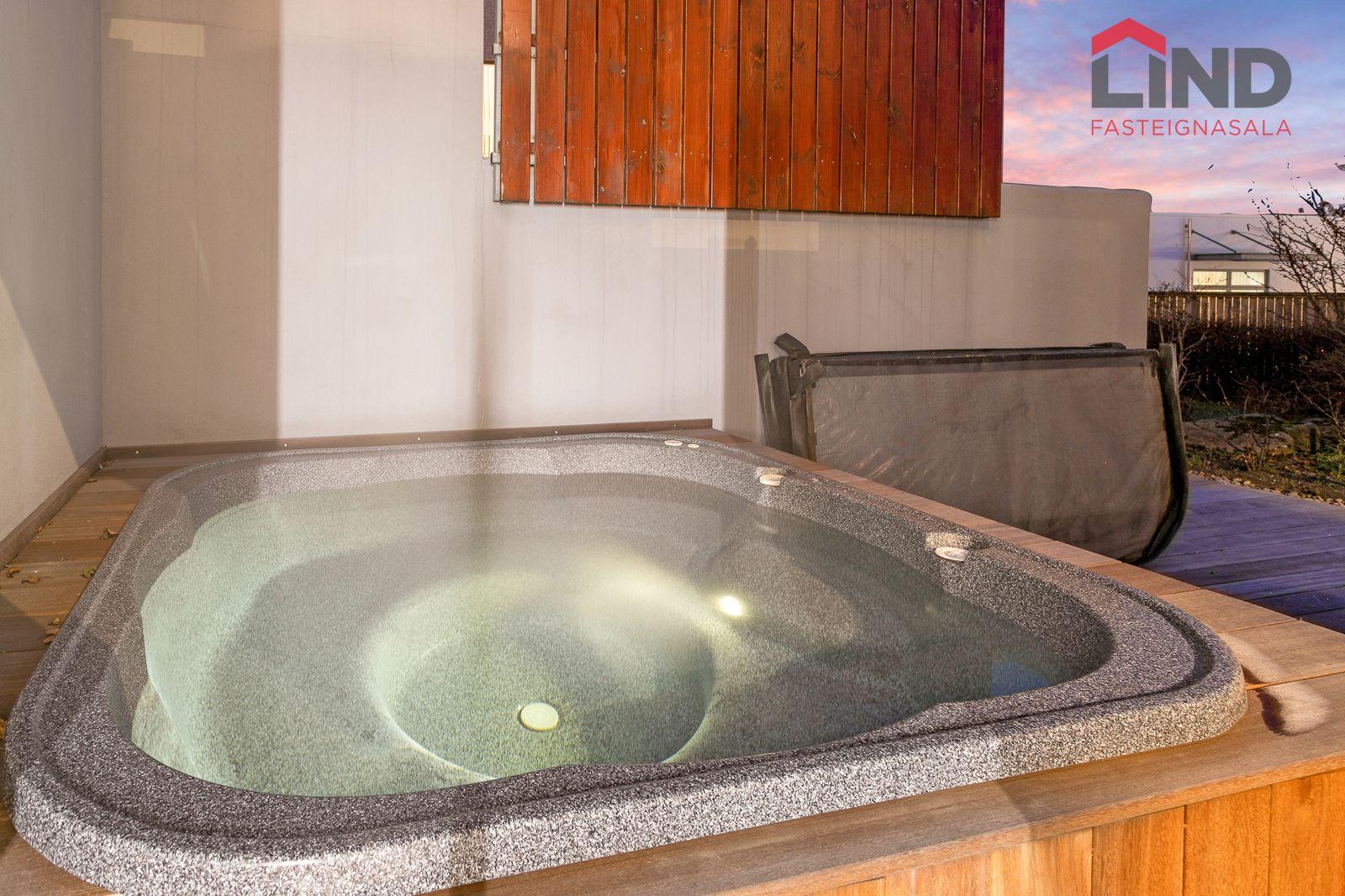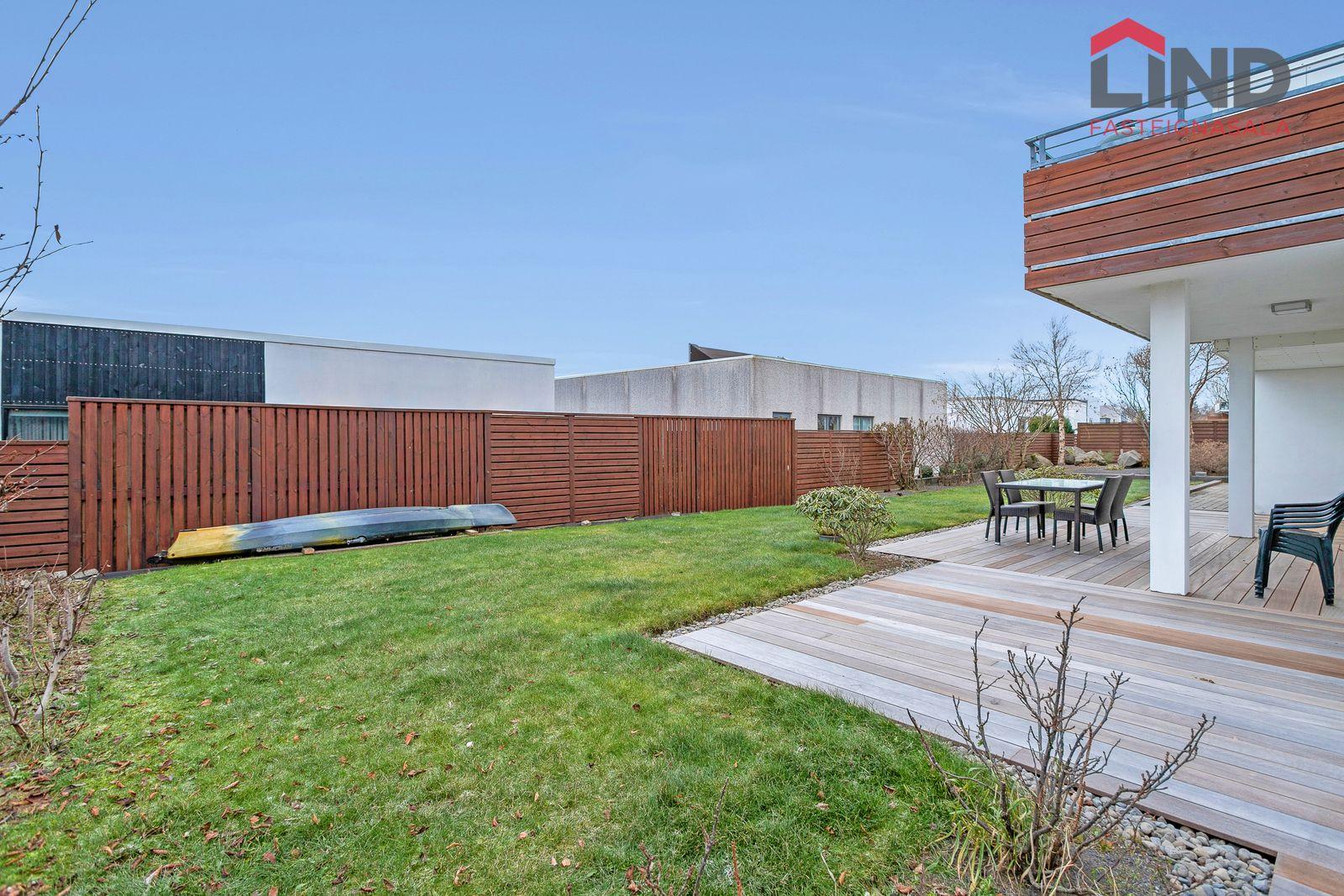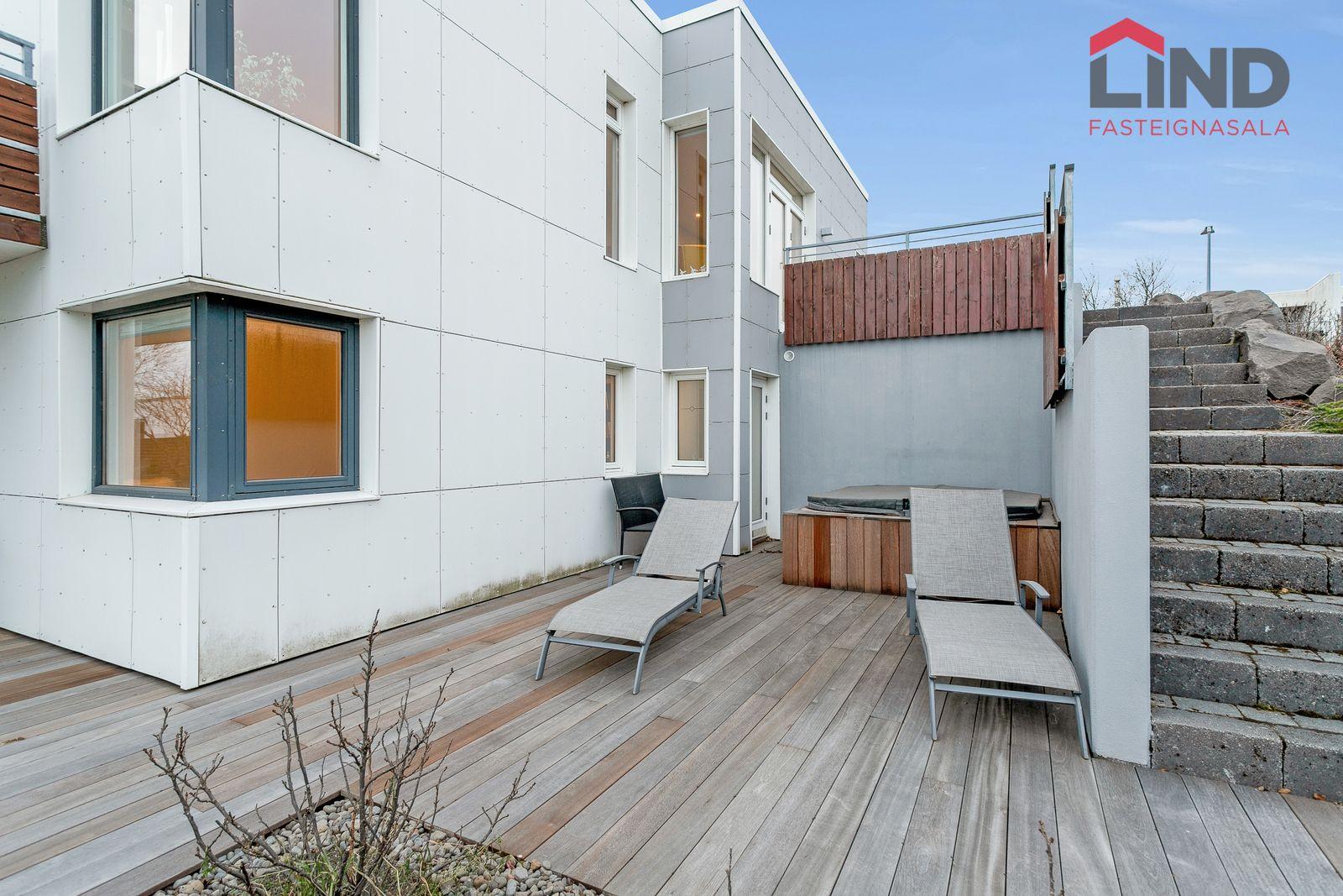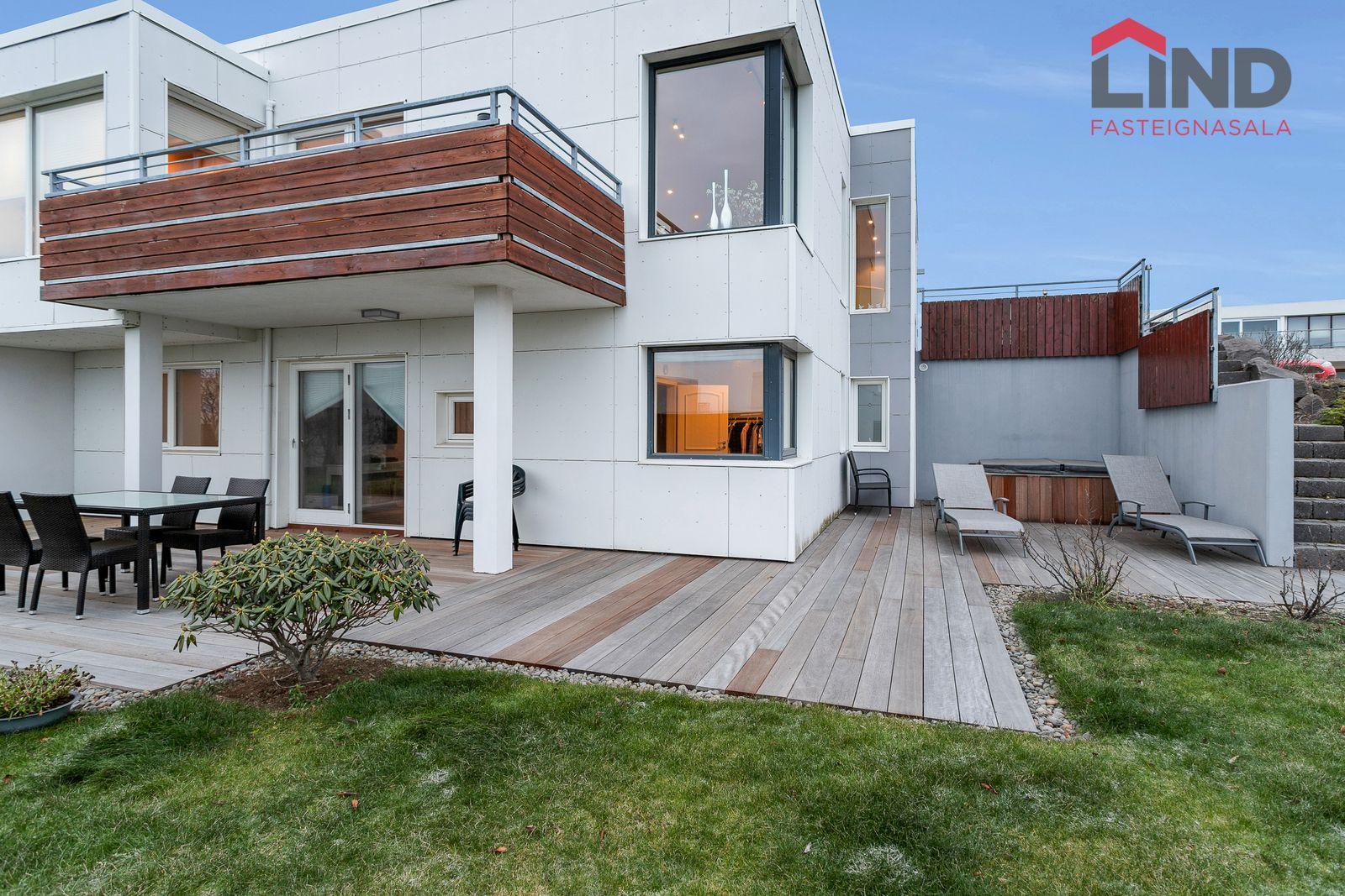Lóð: Stæði hellulagt með hitalögn. Harðviðarpallur með heitum potti og grasflöt.
